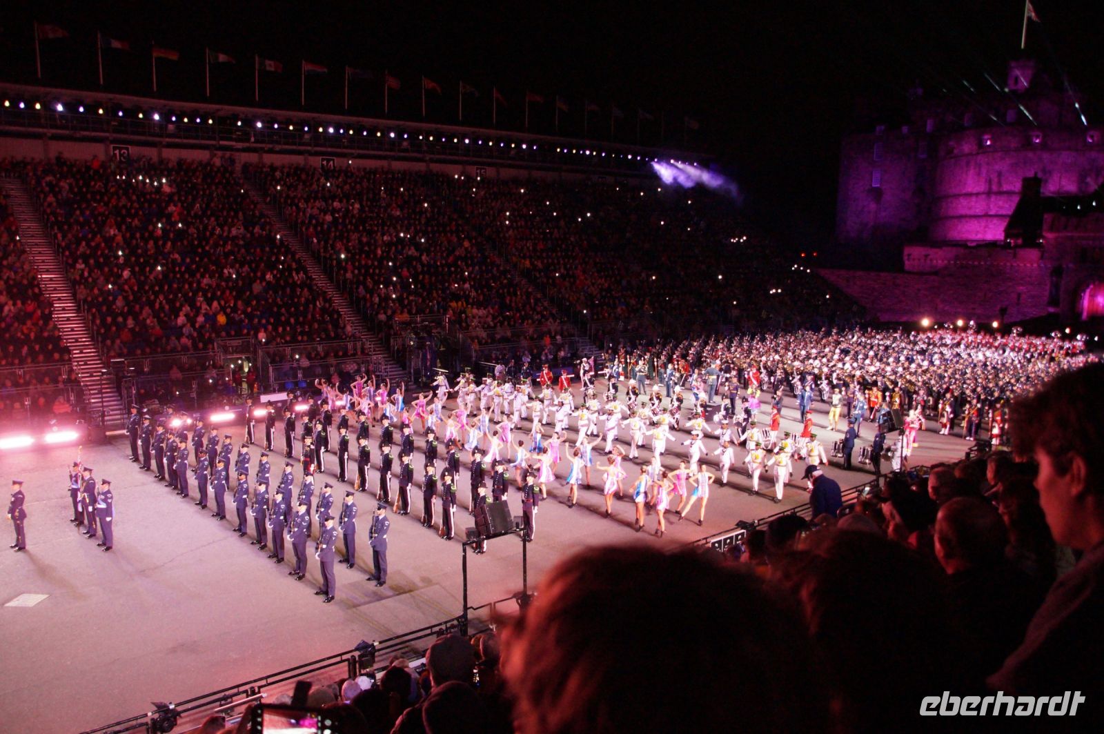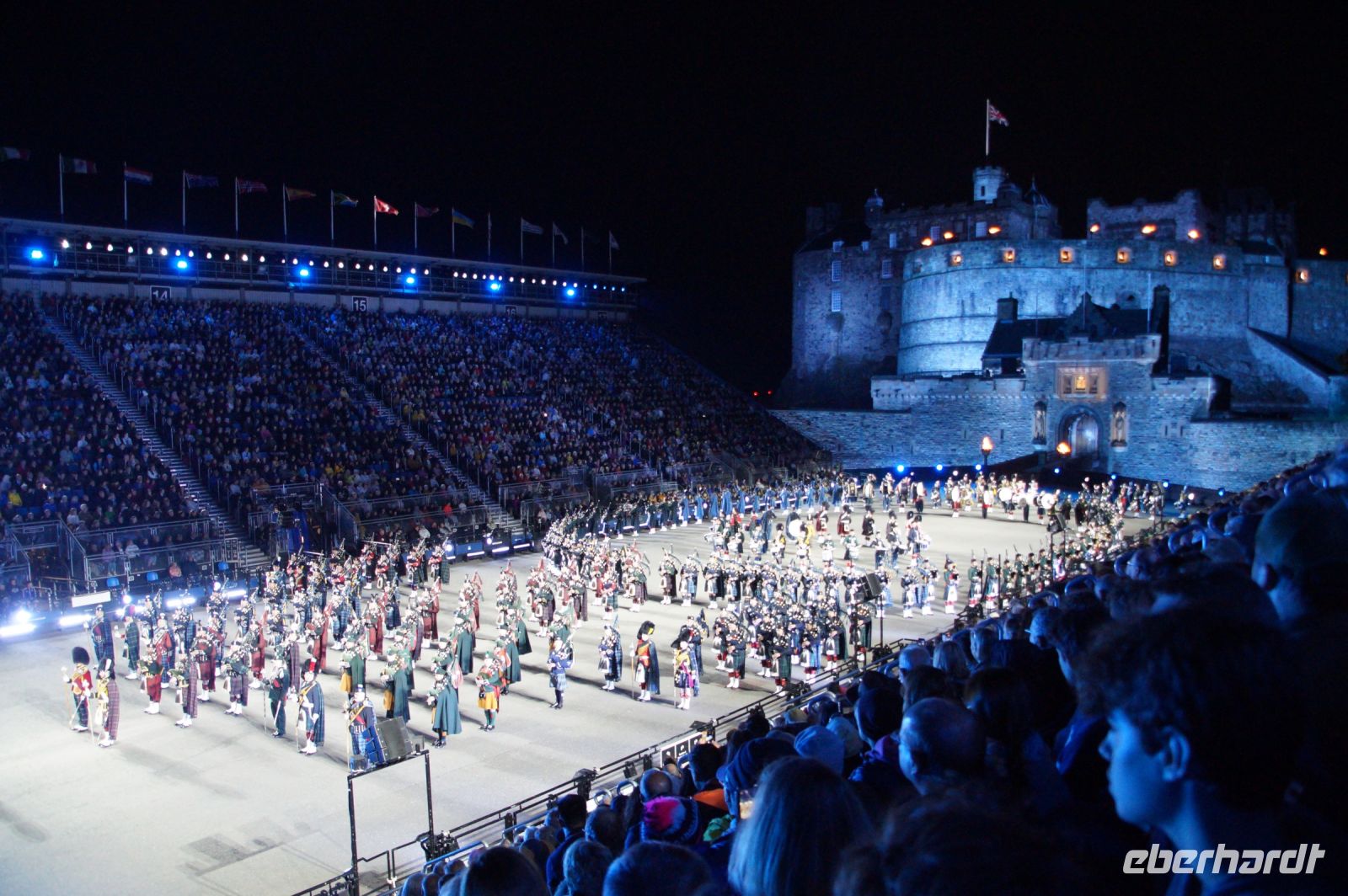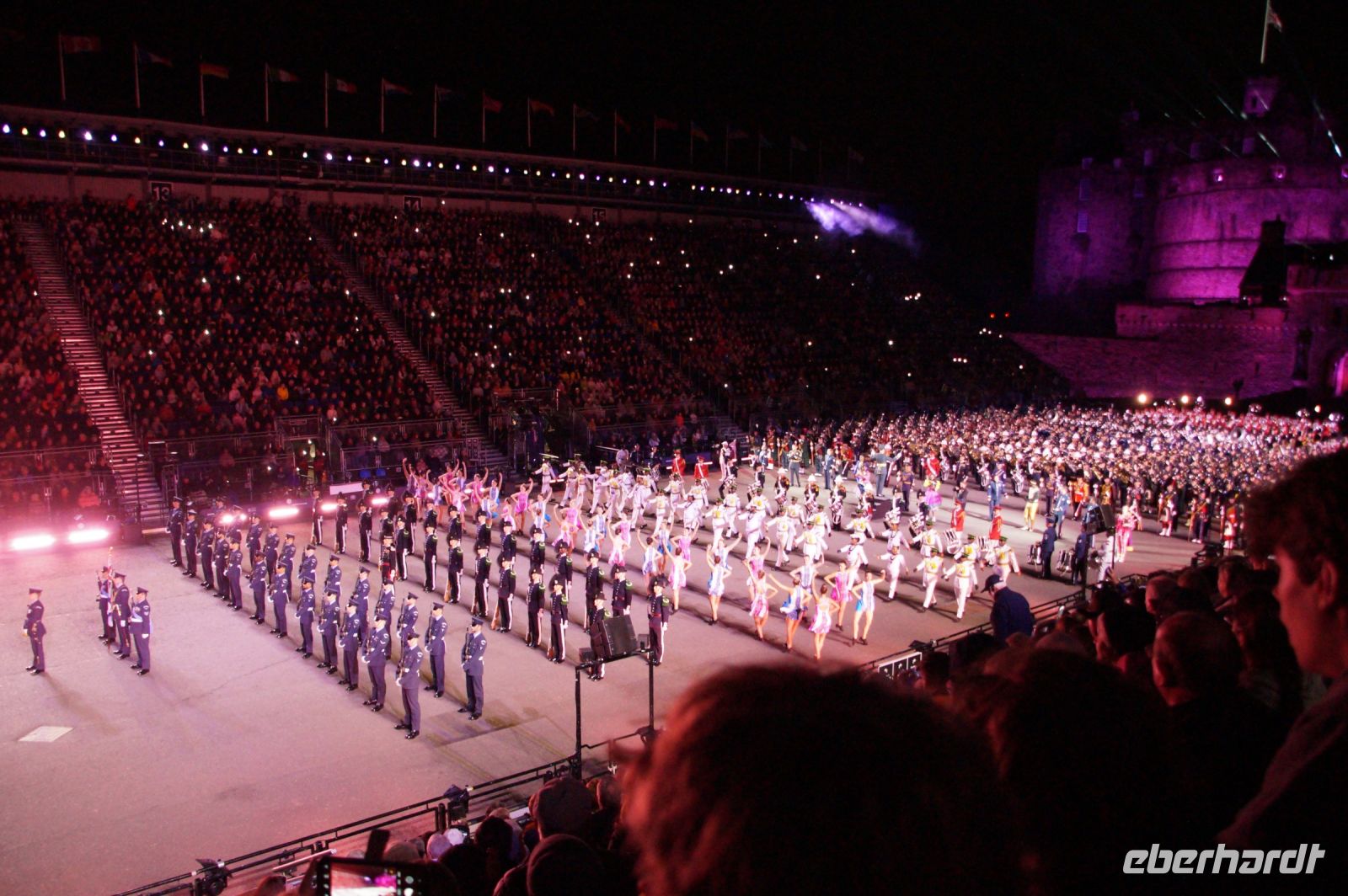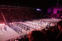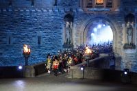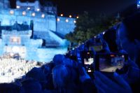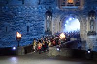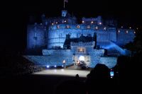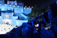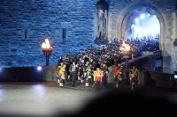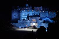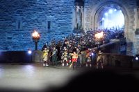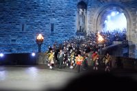 Nach dem Abendessen im Pub, in dem auch eine Hochzeit gefeiert wurde (allerdings im Saal über uns) - natürlich schottisch, erneut standesgemäß, mit den Herren im Kilt - liefen wir gemeinsam zum Edinburgh Castle hoch, ließen unsere Rucksäcke nach verbotenen Mitbringseln checken und stellten uns in die Schlange. Obwohl alles ein Durcheinander schien und hier schon hunderte warteten, ging es zügig hinein und auf die Tribüne. Gut, dass wir alle einen Pullover dabei hatten, denn auf dem Burgberg wird es nach Sonnenuntergang schon ein wenig frisch.