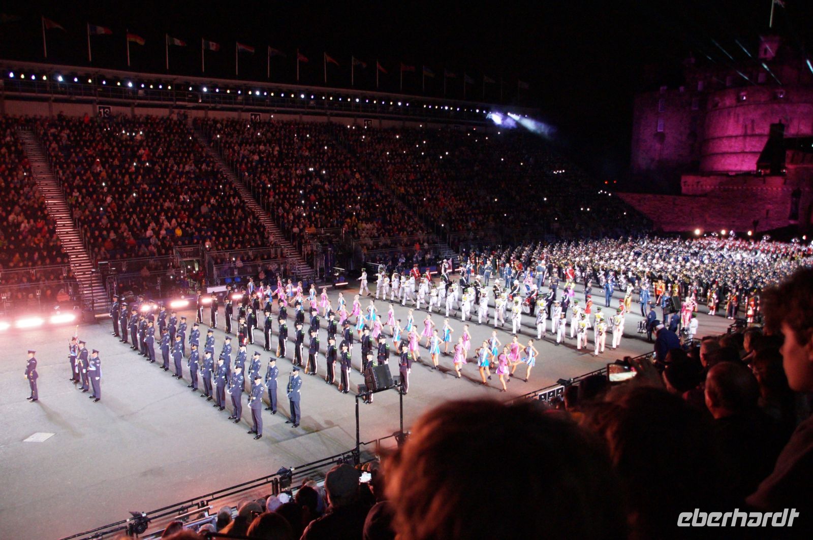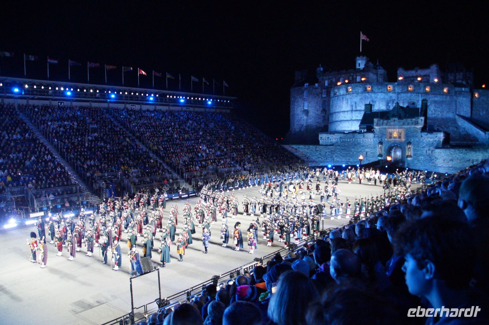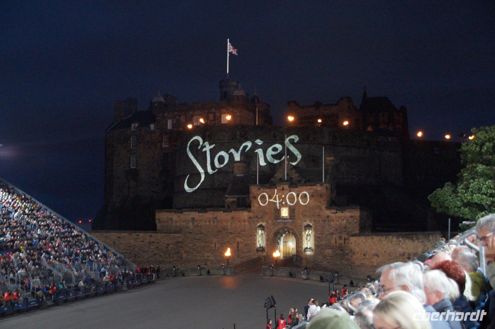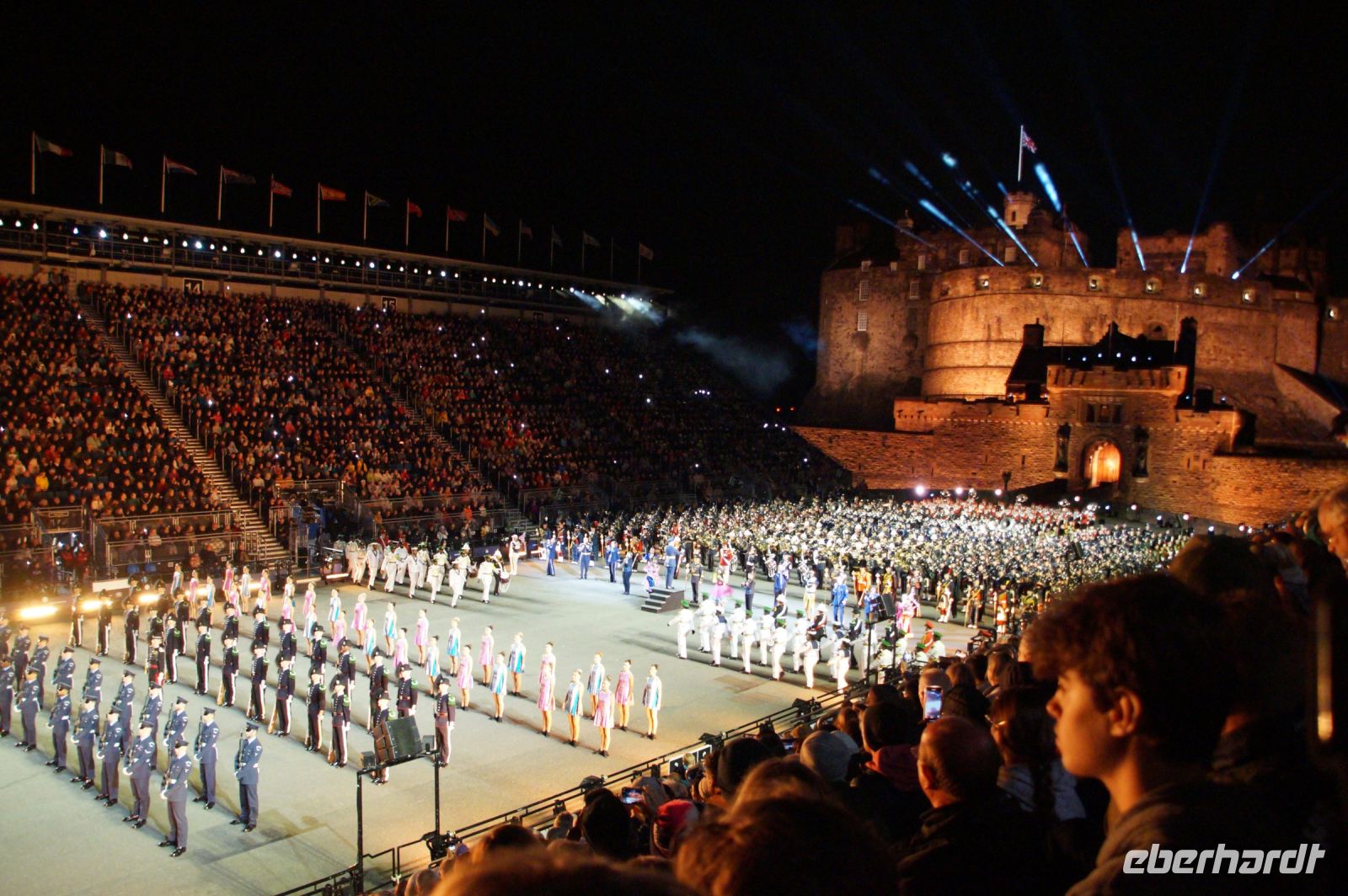 Nach dem Abendessen im Pub, in dem auch eine Hochzeit gefeiert wurde (allerdings im Saal über uns) - natürlich schottisch, erneut standesgemäß, mit den Herren im Kilt - liefen wir gemeinsam zum Edinburgh Castle hoch, ließen unsere Rucksäcke nach verbotenen Mitbringseln checken und stellten uns in die Schlange. Obwohl alles ein Durcheinander schien und hier schon hunderte warteten, ging es zügig hinein und auf die Tribüne. Gut, dass wir alle einen Pullover dabei hatten, denn auf dem Burgberg wird es nach Sonnenuntergang schon ein wenig frisch.