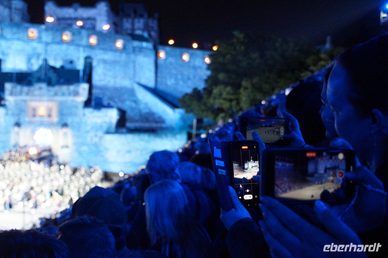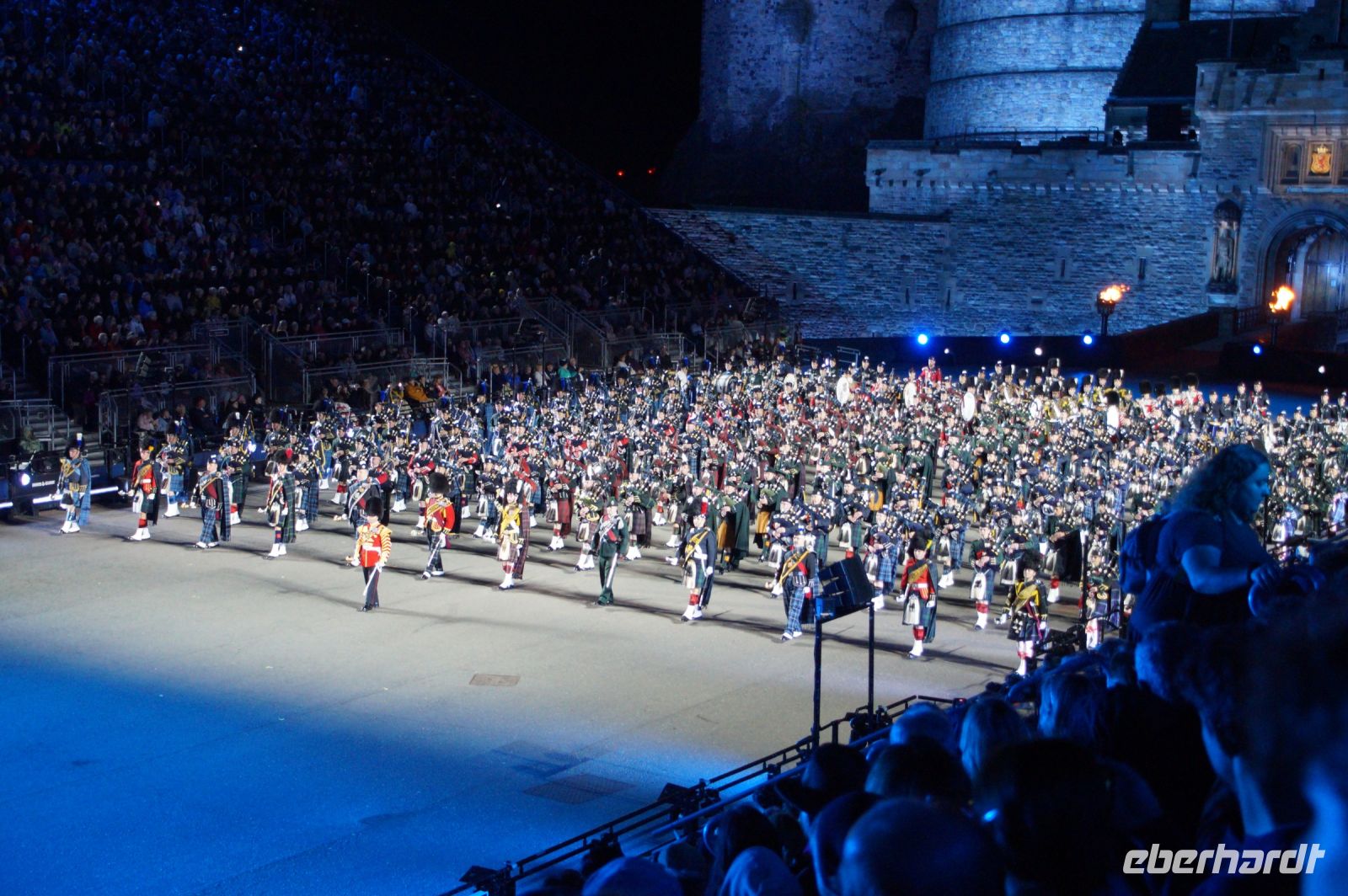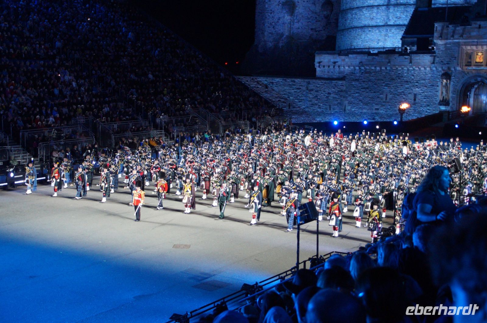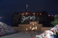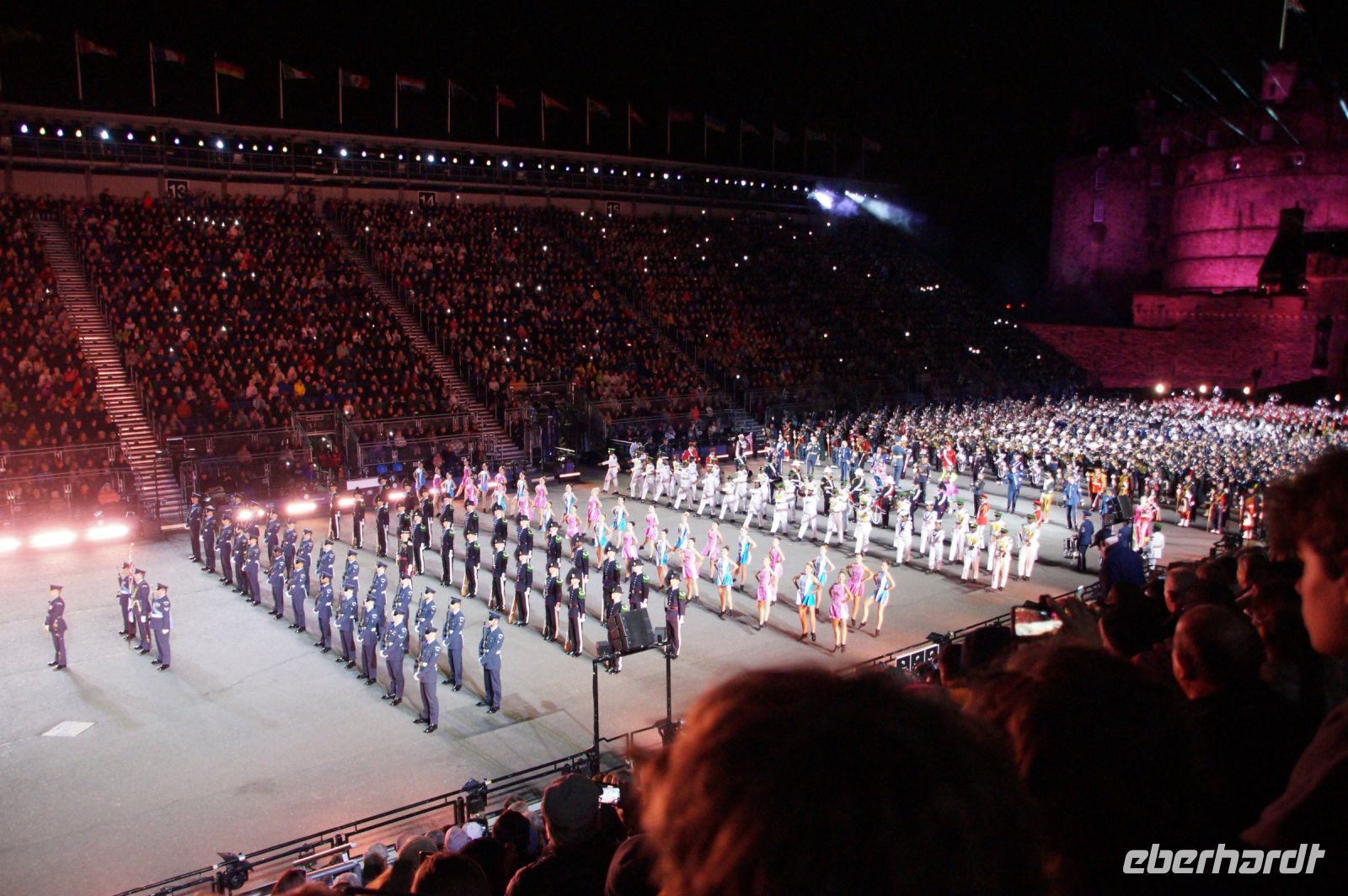Nach dem Abendessen im Pub, in dem auch eine Hochzeit gefeiert wurde (allerdings im Saal über uns) - natürlich schottisch, erneut standesgemäß, mit den Herren im Kilt - liefen wir gemeinsam zum Edinburgh Castle hoch, ließen unsere Rucksäcke nach verbotenen Mitbringseln checken und stellten uns in die Schlange. Obwohl alles ein Durcheinander schien und hier schon hunderte warteten, ging es zügig hinein und auf die Tribüne. Gut, dass wir alle einen Pullover dabei hatten, denn auf dem Burgberg wird es nach Sonnenuntergang schon ein wenig frisch.