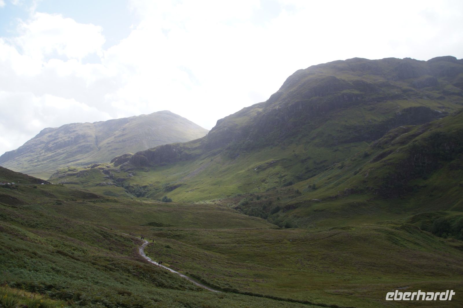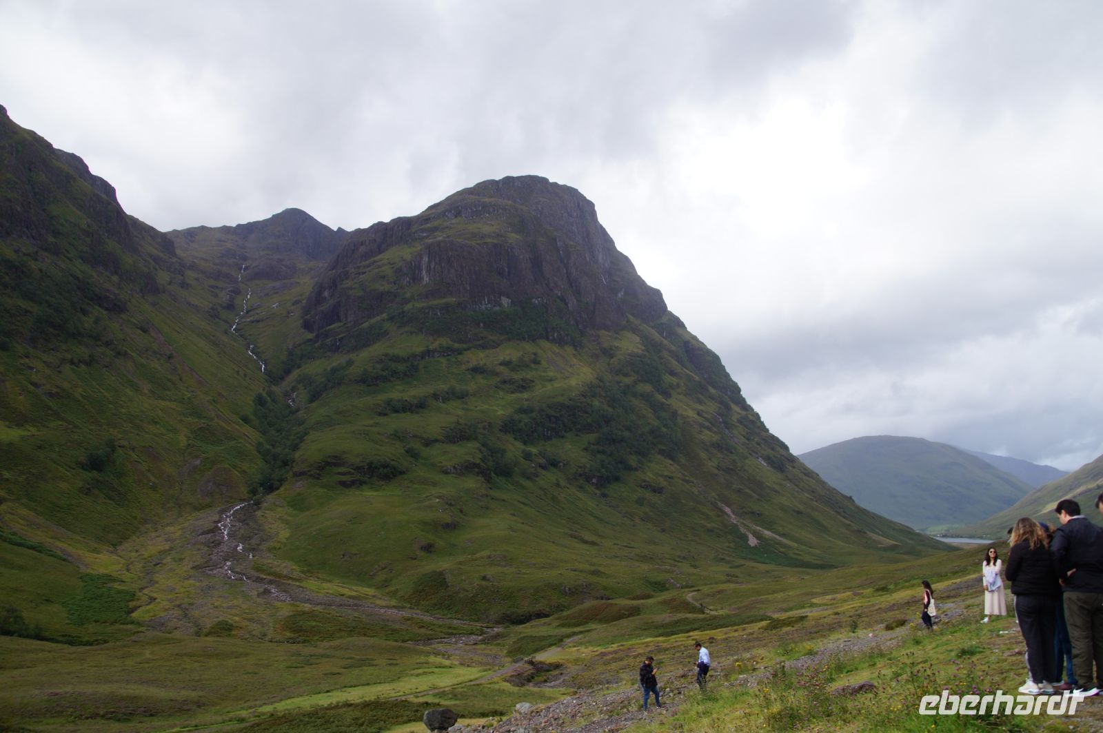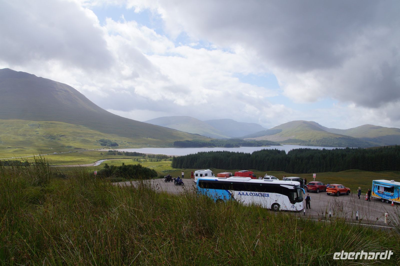 Wir hielten an einem der beiden Aussichtspunkte der Three Sisters, dreier Berge, welche die Kulisse des Glencoe ganz besonders prägen. Es war kaum Platz vor vielen Fahrzeugen und Mike und ein Busfahrerkollege von ihm meinten nur, der August sei "the silly month". Klar, im August, wenn in Edinburgh das Royal Military Tattoo und das Kleinkünstlerfestival Fringe stattfinden, fahren besonders viele Leute nach Schottland und so berühmte Orte, wie das Glencoe, die man ja auch kaum umfahren kann, sind völlig überlaufen.