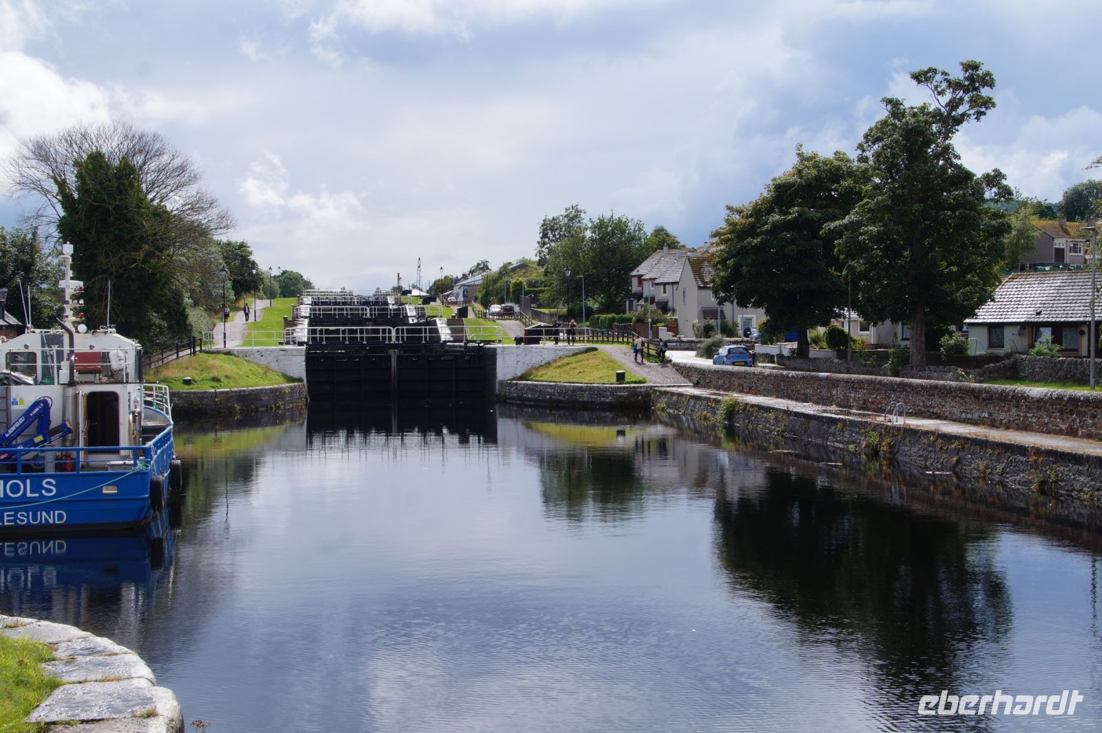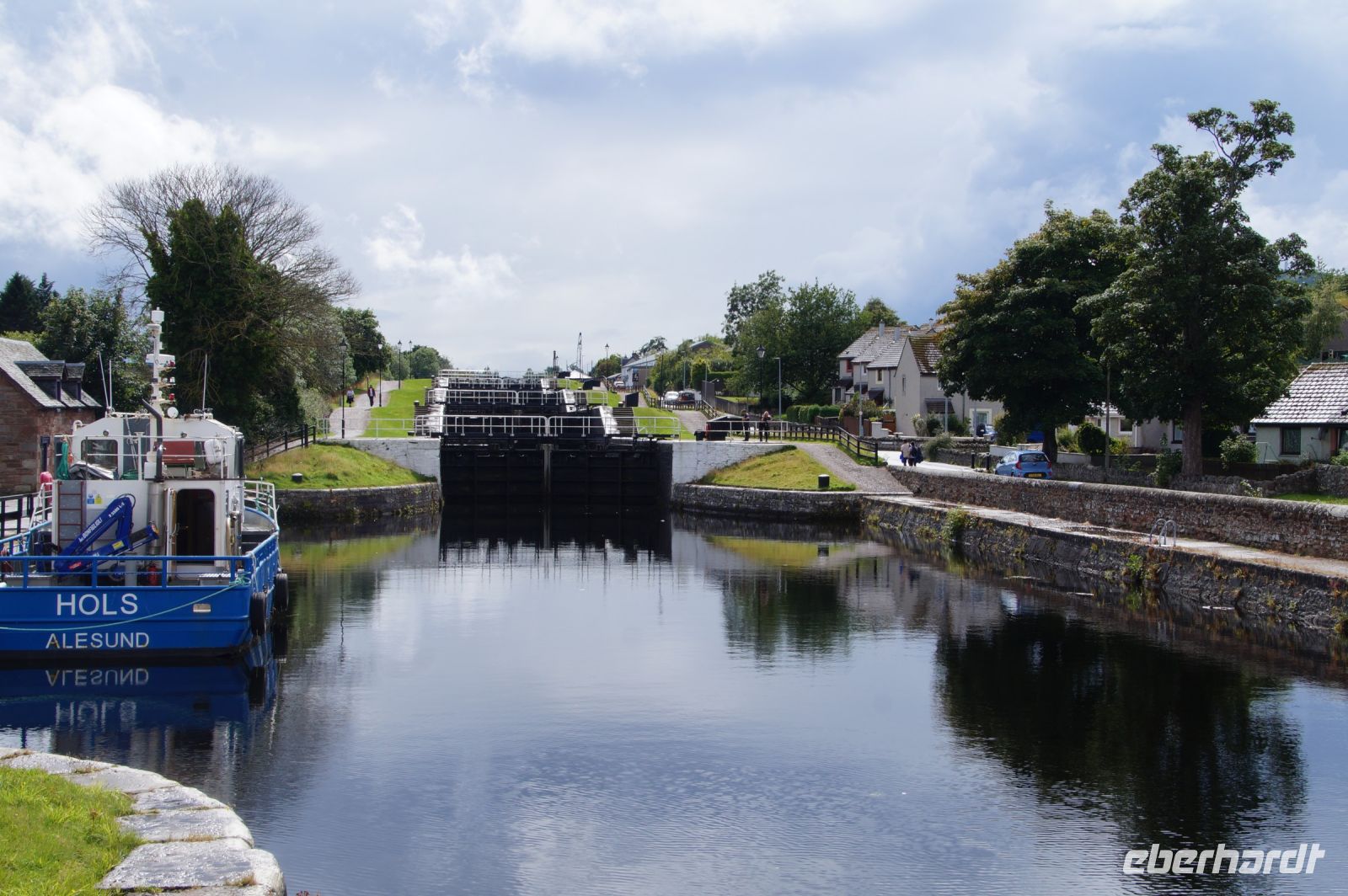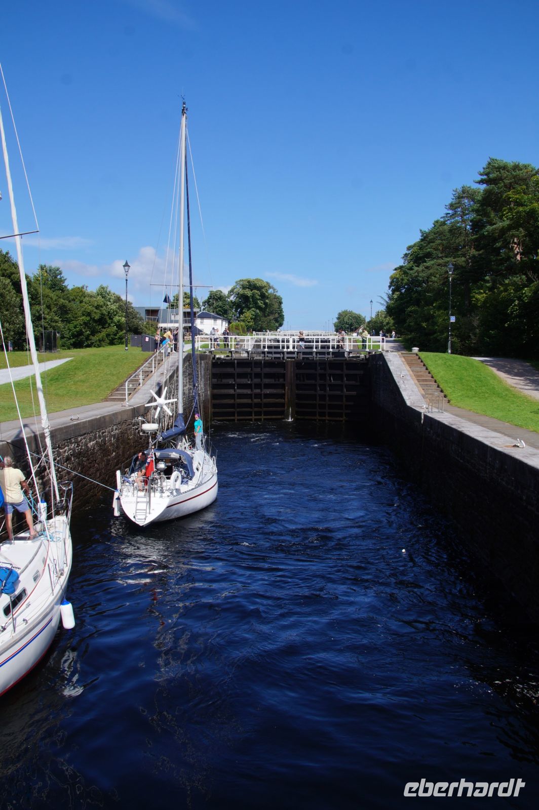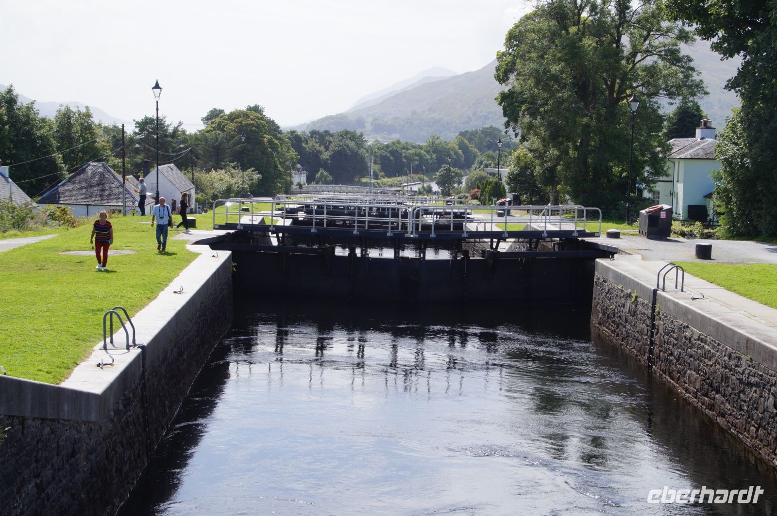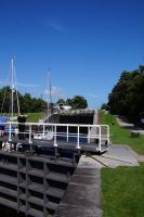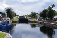 Nach einer Mittagspause in Fort William ging es weiter nach Mallaig. Erster Haltepunkt war Neptun's Staircase (Neptuns Treppenhaus), die größte Schleusentreppe in Schottland, die vom Niveau des Loch Lochy im Great Glen (Großes Tal - eine tektonische Verwerfung, welche die Highlands in einen Nord- und einen Südteil teilt) auf das Meeresspiegelniveau von Loch Linnhe absenkt. Das Great Glen wird seit den 1820er Jahren als Verehrsader genutzt, um Schiffsumrundungen Schottlands zu vermeiden - die dauerten lang und waren gefährlich - baute man unter Leitung von Thomas Telford den kaledonischen Kanal, der in Inverness beginnt und in Banavie mit den Banavie Locks (so der offizielle Name von Neptuns Treppenhaus) endet. Thomas Telford ist einer der wichtigsten Ingenieure in den Highlands in den Jahren nach 1800. Gefühlt wurde jede Brücke, jede Schleuse, jeder Kai und jeder Kanal dort von ihm errichtet.