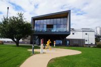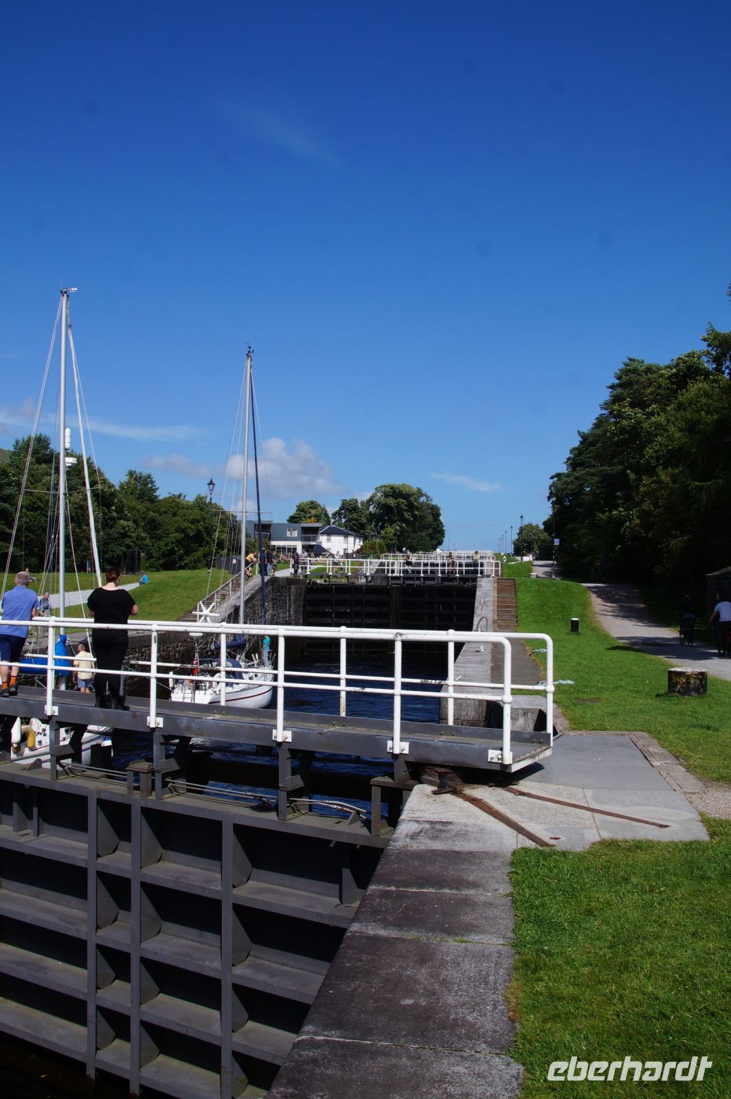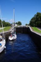 Jetzt hieß es, schnell rechnen und überlegen, was man alternativ machen könne. nach Stirling kam man nicht hinein, Doune Castle war ja schon der Ersatz für Stirling Castle, wegen des Radrennens. "Mike, schaffen wir das zum Falkirk Wheel, und wie lange brauchen wir vom Falkirk Wheel nach Balloch?" - Mikes Antworten fielen so aus, dass ich entschied, zum Falkirk Wheel zu fahren. Das Falkirk Wheel (Rad von Falkirk) ist eine Schleusenanlage, die Boote in einer einzigen Schleusung 24 m hebt oder absenkt. und zwar gleichzeitig. Wie es eine Mitreisende ausdrückte (und sie gab mir die Erlaubnis, das zu plagiieren): ein Paternoster für Boote. Hier konnten wir die Hebung und Schleusung einiger Boote beobachten.