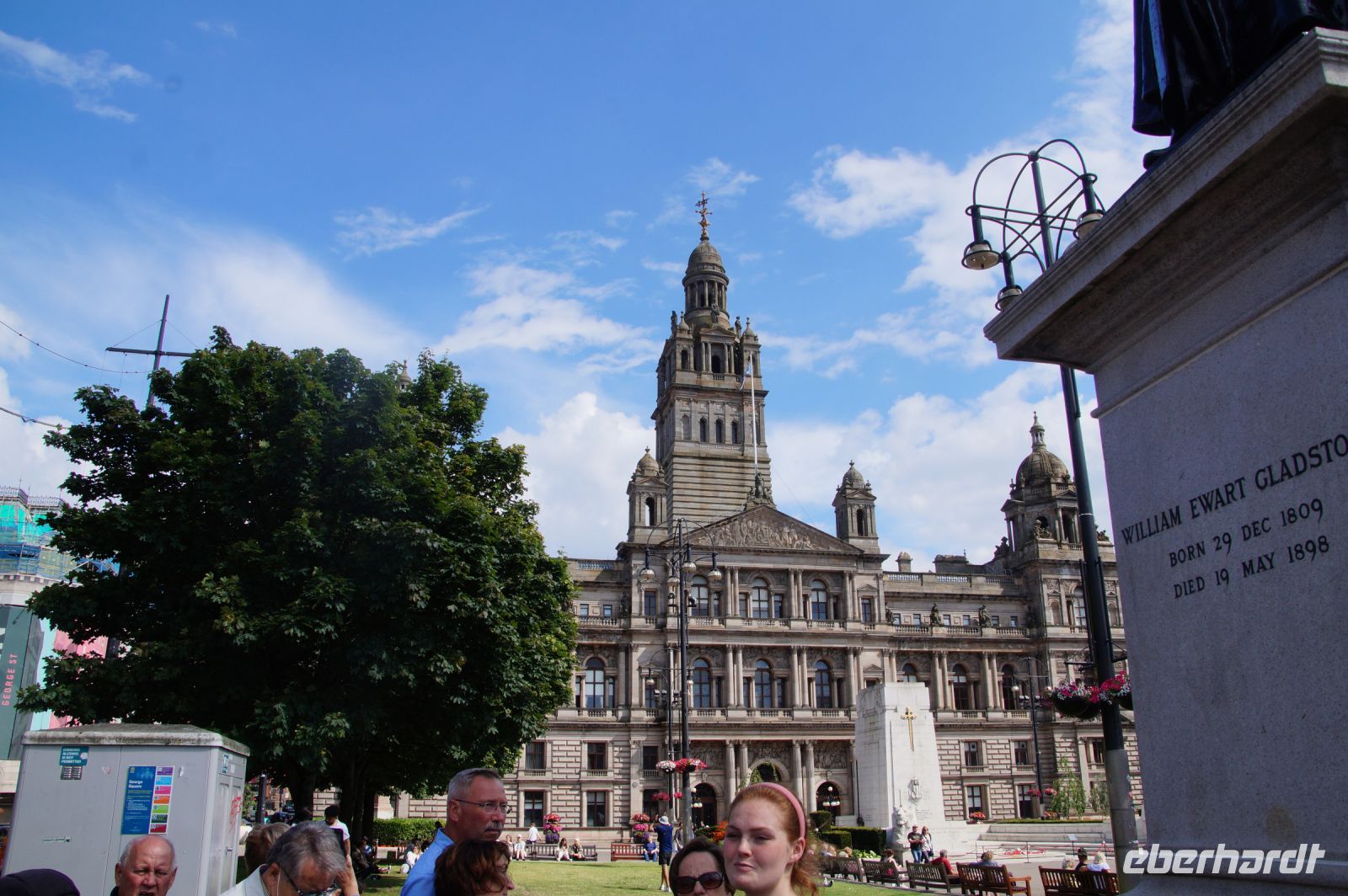 Nach vielem Hin und Her ging es endlich los und wir landeten mit etwa anderthalb Stunden Verspätung in Glasgow. Tahir nahm uns mit dem Bus in Empfang und wir fuhren zum zentralen George Square, wo die junge Historikern Victoria ihr Fahrrad geparkt hatte. Victoria war doch glatt aus dem geschichtsträchtigen Edinburgh ins industriell geprägte Glasgow gezogen, um ausgerechnet dort Geschichte zu studieren. Nach ihrem Studium blieb sie dort. (Nein, diese Opposition ist nicht ganz fair, auch Glasgow ist eine wichtige geschichtsträchtige Stadt, auch wenn ihr Stern nicht bereits im Mittelalter aufging, sondern so richtig erst mit den ersten britischen Kolonialreich.)