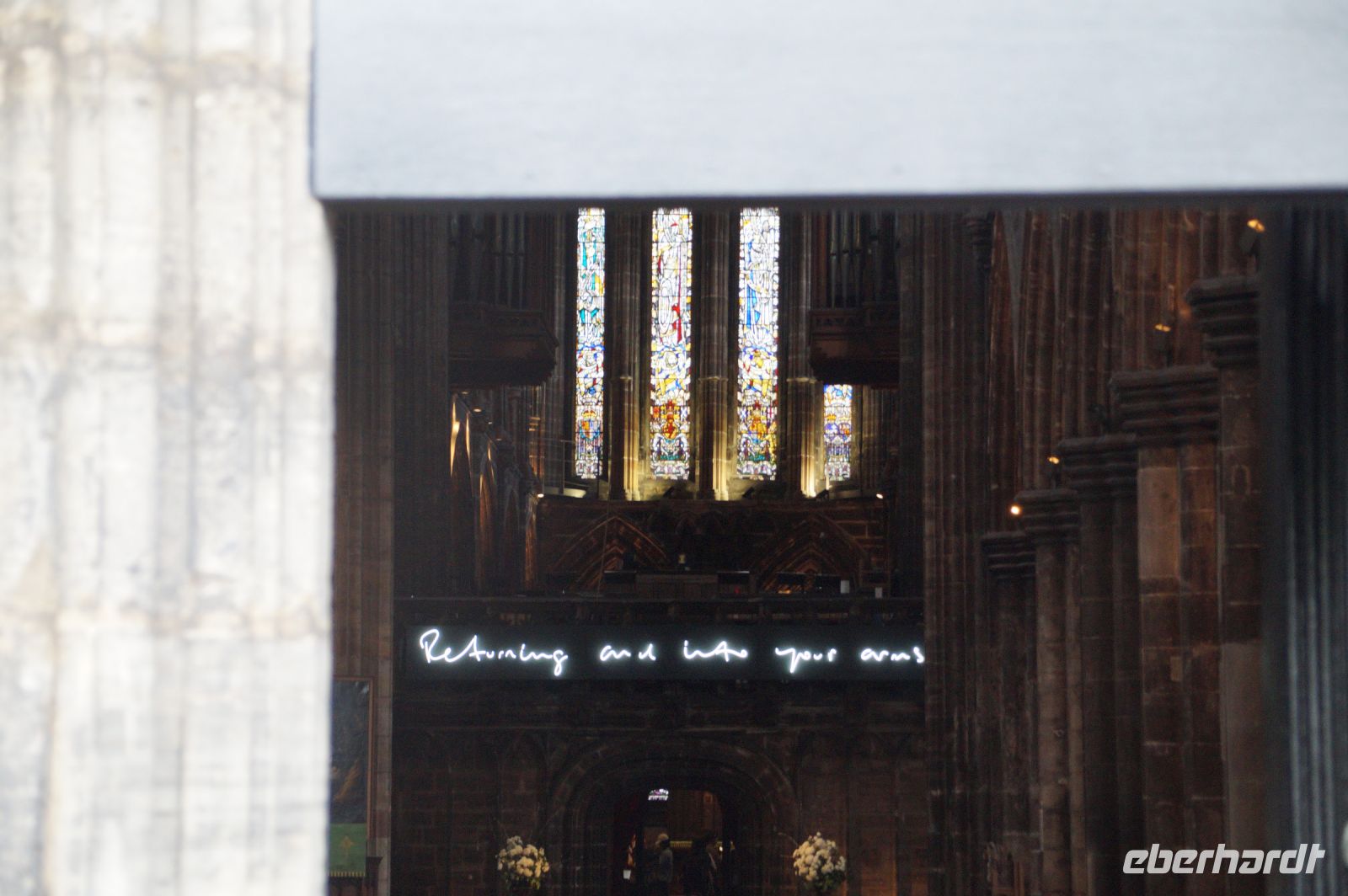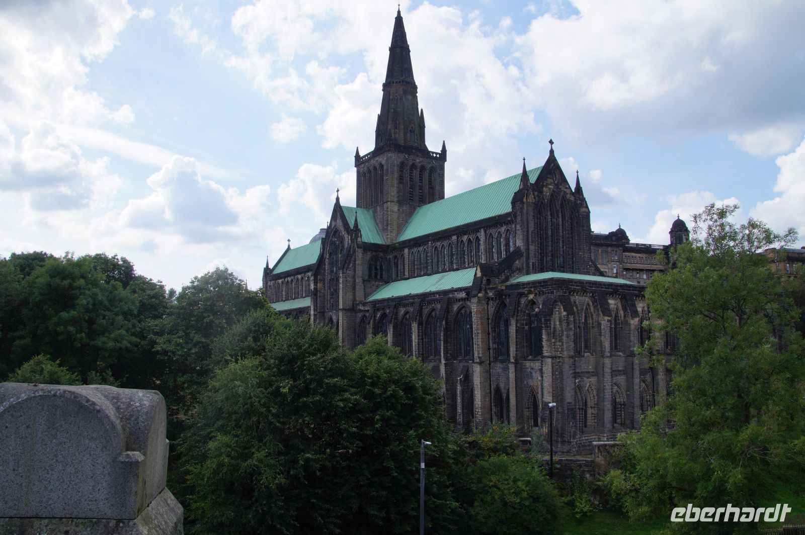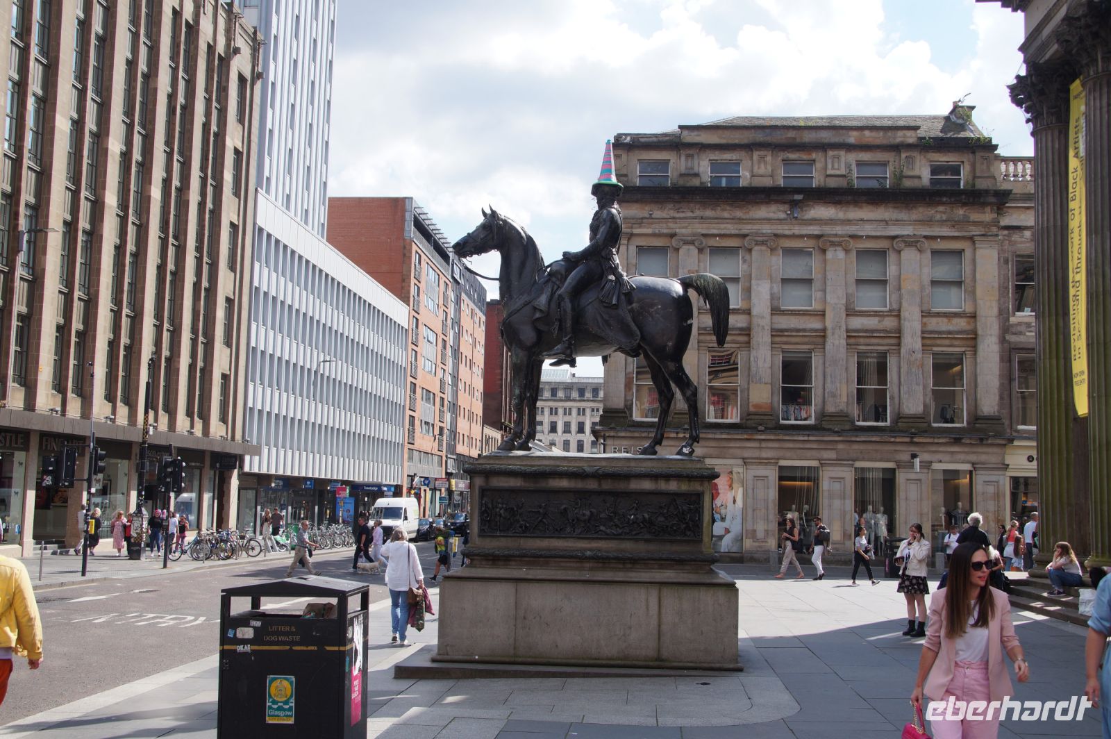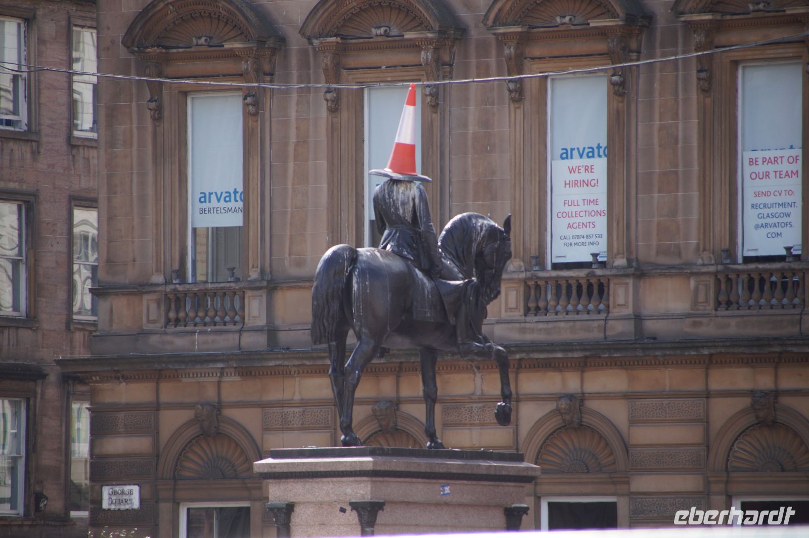 Zunächst durften wir uns ein wenig bewegen. Victoria erklärte uns den George Square und das graswurzelige the people make Glasgow (die Menschen sind es, die Glasgow gestalten). Dann verbachten wir noch ein wenig Zeit an der Gallery of Modern Art, vor der seit Jahrzehnten immer wieder die Statue des Duke of Wellington mit Verkehrskegeln bekrönt wird, manchmal selbst sogar sein Pferd. Häufig sind die Verkehrskegel bunt bepinselt und nehmen Stellung zum politischen Geschehen in Schottland und der Welt. Aber schon zuvor hatten wir den auf dem George Square aufgesockelten Prinzgemahl Queen Victorias, Albert von Sachsen-Coburg und Gotha, ebenfalls verkehrskegelberönt angetroffen Anschließend ging es zur Kathedrale. Aber die schloss um 16:00 und es war bereits 15:50, kein Einlass mehr möglich, die junge Dame vor Ort war zwar sehr freundlich, aber auch sehr bestimmt. (Als kleiner Trost meine persönliche Meinung: ich finde St. Kentigerns/Mungos Cathedralnur mäßig interessant.)