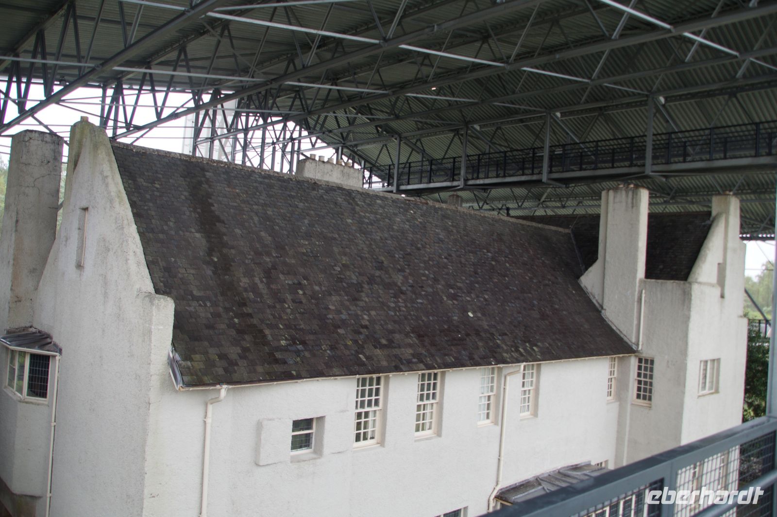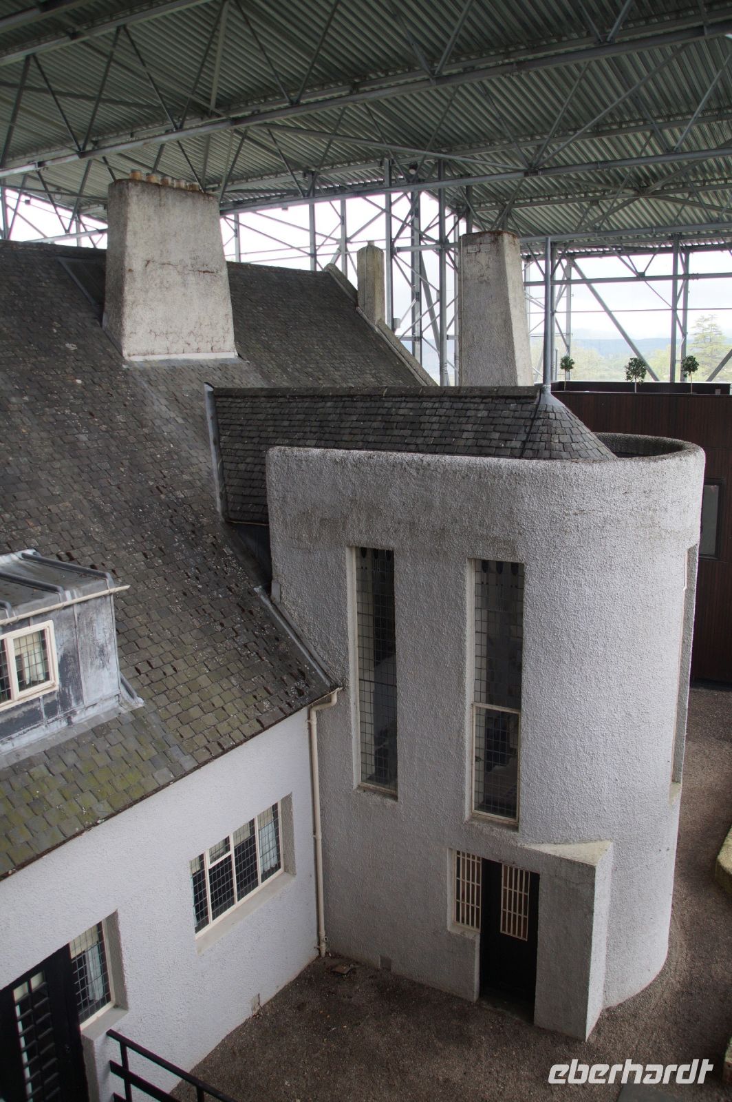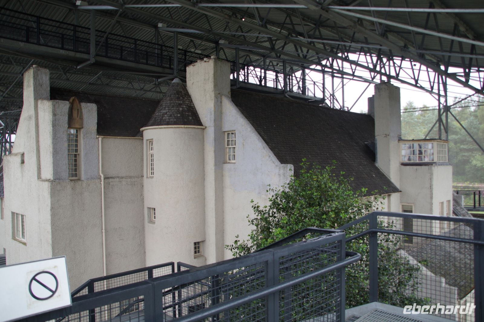 Dumbarton Castle (< Dùn Bhreatann) ist wegen klimawandelbedingten Steinschlags bis auf Weiteres geschlossen (Historic Enviroment Scotland ist mit Sicherungsaufgaben beschäftigt), daher fuhren wir hier nur dran vorbei, direkt weiter nach Helensburgh, wo 18/24 das Hill House des Jugendstil-Architekten Charles Rennie Mackintosh besichtigten, welches dieser 1902 bis 1904 für den Verleger Walter Blackie errichtet hatte. Um das Gebäude vor Regen zu schützen, hat man einen Käfig drumherum errichtet, welcher 80 % des Wassers abhalten soll. 1904 hat man das das Gebäude mit einem Zementputz bestrichen, dessen Ziel es war, keine Feuchtigkeit durchdringen zu lassen. Nach gut hundert Jahren aber hatte dieser Zementputz Risse bekommen, so dass einmal eingsickertes Wasser nicht mehr trocknete - der frühere Vorteil des Zementputzes wurde nun zum Nachteil. Um das Jugendstil-Kleinod zu schützen wurde nun also der erwähnte Käfig um das Haus herum gebaut. Aber man ging pragmatisch vor: Der Käfig ist nun so gestaltet, dass man das Haus nicht nur vom Erdboden aus betrachten kann, sondern man kann mit Hilfe von Treffen und Gängen auf verschiedenen Ebenen um das Haus herum und sogar über das Haus hinweg wegen.