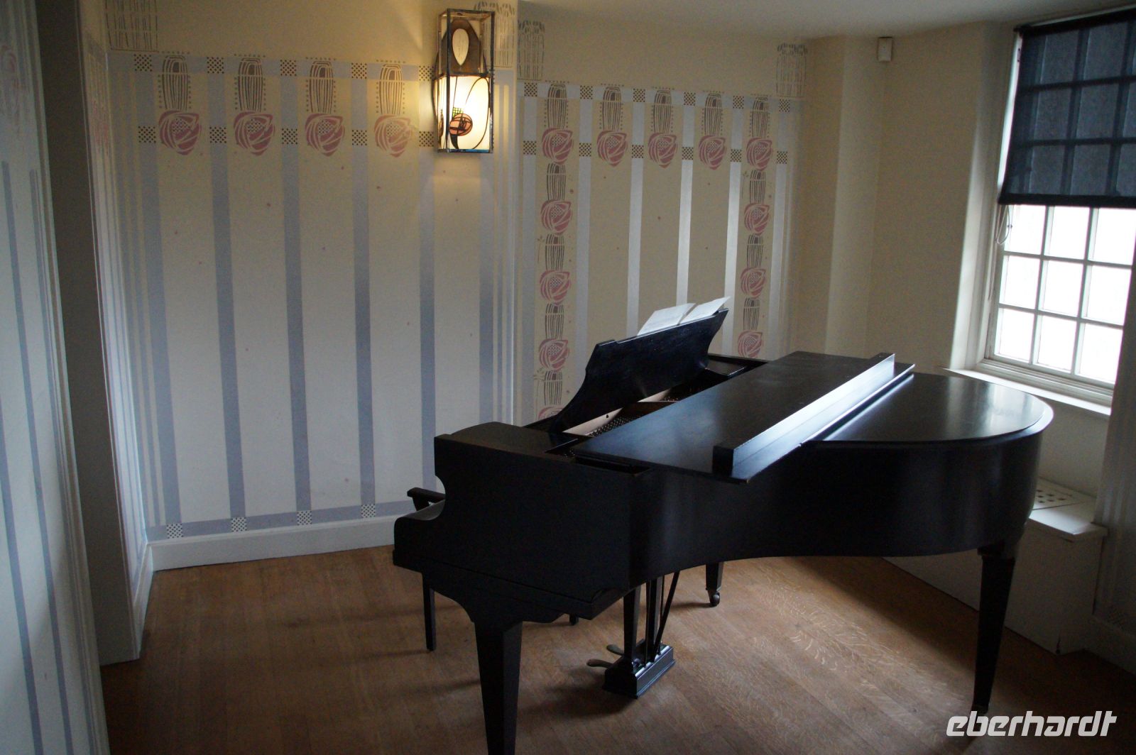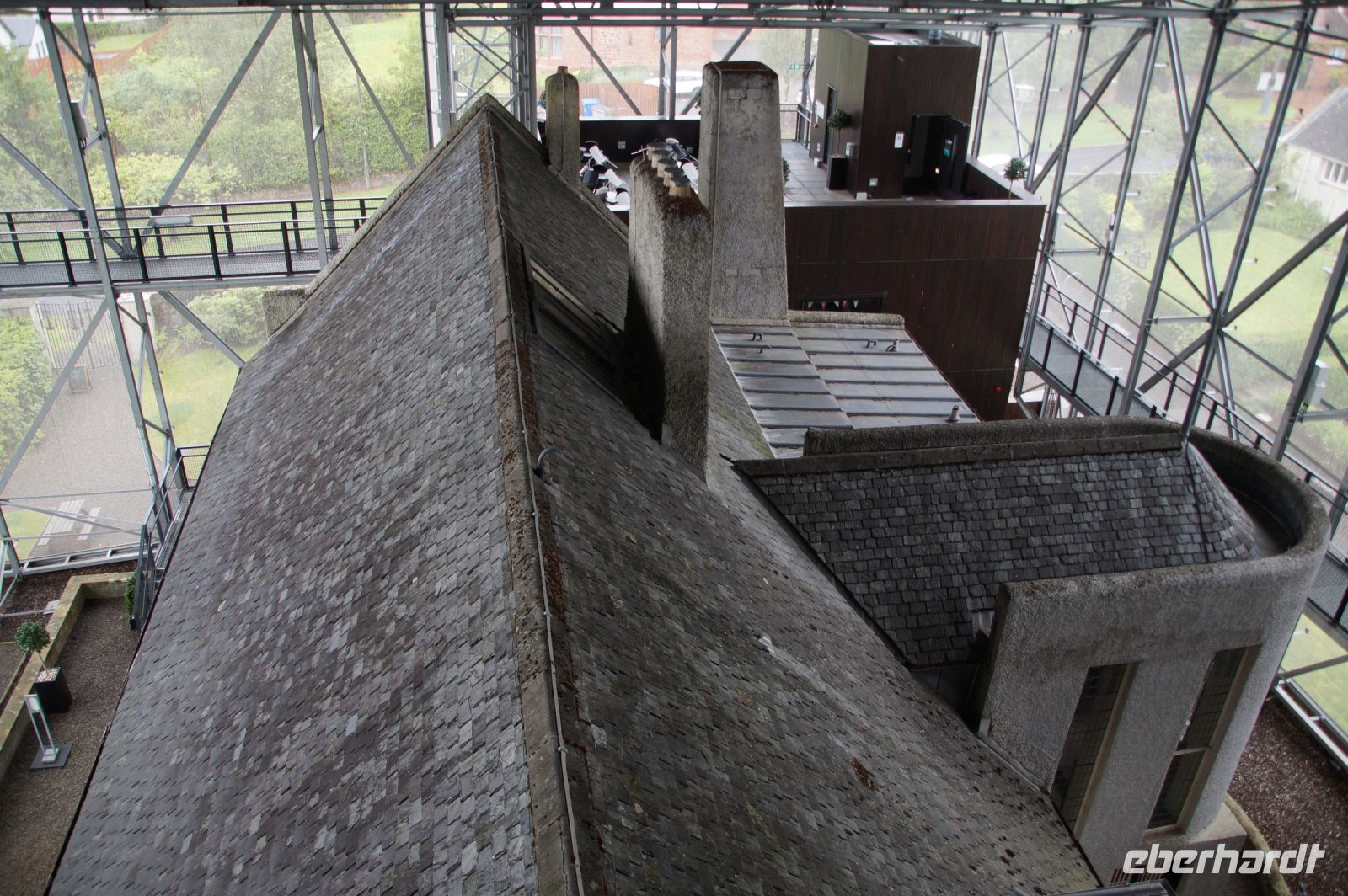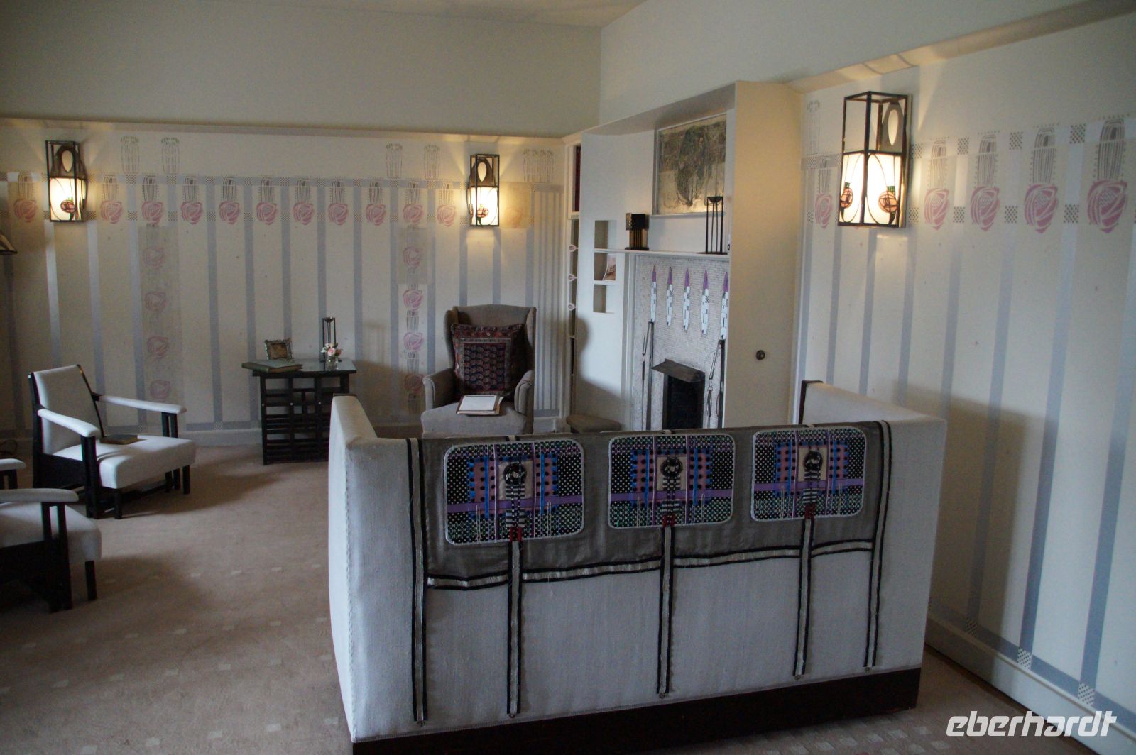 Dumbarton Castle (< Dùn Bhreatann) ist wegen klimawandelbedingten Steinschlags bis auf Weiteres geschlossen (Historic Enviroment Scotland ist mit Sicherungsaufgaben beschäftigt), daher fuhren wir hier nur dran vorbei, direkt weiter nach Helensburgh, wo 18/24 das Hill House des Jugendstil-Architekten Charles Rennie Mackintosh besichtigten, welches dieser 1902 bis 1904 für den Verleger Walter Blackie errichtet hatte. Um das Gebäude vor Regen zu schützen, hat man einen Käfig drumherum errichtet, welcher 80 % des Wassers abhalten soll. 1904 hat man das das Gebäude mit einem Zementputz bestrichen, dessen Ziel es war, keine Feuchtigkeit durchdringen zu lassen. Nach gut hundert Jahren aber hatte dieser Zementputz Risse bekommen, so dass einmal eingsickertes Wasser nicht mehr trocknete - der frühere Vorteil des Zementputzes wurde nun zum Nachteil. Um das Jugendstil-Kleinod zu schützen wurde nun also der erwähnte Käfig um das Haus herum gebaut. Aber man ging pragmatisch vor: Der Käfig ist nun so gestaltet, dass man das Haus nicht nur vom Erdboden aus betrachten kann, sondern man kann mit Hilfe von Treffen und Gängen auf verschiedenen Ebenen um das Haus herum und sogar über das Haus hinweg wegen.