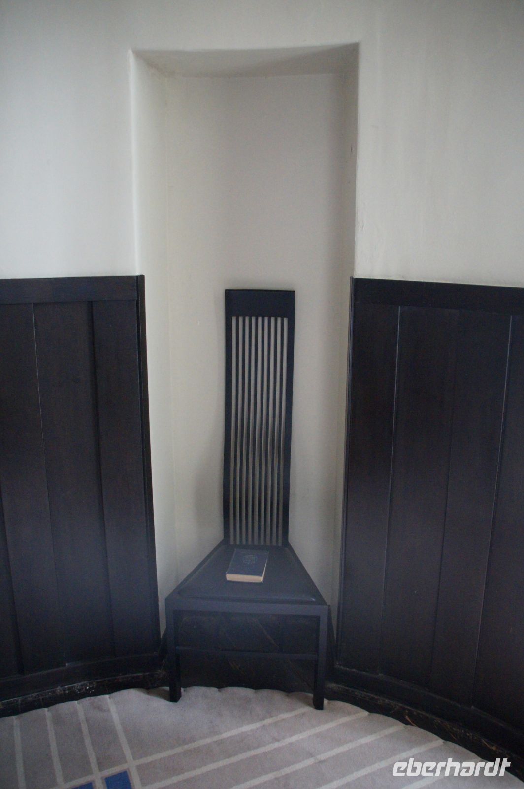 Während wir noch so um und über das Haus gingen, mutmaßten Magdalena, Doreen und ich, welches wohl die Funktion des langgezogenen Raumes mit den hohen Fenstern sei. - "Eine Kapelle." - "Ein Lesezimmer." Wetten wurde abgeschlossen.