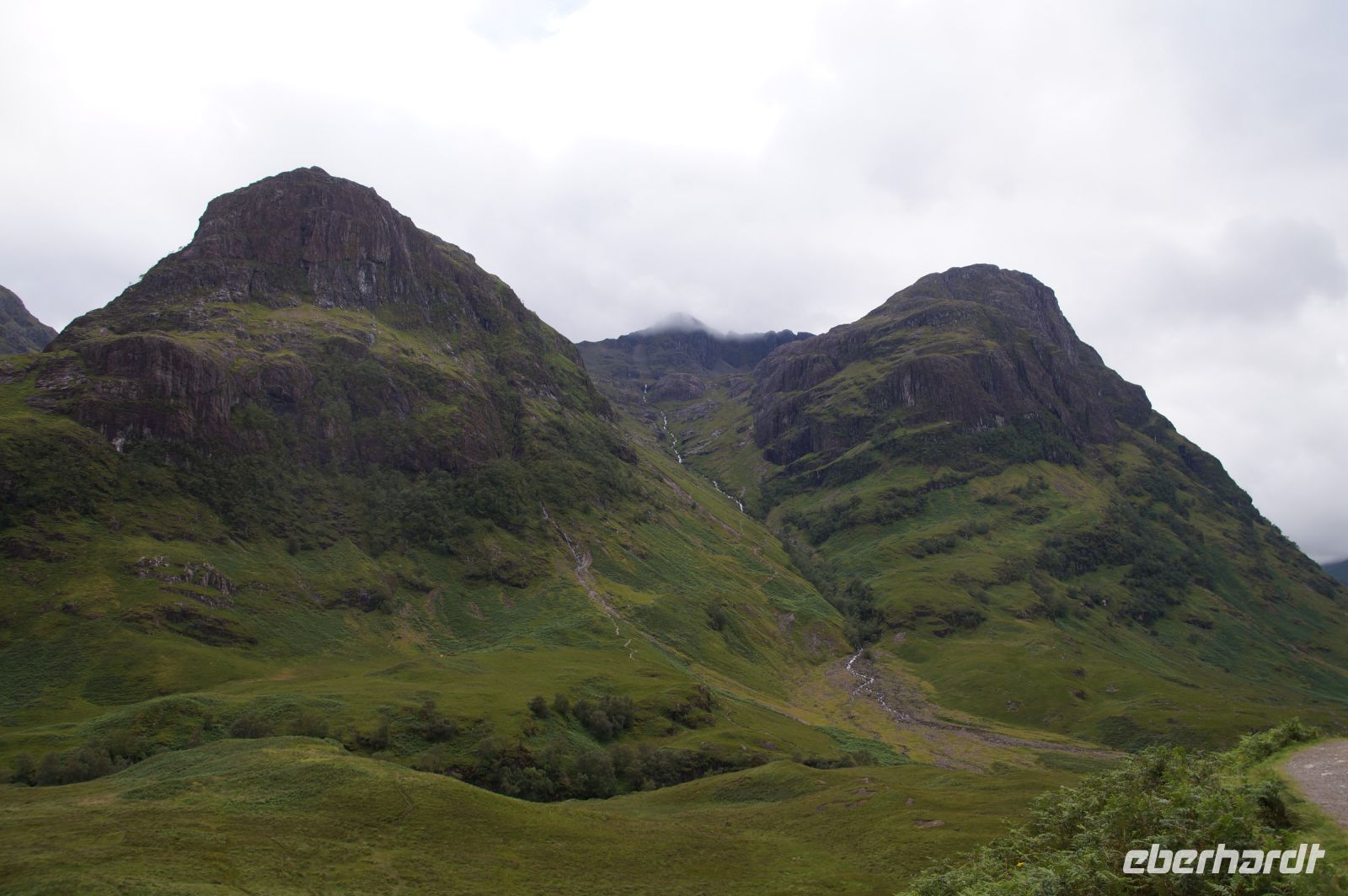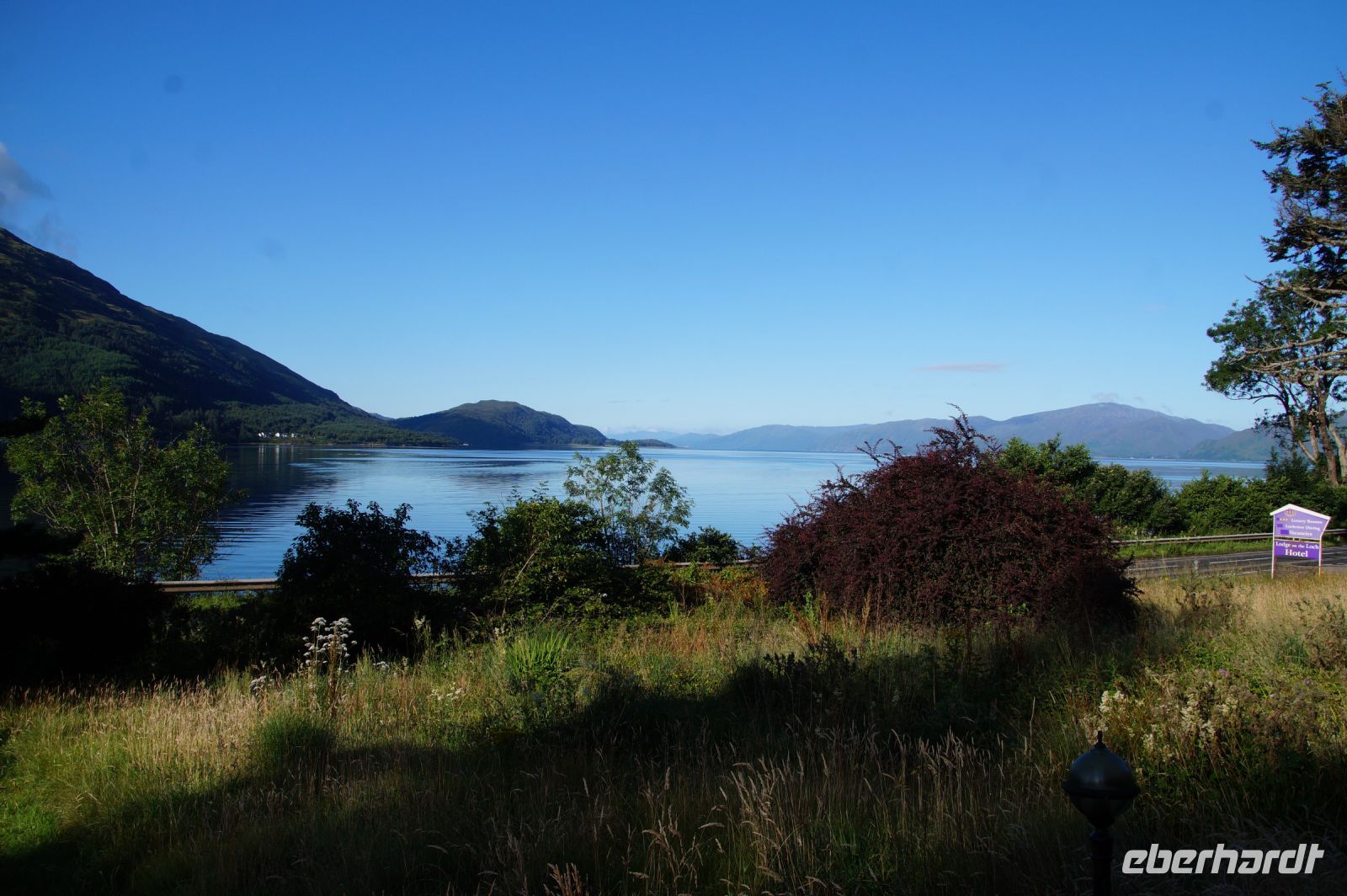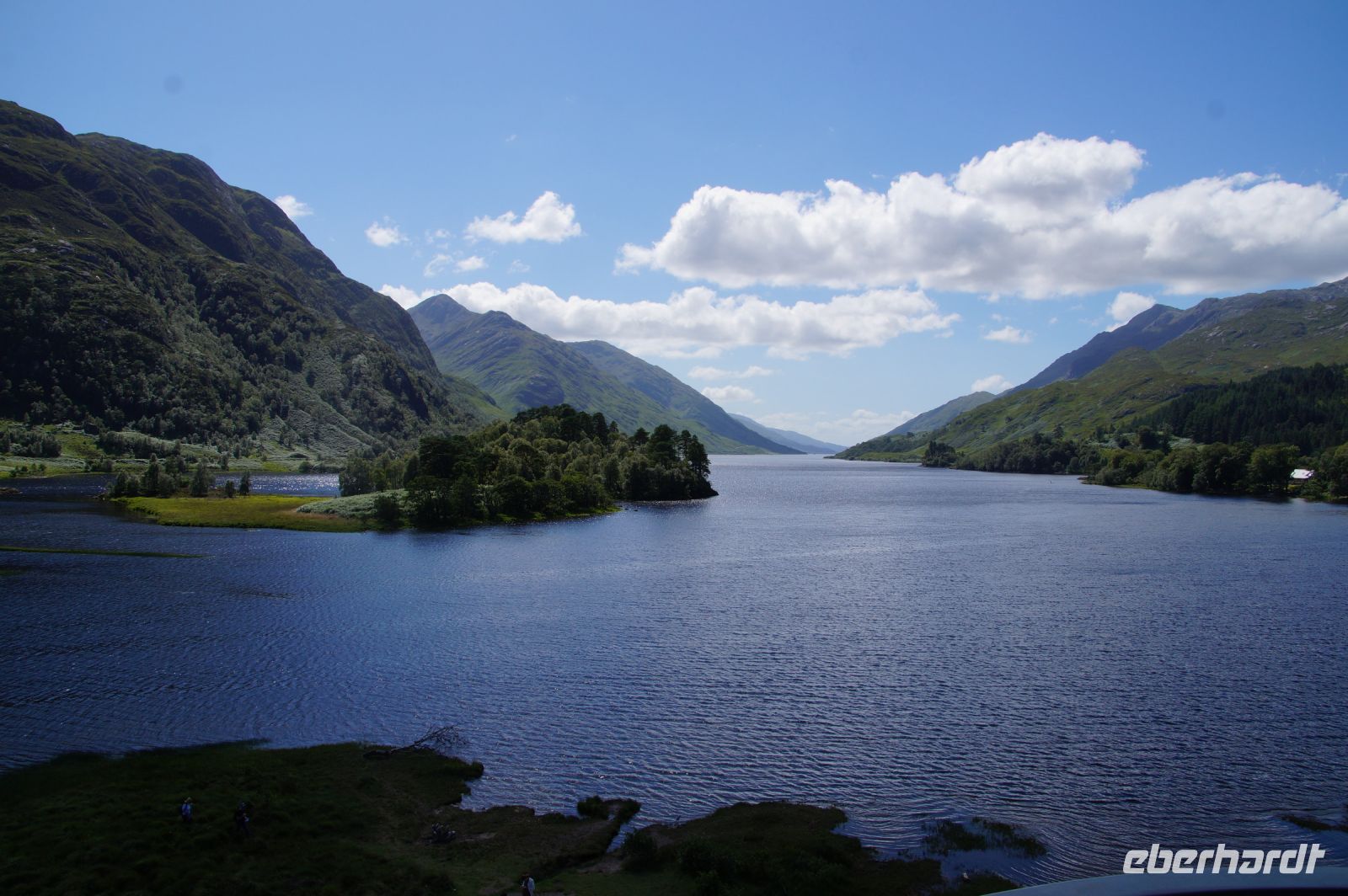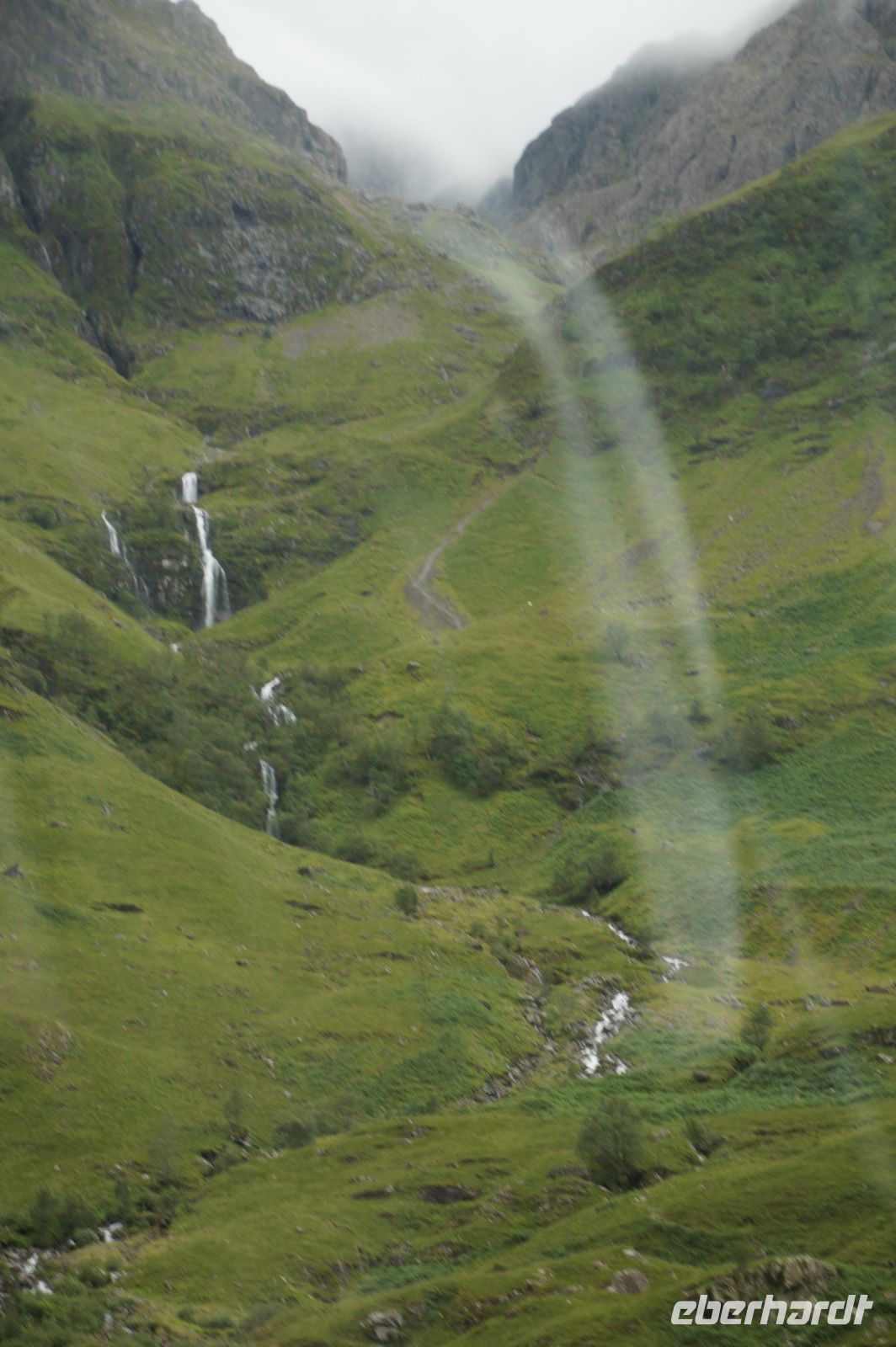 Über Loch Tull machten wir einen Halt und blickten von der Anhöhe (Loch Tulla View) noch einmal gen Süden, bevor wir ins Rannoch Moor fuhren. Bei einem Fotostopp hier fiel Gästen gleich auf, wie der Torfboden federte. Noch drei Fotostopps am bzw. im Glen Coe (an seinem Eingang, am Allt Lairig Eilde-Wasserfall und am Drei-Schwestern-Aussichtspunkt) und wir erreichten bald unser am Loch Linnhe, einem Meeresarm, gelegenes Hotel. Als Reiseleiter kann ich da nicht mitreden, da meine Aussicht nicht gerade berauschend war, aber die meisten Gäste hatten wohl eine atemberaubende Aussicht auf den spiegelglatten "Fjord".