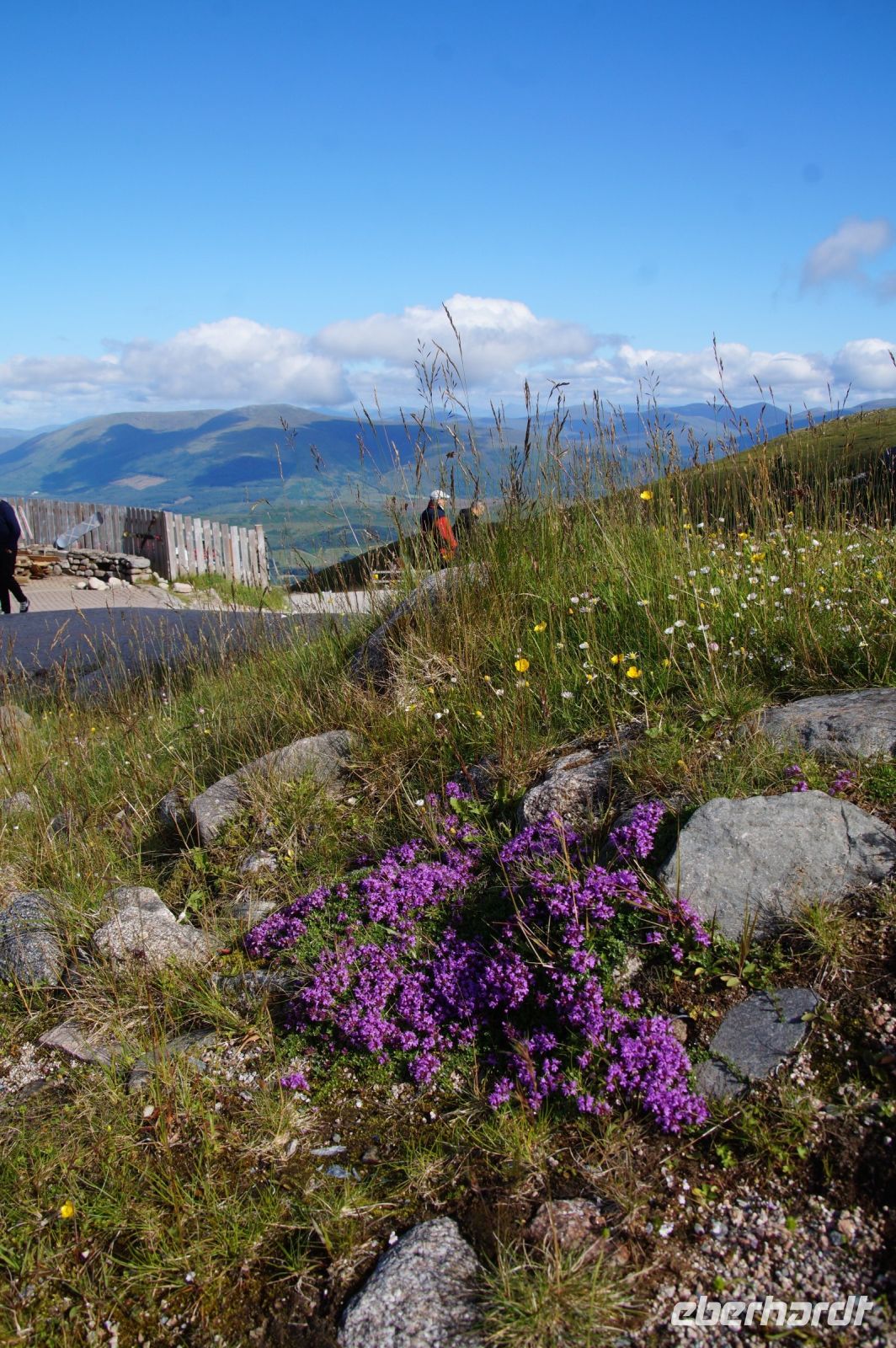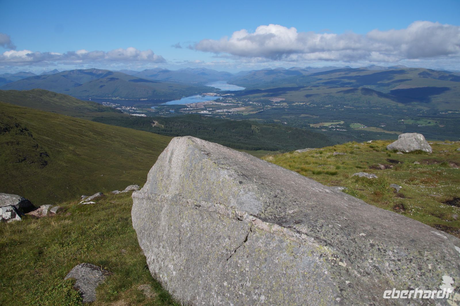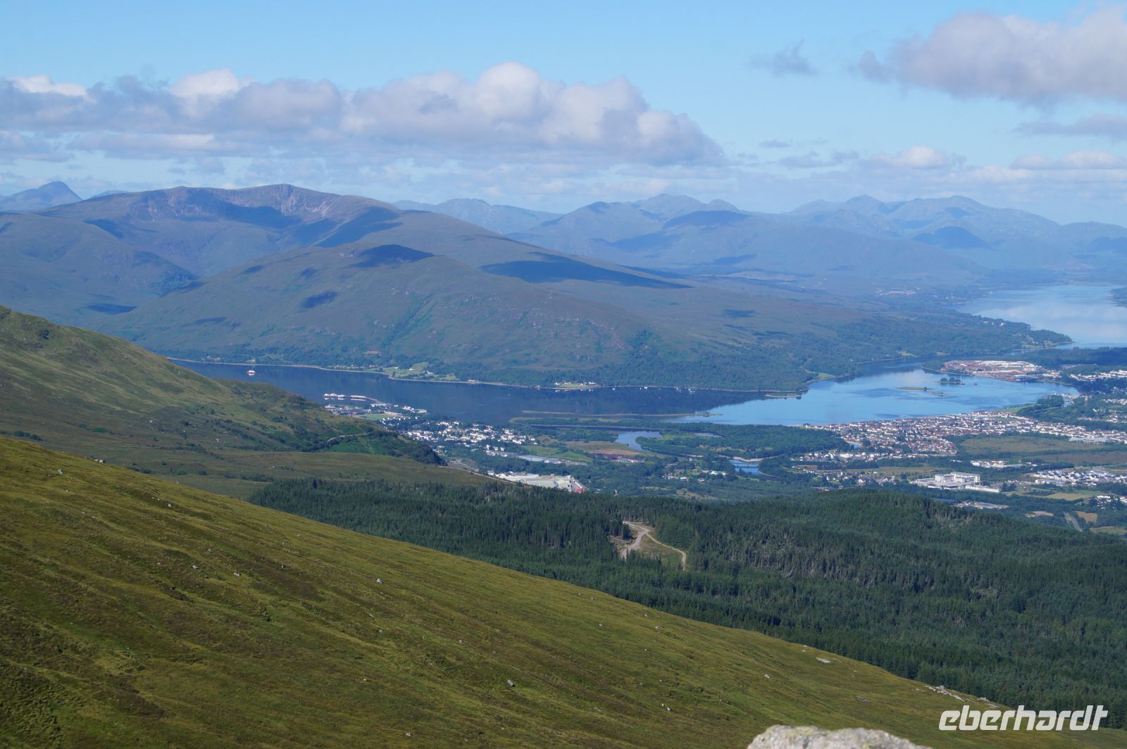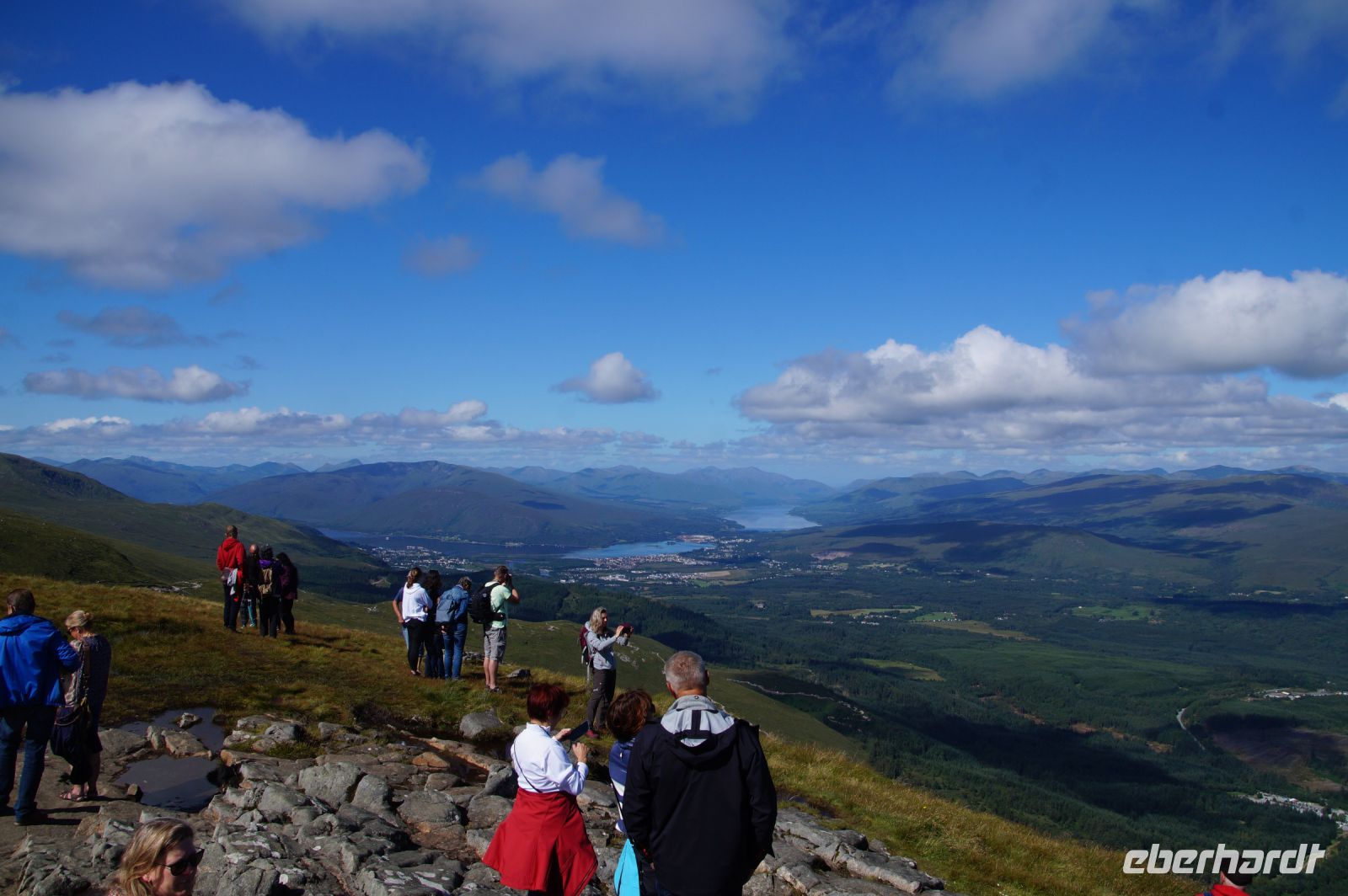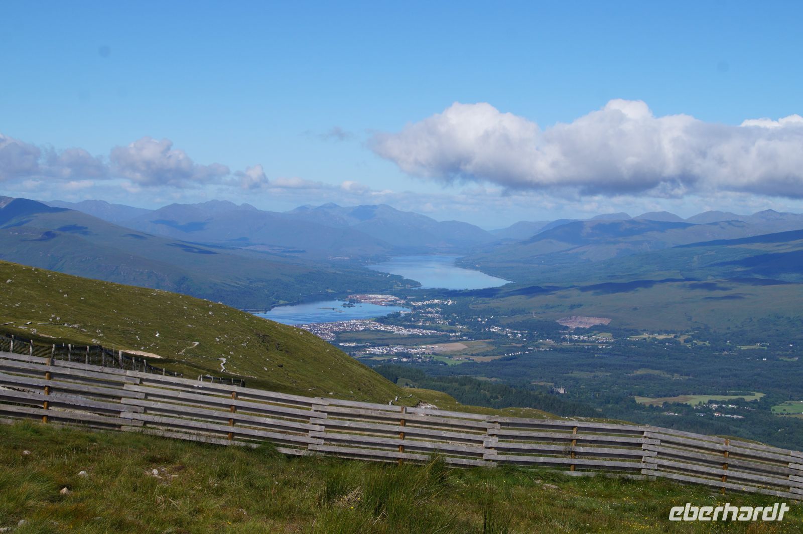 Unser erstes Ziel für heute war der Aonach Mor, ein Berg, der im Winter von Skifahrern, im Sommer von Mountainbikern für ihre sportlichen Aktivitäten genutzt wird. Und eben von rüstigen Wanderern wie uns. Wir teilten uns in zwei Gruppen auf und liefen zu den beiden Aussichtpunkten, erst dem einen und dann dem anderen. Vom Aonach Mor aus kann man nach Fort William sehen, am Ende des Loch Linnhe und zu dessen Fortsetzung Loch Eil, ein Arm von einem Meeresarm, ca. 70 - 75 km vom offenen Meer entfernt. Und man kann einen Blick auf Loch Lochy, einem der vier großen Seen in der Great Glen Fault, einer geologischen Verwerfung werfen. Die Great Glen Fault setzt sich über Loch Linnhe bis Irland fort und ist am Ende eigentlich ein Stück über den Atlantik gewandertes Amerika (so setzen sich auch die Appalachen im Osten der USA in Teilen der schottischen Highlands fort).