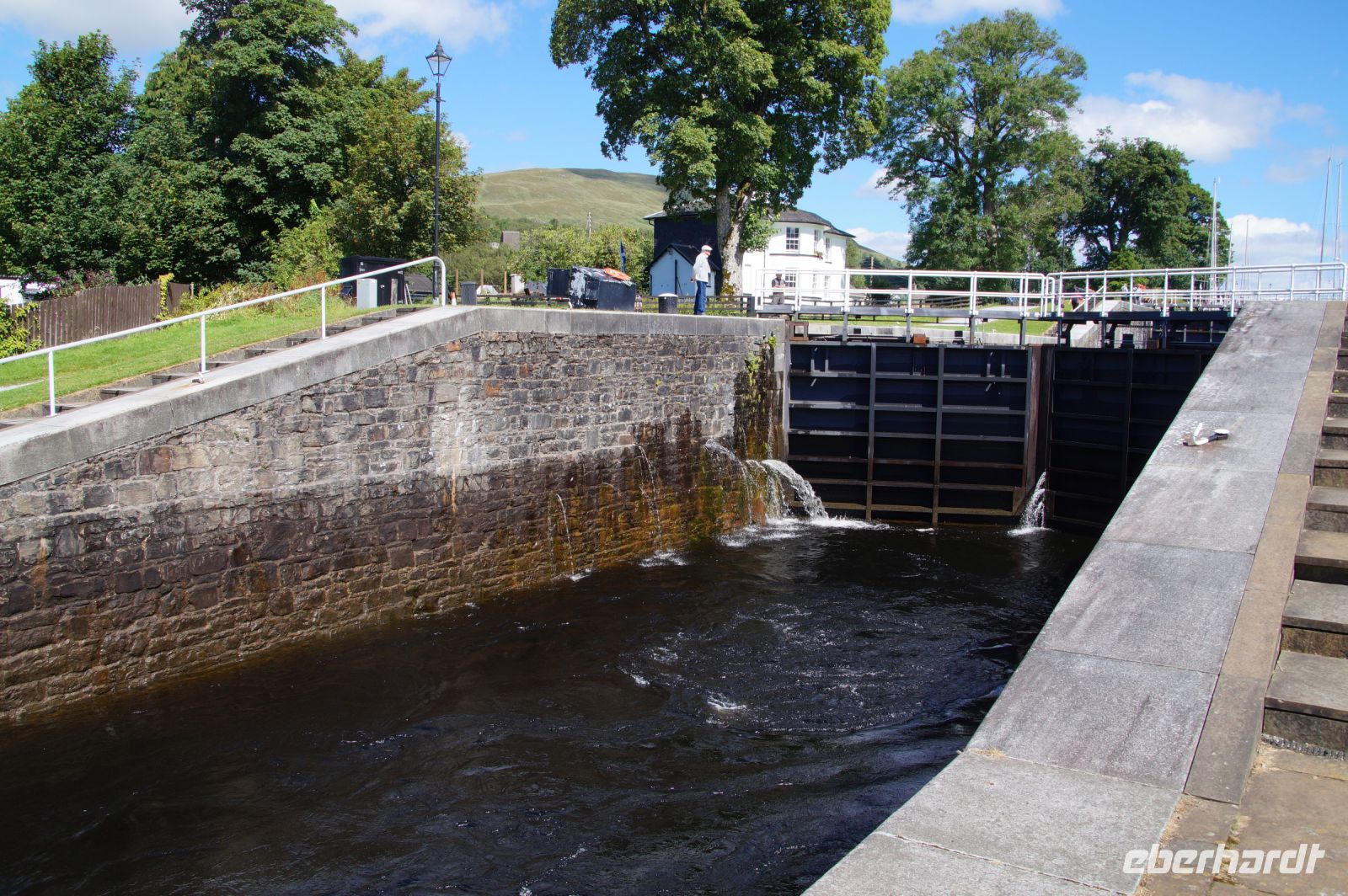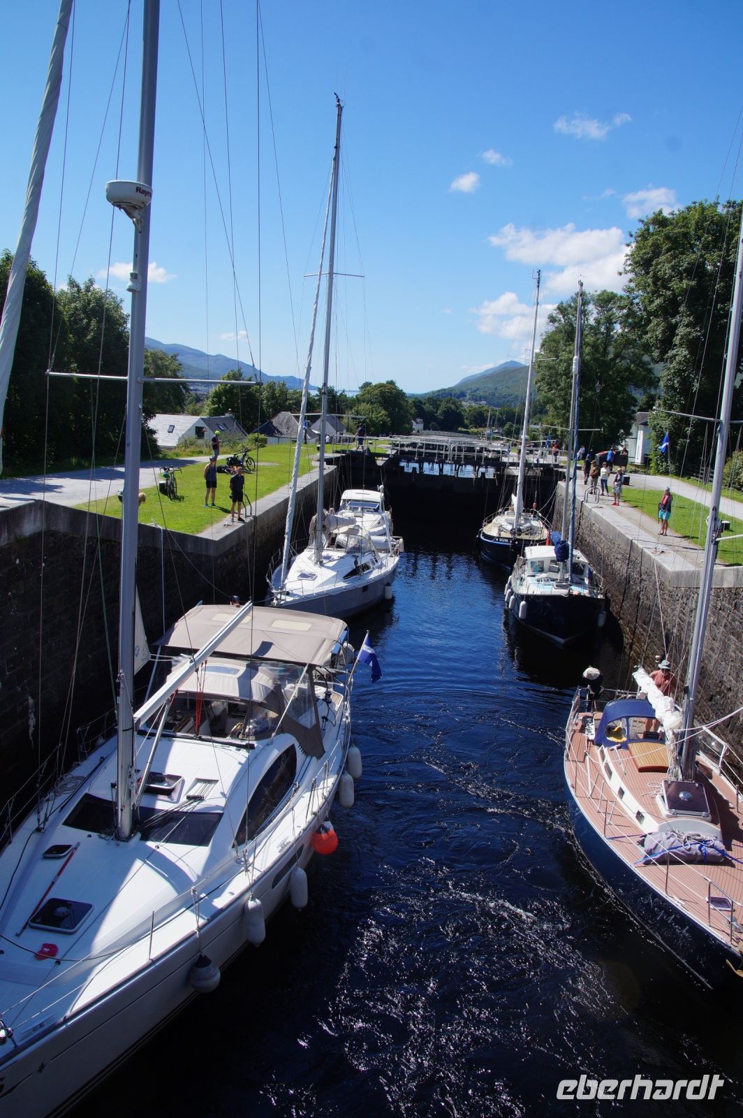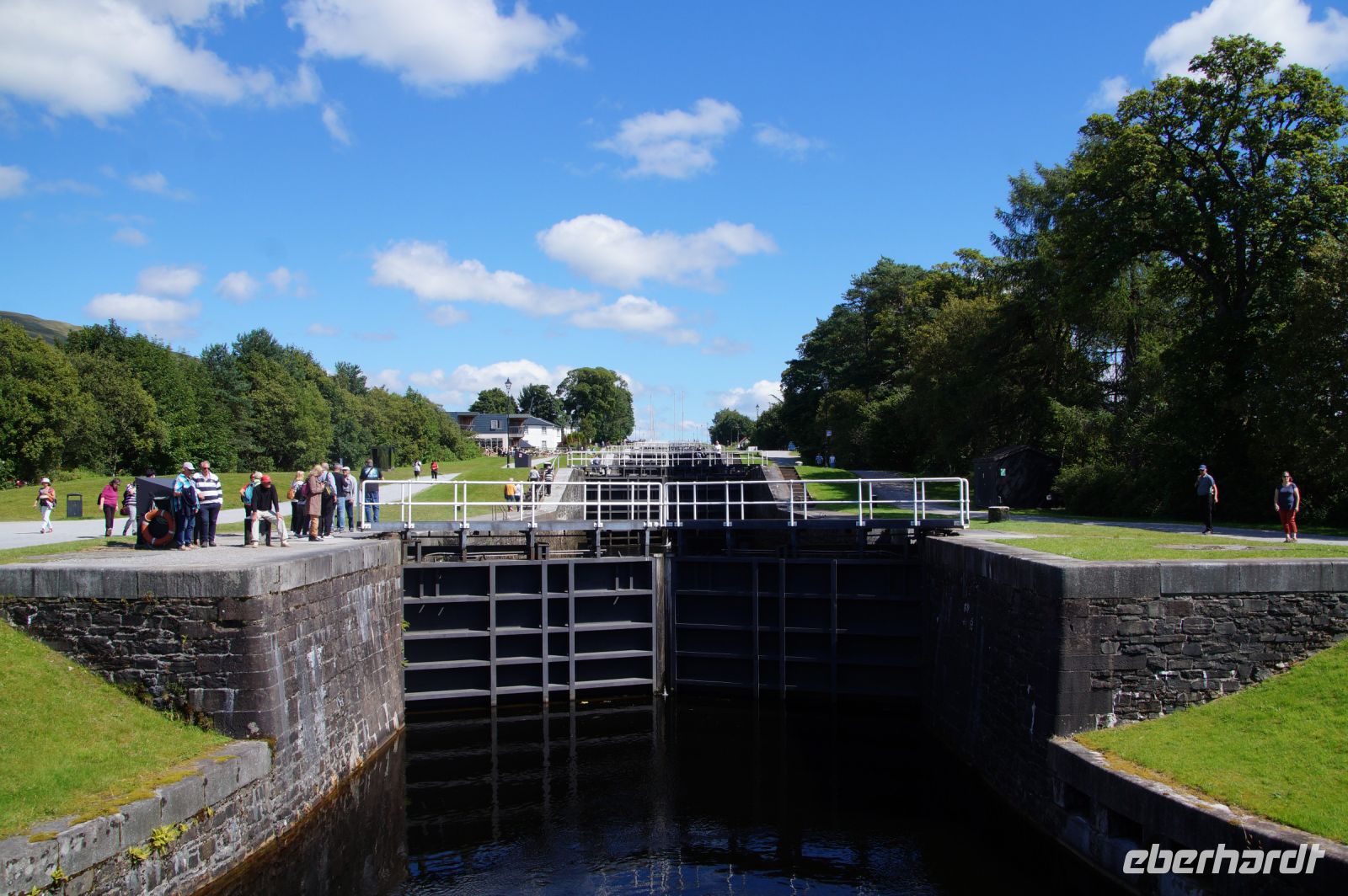 Nach unseren beiden Kurzwanderungen dort und derjeweiligen Aussicht "ins Tal" begaben wir uns zu Neptun's Staircase. Offiziell lautet der Name dieser aus acht Schleusen bestehenden Schleusentreppe des kaledonischen Kanals, der durch das Great Glen führt, Banavie Locks (Schleusen von Banavie). Die Banavie Lokcs wurden 1811 von Thomas Telford, dem Erbauer des Kaledonischen Kanals fertiggestellt. Der Kanal insgesamt wurde erst 1822 eröffnet. Er sollte Seeleuten die gefährliche Umseglung der Nordspitze Großbritanniens ersparen und den Handel fördern. Heute ist der Kanal vor allem ein von Seglern und Kanuten genutzes Gewässer.
