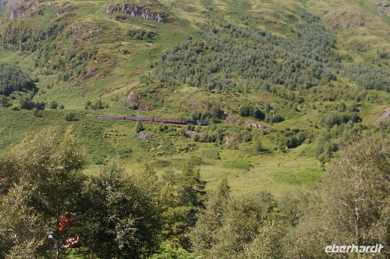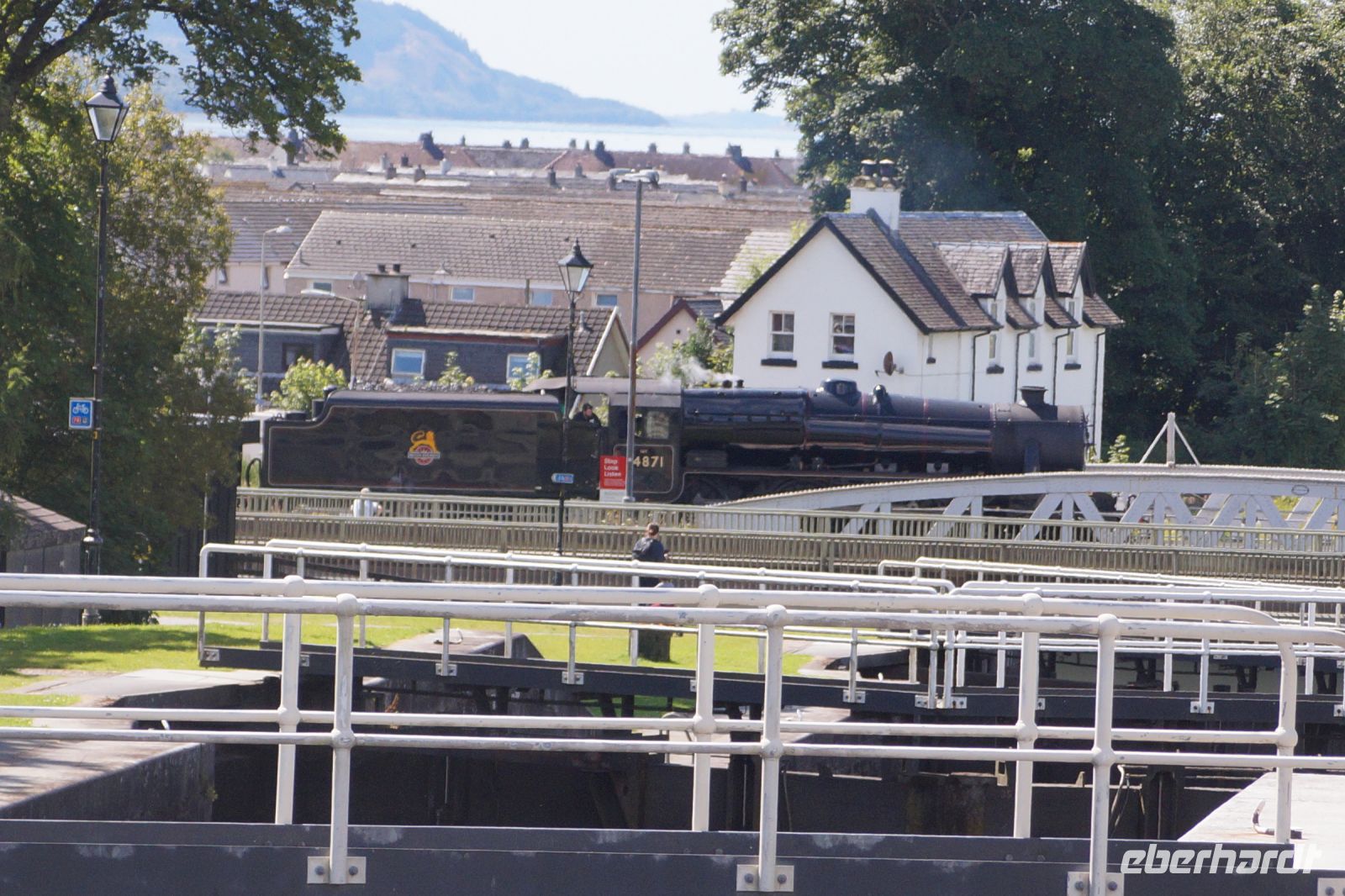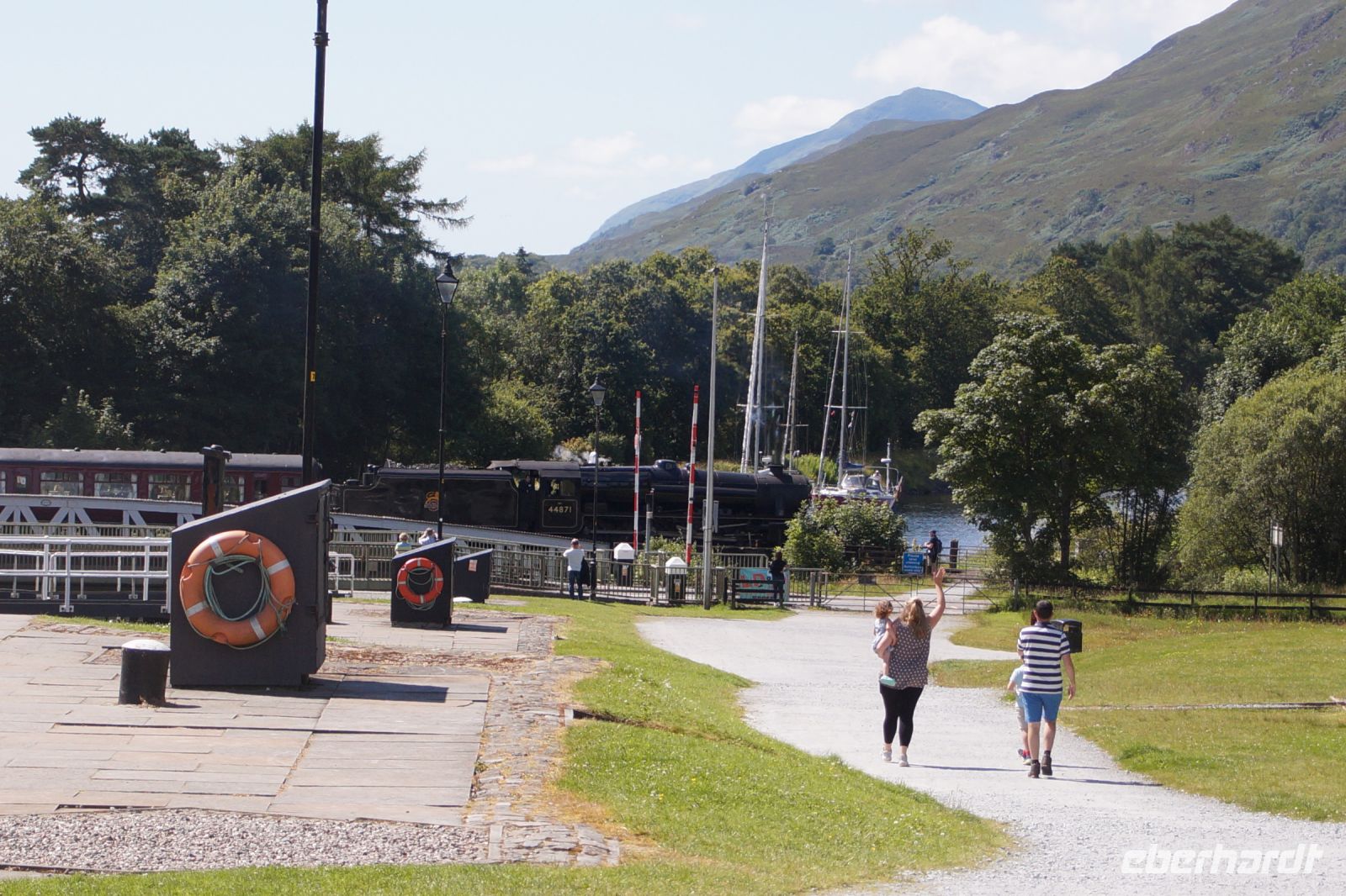 Wir sahen ein wenig beim Schleusen zu und einige unterhielten sich mit einem deutschen Bootskapitän, der eben aus der irisschen See kam und sich jetzt via Kaledonischem Kanal auf dem Rückweg in die Heimat befand. Um 15:00 Uhr wollten wir am Glenfinnan-Denkmal sein, um den Hogwar.... Jacobite Steam Train dort zu sehen. Doch, oh weh, ich war eben auf dem Weg zurück zum Bus, als ich eine sich schnell nähernde Dampfwolke aus Richtung Fort William kommen sah. Der Jacobite! In Schrittgeschwindigkeit fur er dann an den Banavie Locks vorbei. Hatte ich mich mit der Uhrzeit vertan? Eine schnelle Internetrechereche beruhigte mich: Es fuhren zwei Züge pro Richtung, die Uhrzeit stimmte.