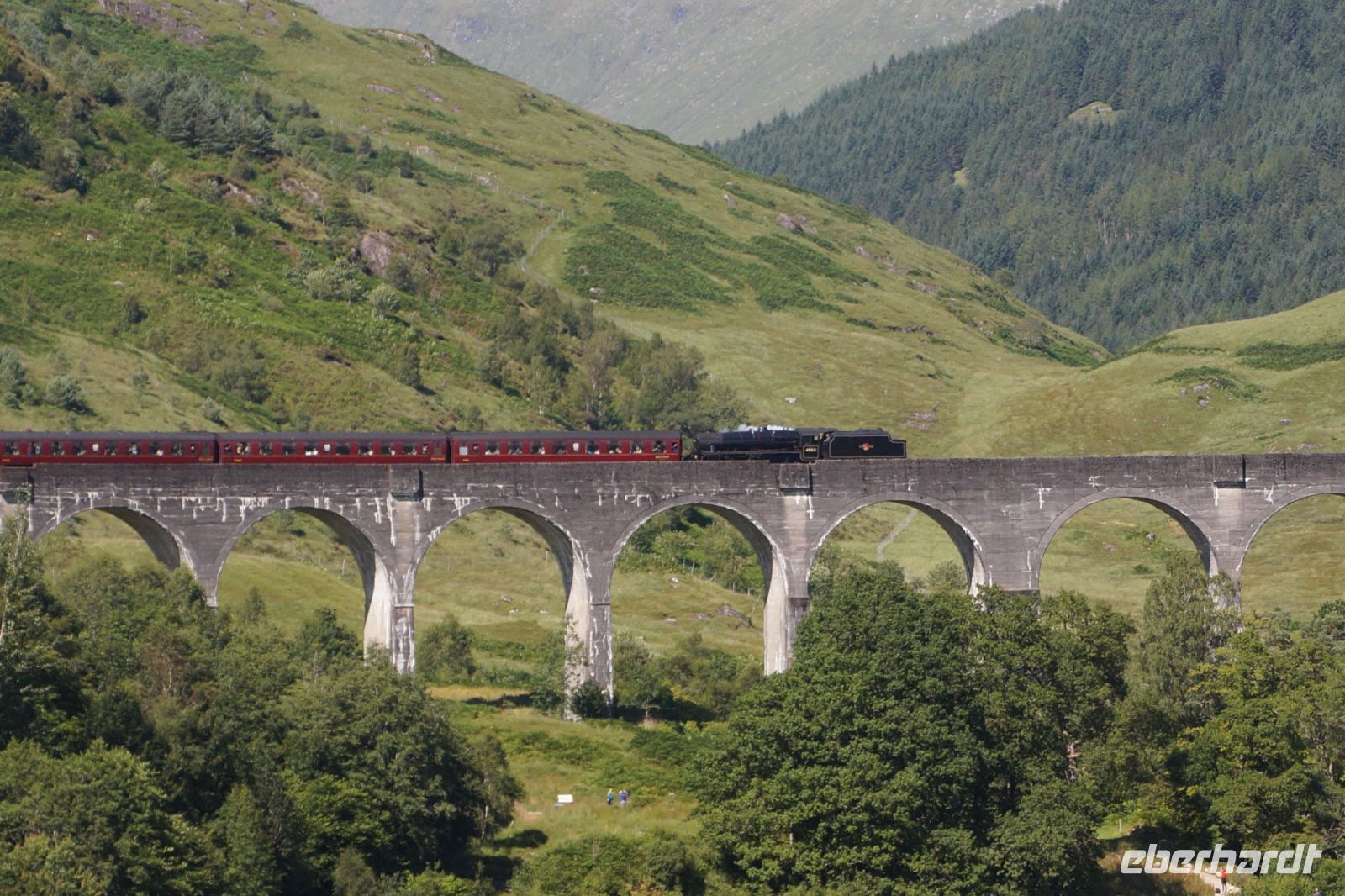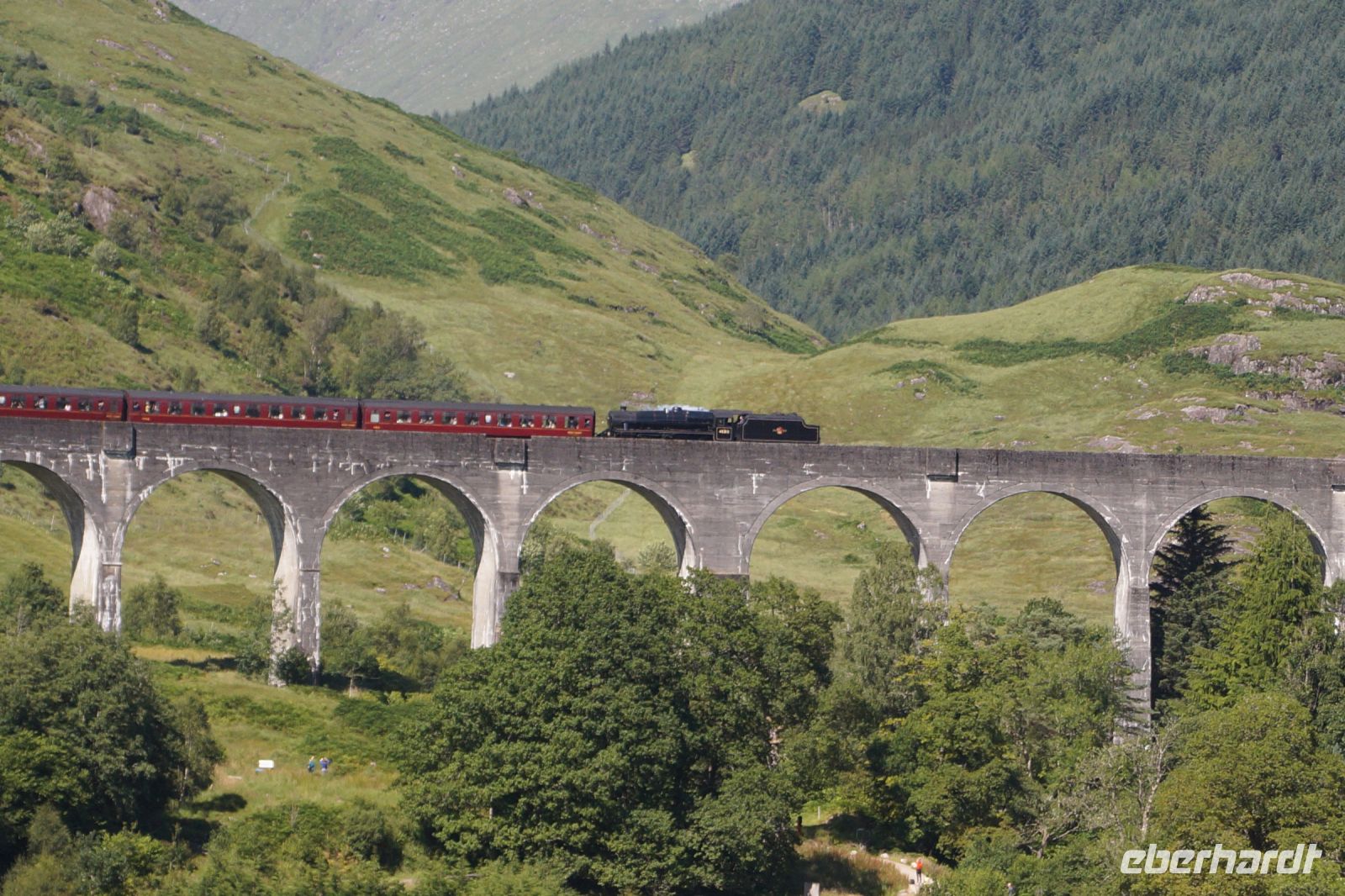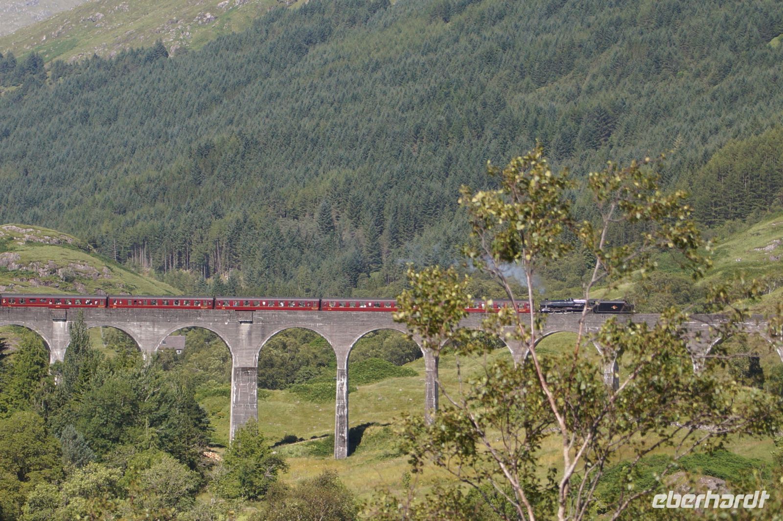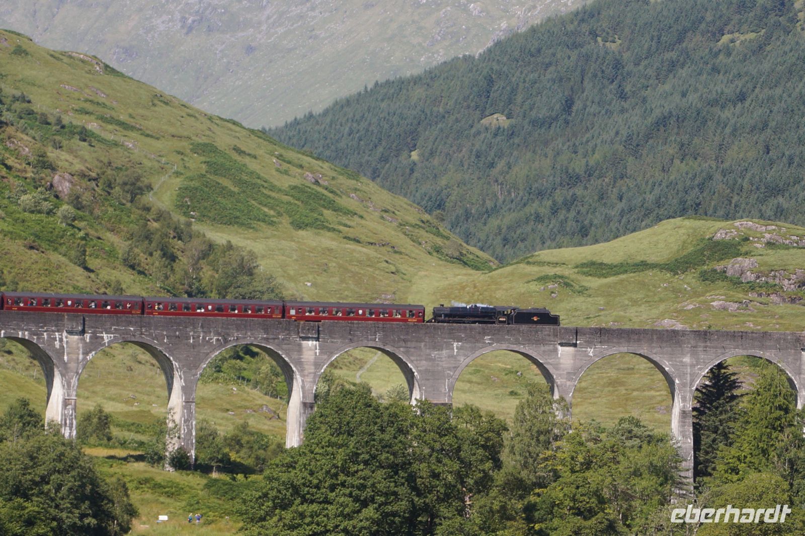 Wir sahen ein wenig beim Schleusen zu und einige unterhielten sich mit einem deutschen Bootskapitän, der eben aus der irisschen See kam und sich jetzt via Kaledonischem Kanal auf dem Rückweg in die Heimat befand. Um 15:00 Uhr wollten wir am Glenfinnan-Denkmal sein, um den Hogwar.... Jacobite Steam Train dort zu sehen. Doch, oh weh, ich war eben auf dem Weg zurück zum Bus, als ich eine sich schnell nähernde Dampfwolke aus Richtung Fort William kommen sah. Der Jacobite! In Schrittgeschwindigkeit fur er dann an den Banavie Locks vorbei. Hatte ich mich mit der Uhrzeit vertan? Eine schnelle Internetrechereche beruhigte mich: Es fuhren zwei Züge pro Richtung, die Uhrzeit stimmte.