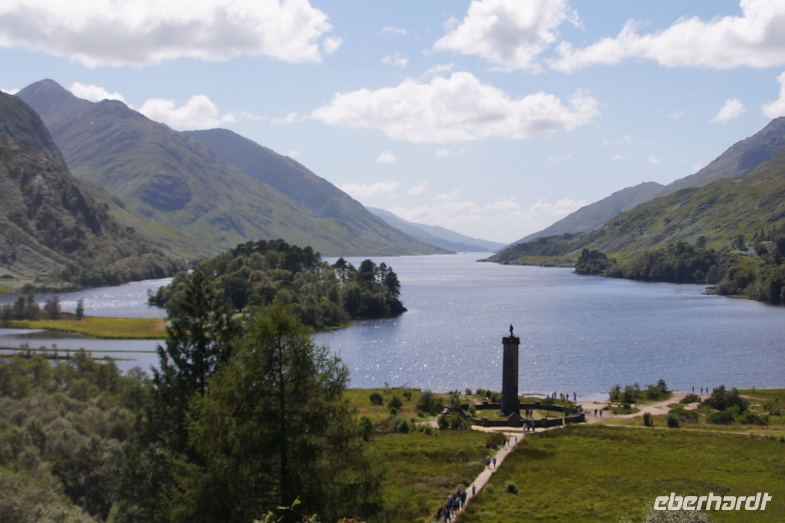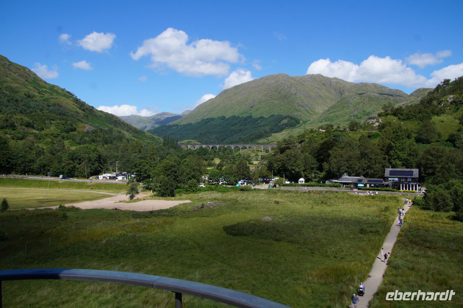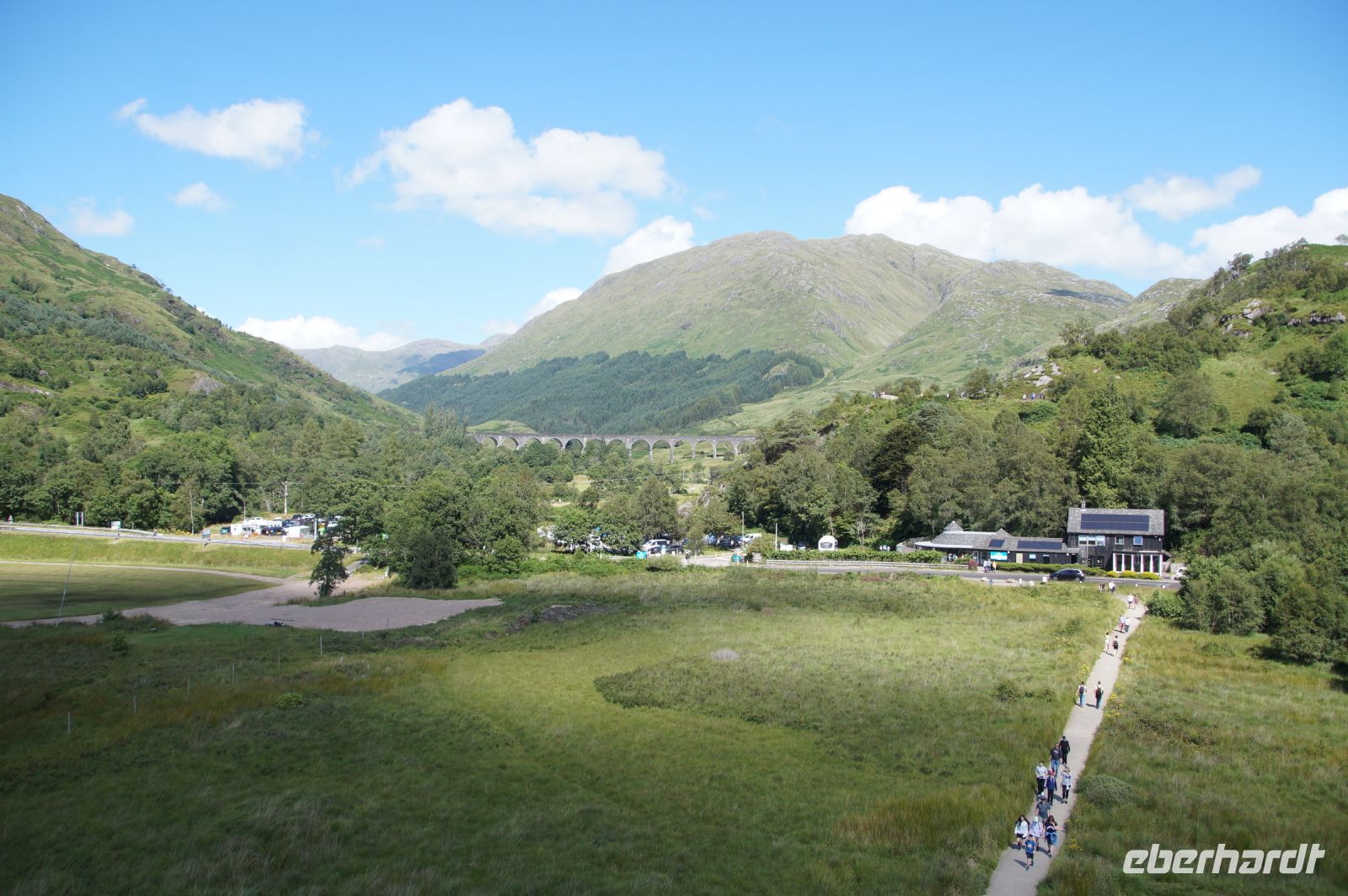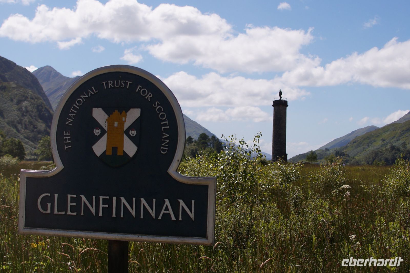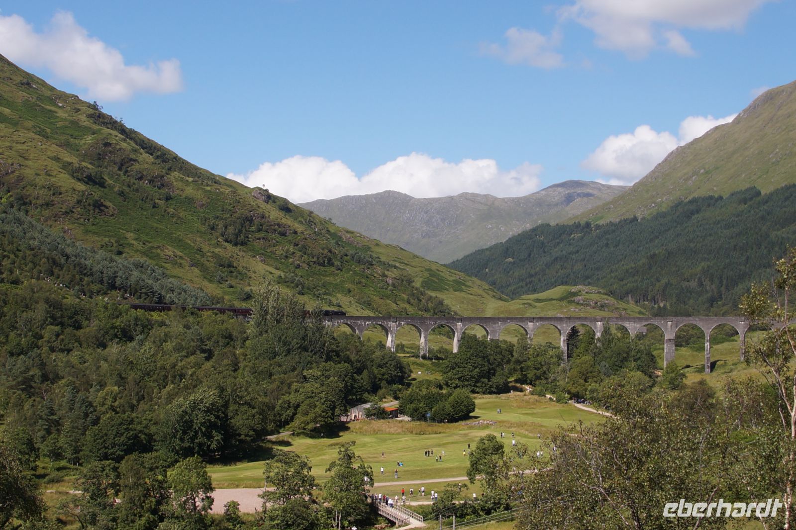 Das Glenfinnan Monument liegt - bzw. steht - am Ufer des Loch Shiel. Früher kamen die Leute hierher, weil dies der Ort war, an dem Bonnie Prince Charly (Charles Edward Stewart, the young Pretender) im vierten jakobitischen Aufstand seine Standarte erhoben und den Clanchefs die Treuschwüre abgenommen hatte. Oder weil man als technisch Interessierte vom Eisenbahnviadukt begeistert war. Außerdem ist es hier landschaftlich ziemlich schön. Heute kommen die Leute hierher mit Zauberstäben und Harry Potter-Devotionalien. Das Glenfinnan Viaduct ist schon häufiger in Filmen und Serien Kulisse gewesen. Aber wahrscheinlich hat es nie so eine Bekanntheit erfahren, wie durch die Harry Potter-Filme, in denen regelmäßig der Hogwarts-Express über die Brücke braust, begleitet von einem verzauberten Auto oder bedroht von den jegliches Lebensglück aussaugenden Dementoren.