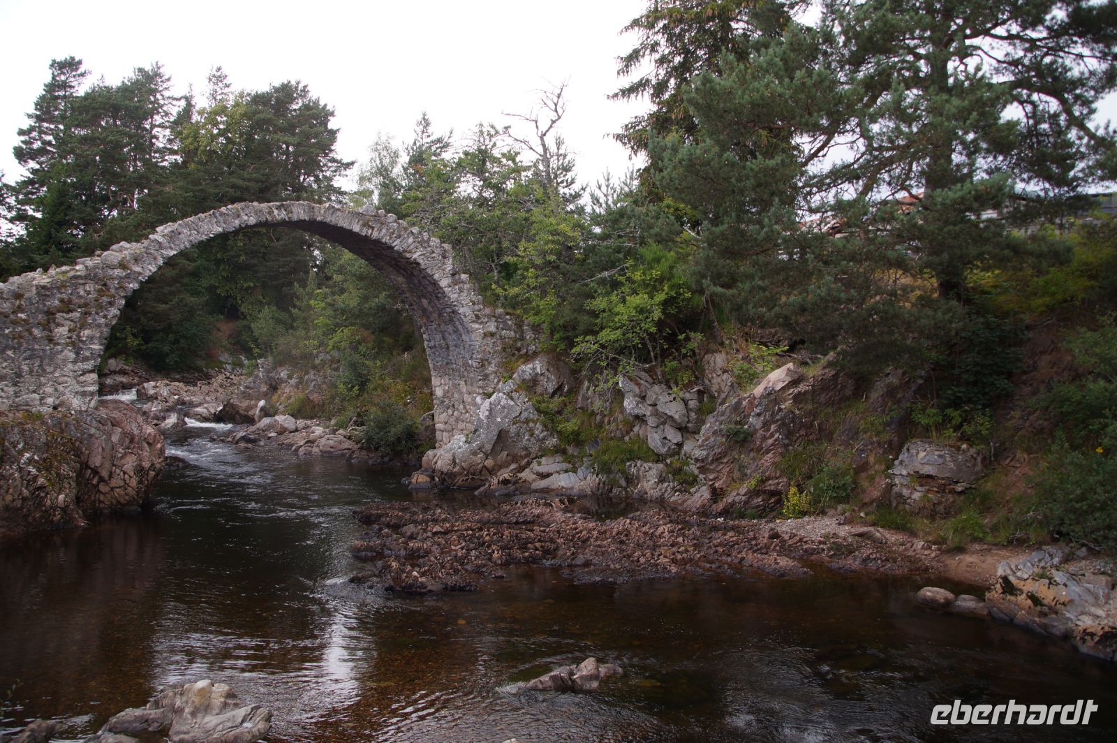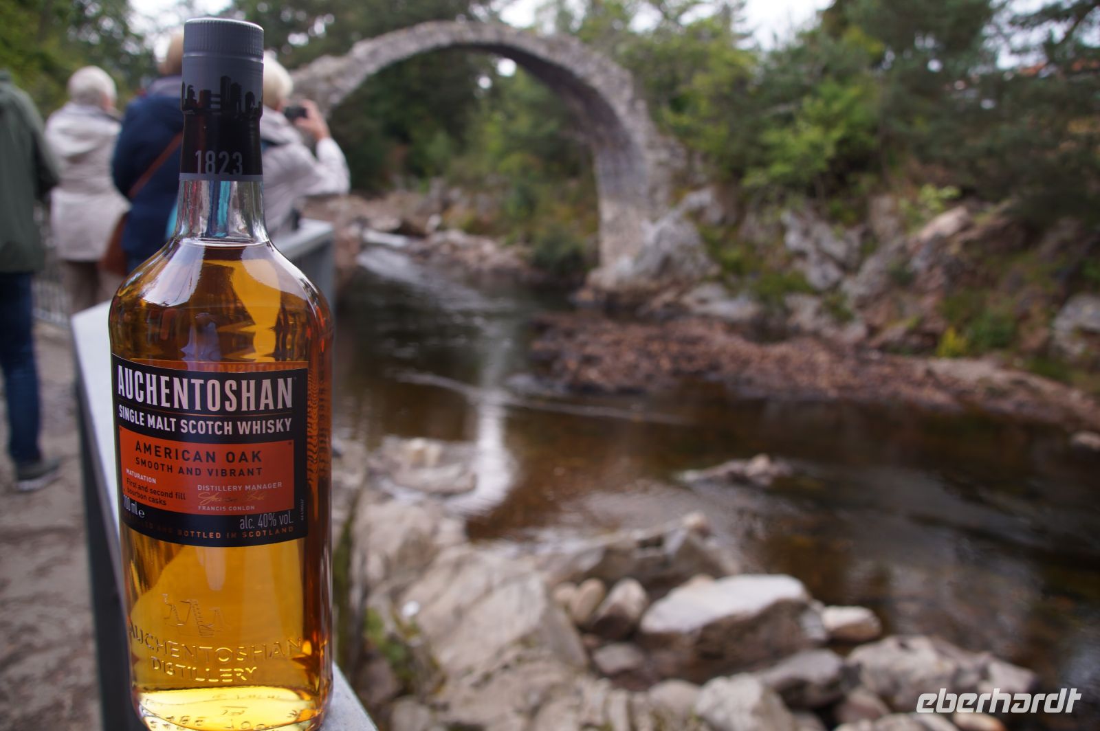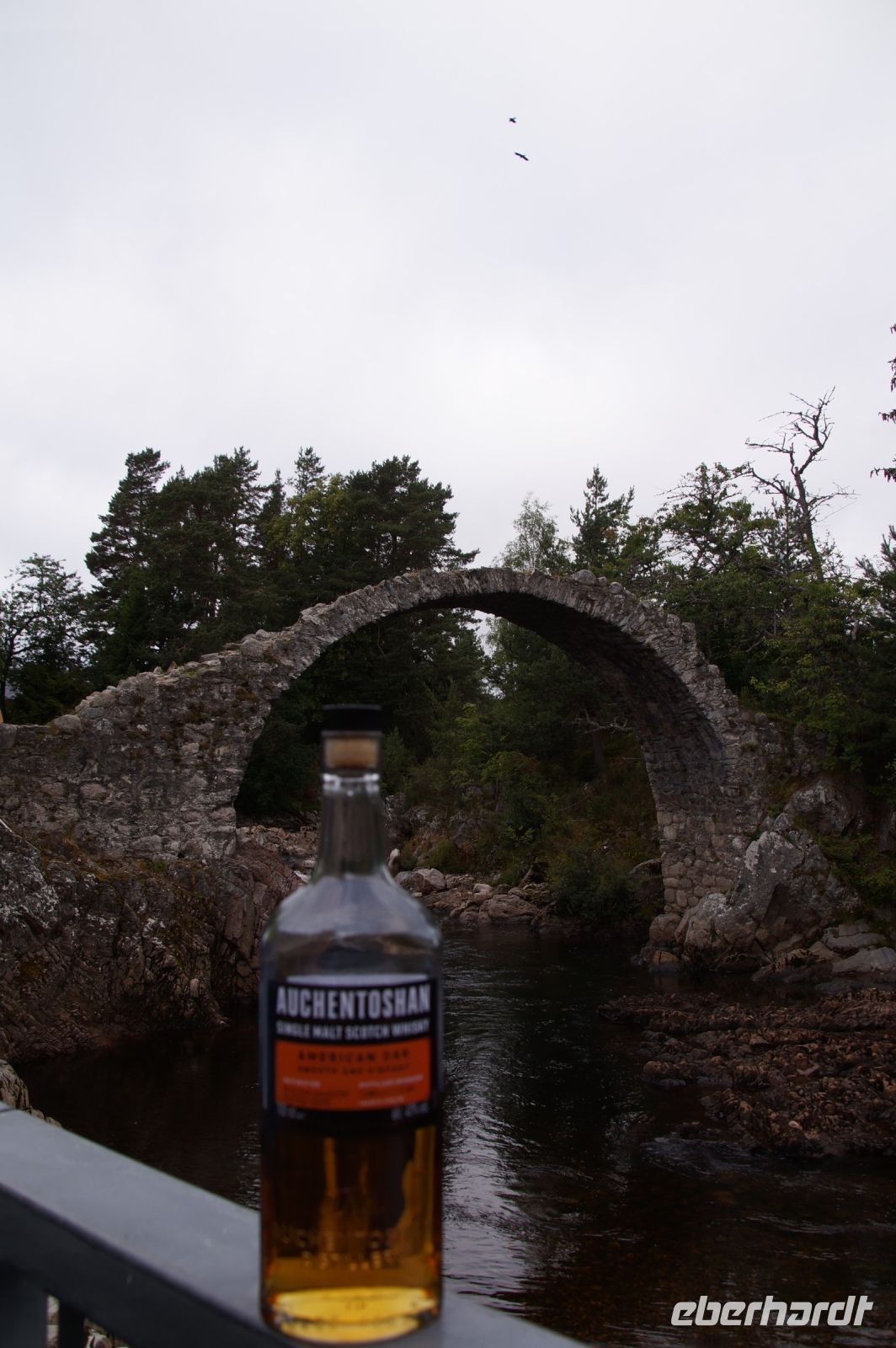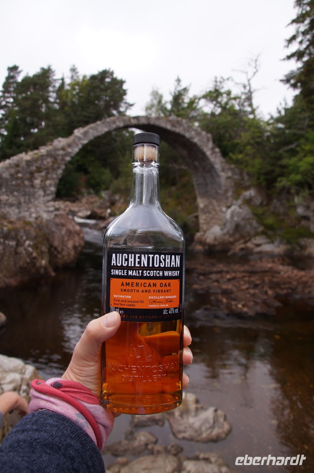 Zunächst aber hielten wir an der Horse Pack Bridge in Carrbridge. Dort probierten wir als Einstieg in den Tag einen Auchentoshin, einen Whisky, der wegen seiner Milde als "Frühstücks-Whisky" belächelt wird. Slaínte! ("ßlontscha")