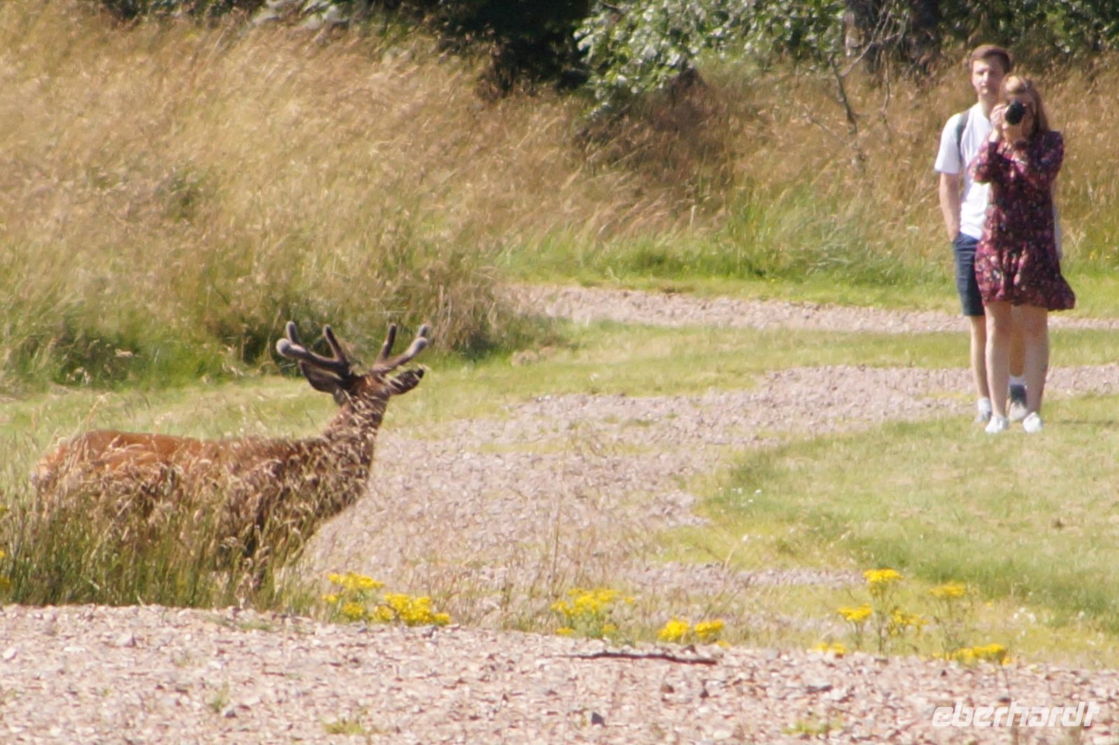 Wir verließen die Burg also per Boot, wobei das nicht ganz korrekt ist: die heutigen Bootsanleger sind von der Burg aus nur durch das Landtor zu erreichen. Wer wollte konnte sich an Deck den Wind um die Ohren wehen lassen und in der Sonne brutzeln. Wer aber nicht stolz von sich behaupten wollte „I got sunburnt in Scotland“ („Ich habe mir in Schottland einen Sonnenbrand geholt“), suchte sich ein schattigeres Plätzchen unter Deck.