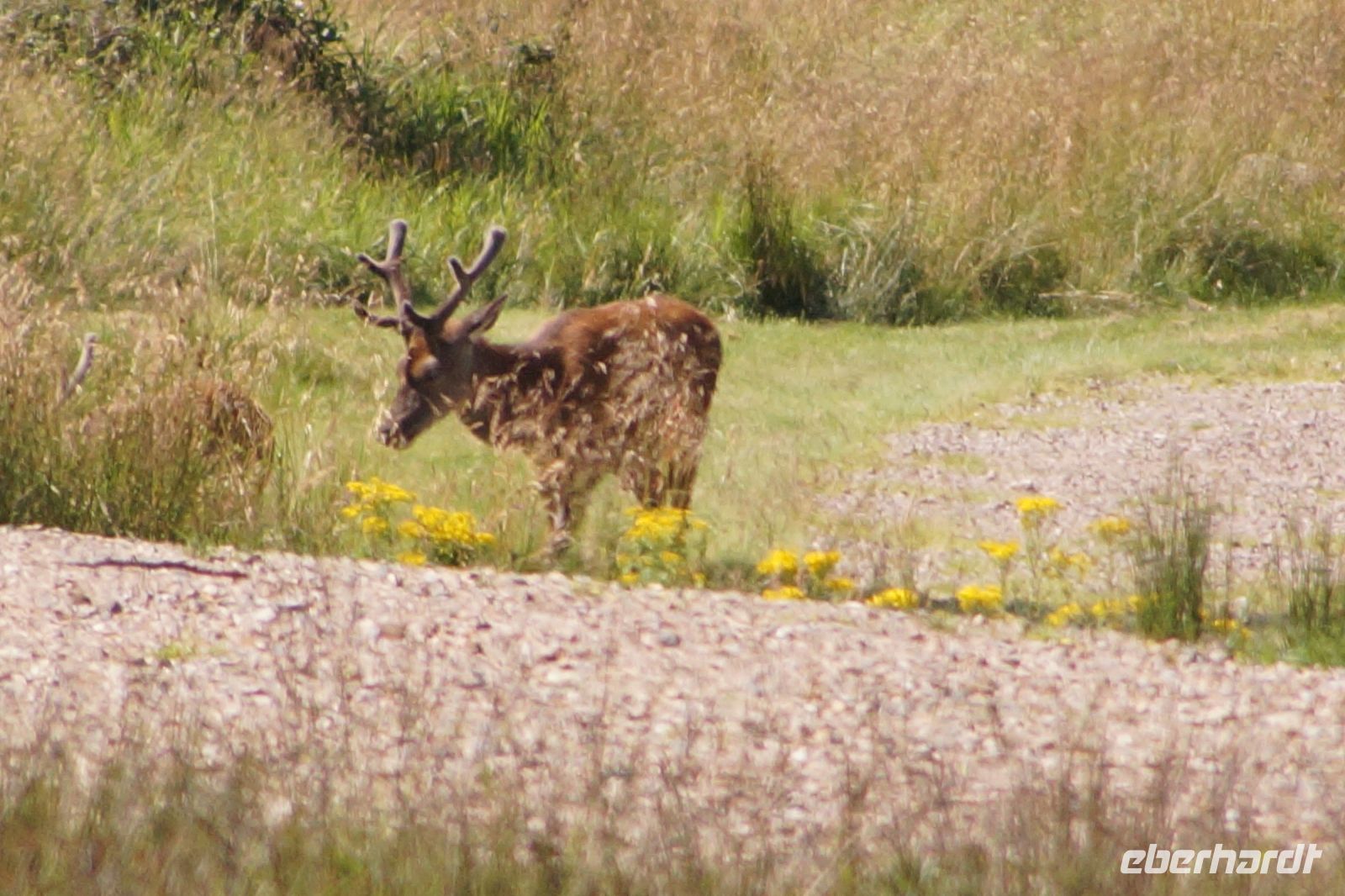 Unser erstes Ziel heute war Chanonry Point. Die Kanoniker-Spitze. Eine Halbinsel die in den Firth of Moray hineinragt. Sie hat ihren Namen, weil die Kanoniker von Fortrose (dort gab es eine Kathedrale) dort immer spazieren gingen. Fast im Gänsemarsch folgten wir der Straße, die zwischen den Löchern des Golfplatzes herführte. Auch heute war es wieder etwas windig, damit mussten die Golfspieler klarkommen. Unser Ziel war die Spitze von Chanonry Point. Der Musiker von vorgestern hatte uns vorgewarnt: Delphine seht ihr nur bei Flut und die läuft erst gegen 14:00 auf. Hm... trotzdem liefen wir dorthin. Vielleicht würden wir wenigstens eine Kegelrobbe sehen.