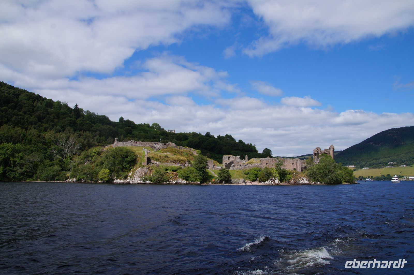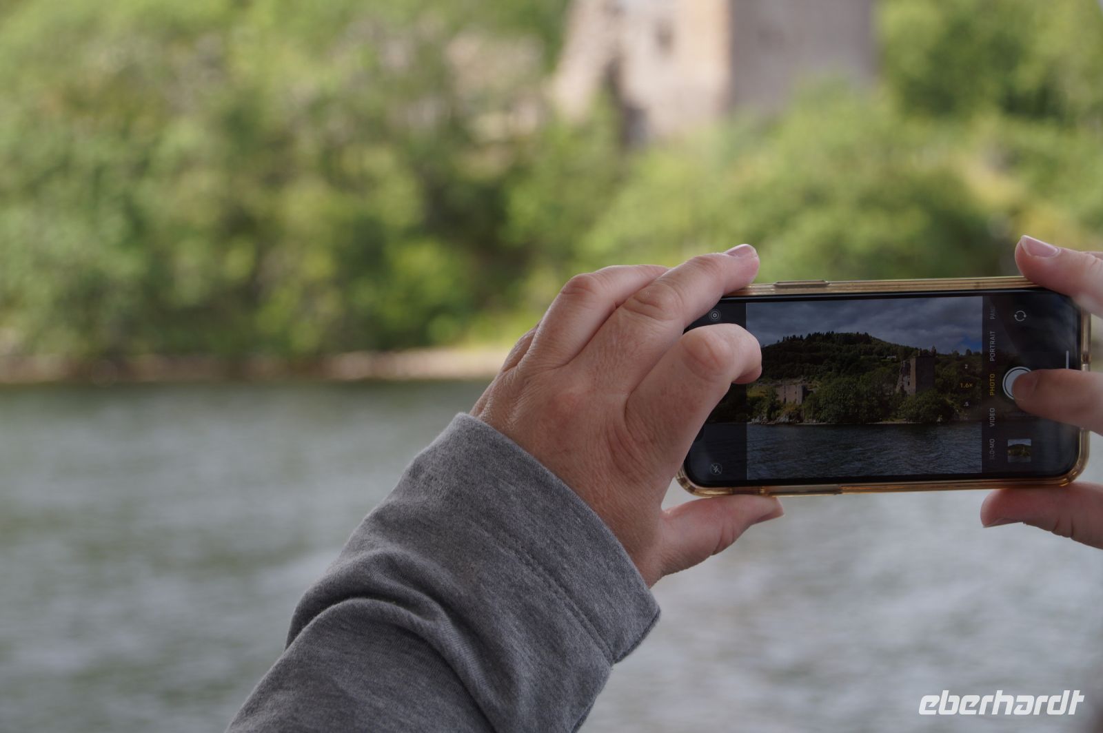 Weiter ging es vorbei an den verschiedenen Lochs des Great Glen, bis wir endlich am Urquhart („Örket“) Castle ankamen, dem Hot Spot für Beobachtungen des Wesens mit dem wissenschaftlichen Namen Nessiteras rhombopteryx. Hm... es war kurz vor 11:00, um 11:30 sollte unser Boot gehen. Kaum Zeit sich die Burg oder den Einführungsfilm anzusehen, auf die Toilette zu gehen, im Shop zu stöbern etc. Ich sprach noch mal mit den Mitarbeitern, ob wir nicht ein Boot eine Stunde später nehmen könnten. „Theoretisch ja, aber nicht zum Dochgarrach Lock, sondern zum Clansman Hotel.“ Naja, Hauptsache, die Gäste haben Zeit, sich Urquhart Castle anzuschauen. Also WhatsApp geschrieben, Teilnehmer abgefangen und gesucht und die Schiffsfahrkarten ausgetauscht.