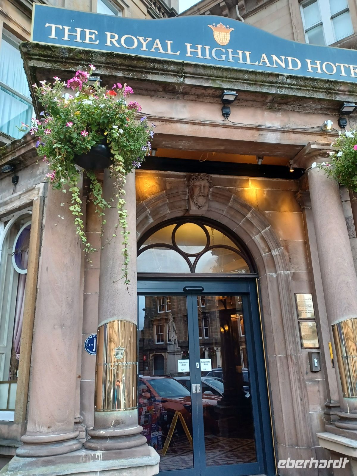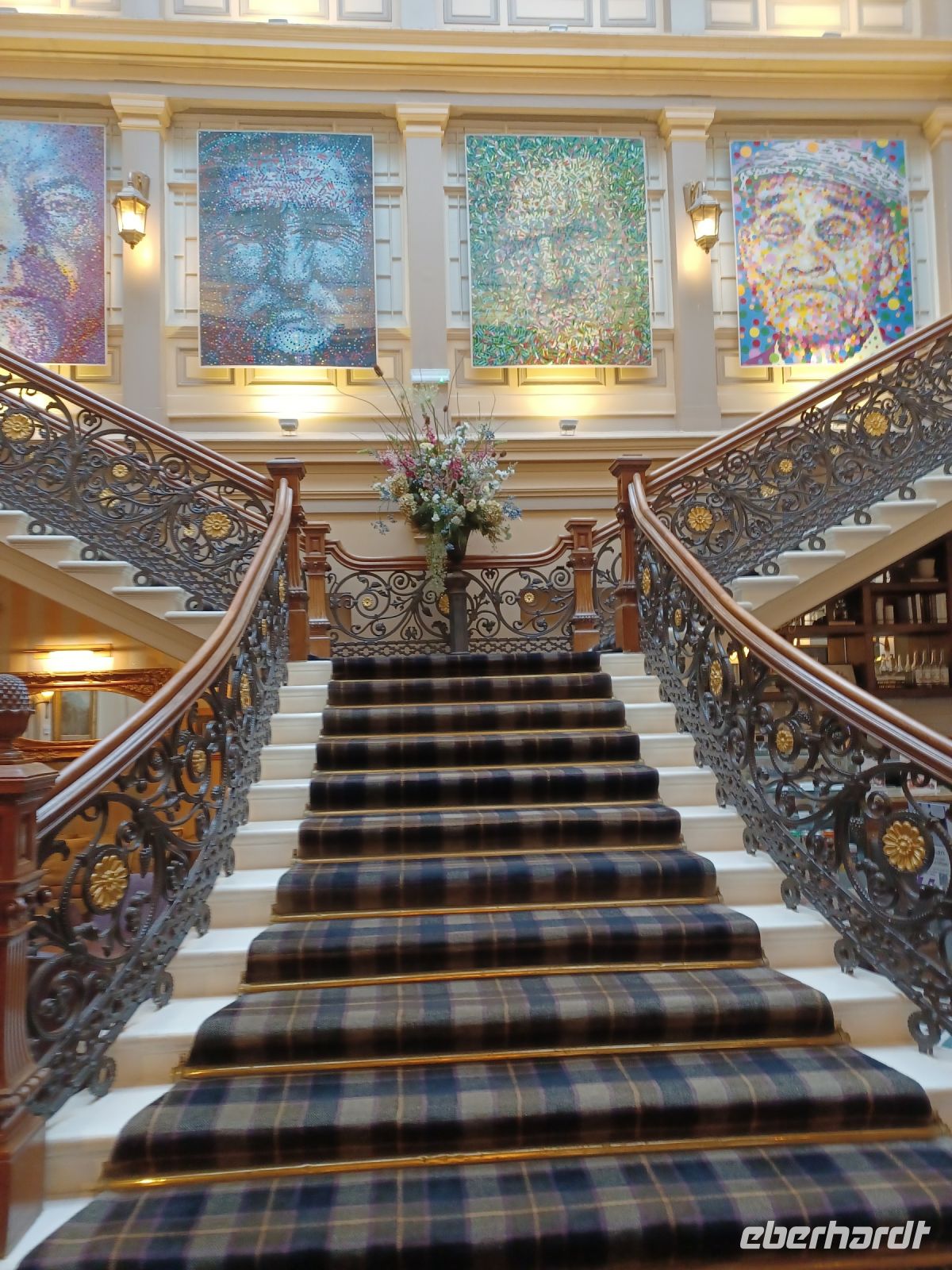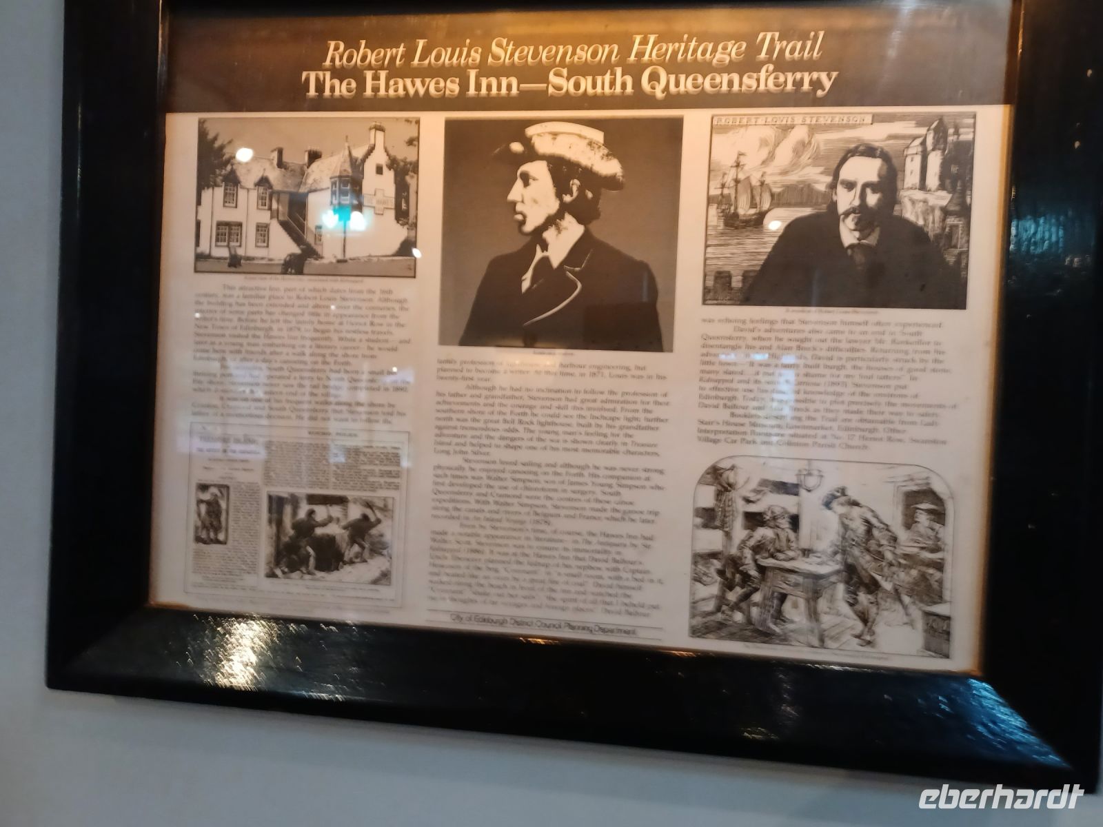 Krönungsthron eingearbeitet wurde. Zur Krönung von Charles III. im Mai 2023 wurde der Stein nach London ausgeliehen und befindet sich wieder im Edingburgh Castle. Am späten Nachmittag verabschieden wir uns vom Scone Palace und fahren nun zum letzten Zielort der Rund-reise durch das schöne Schottland – Edinburgh. Wir erreichen die Hauptstadt der Schotten am Firth of Forth, der durch seine ihn überquerenden 3 Brücken ein herrliches Fotomotiv bietet. Deshalb machen wir vor dem Einchecken im Hotel einen kleinen Besuch im Stadtteil Queensferry, wo sich tolle Fotomotive bieten und wir den kleinen Pub„Hawes Inn“ besuchen. Hier schrieb der in Edinburgh geborene schottische Nationaldichter, Robert Lous Stevenson, seine Reiseliteratur und die weltweit bekannten „Geschichten von Dr. Jekyll und Mr. Hyde“ bevor er nach Samoa aus-wanderte und dort starb. Am Abend erreichen wir unser Hotel im Stadtteil Haymarket und gehen nach dem Einchecken zu einem hübschen Pub, um die dortige Atmosphäre und das Dinner zu genießen. Wiederum hatten wir heute einen tollen Tag und freuen uns, dass wir nun 3 Nächte in dem schönen Hotel schlafen können.