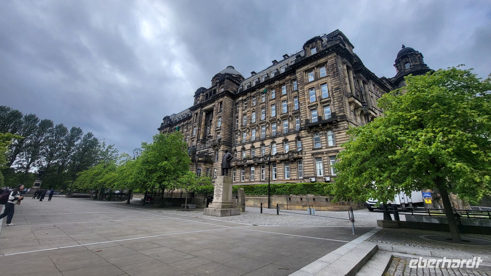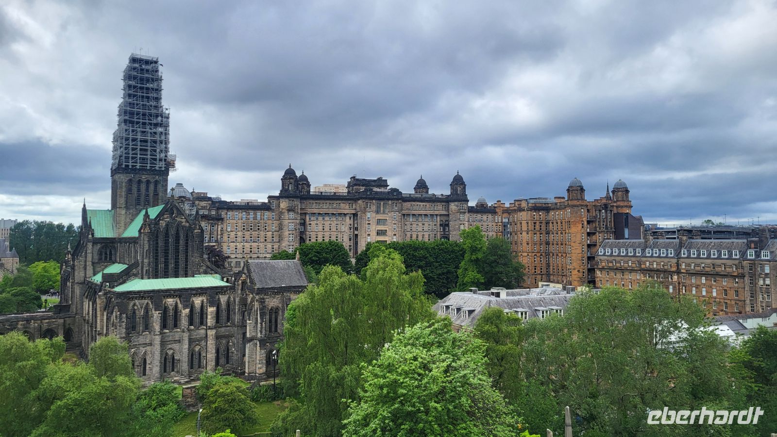 Weiter geht es durch die belebte Innenstadt. Der Verkehr ist dicht, aber wir lassen uns davon nicht stören und genießen die Fahrt durch die Straßen der Stadt. Die Architektur fällt uns sofort ins Auge: prunkvolle viktorianische Fassaden, elegante Sandsteingebäude und moderne Glasbauten stehen dicht beieinander und erzählen von Glasgows industrieller Vergangenheit und seinem kulturellen Wandel. Wir erkunden sowohl das geschäftige Zentrum als auch das charmante West End mit seinen eleganten Stadthäusern, kleinen Boutiquen und grünen Parks.