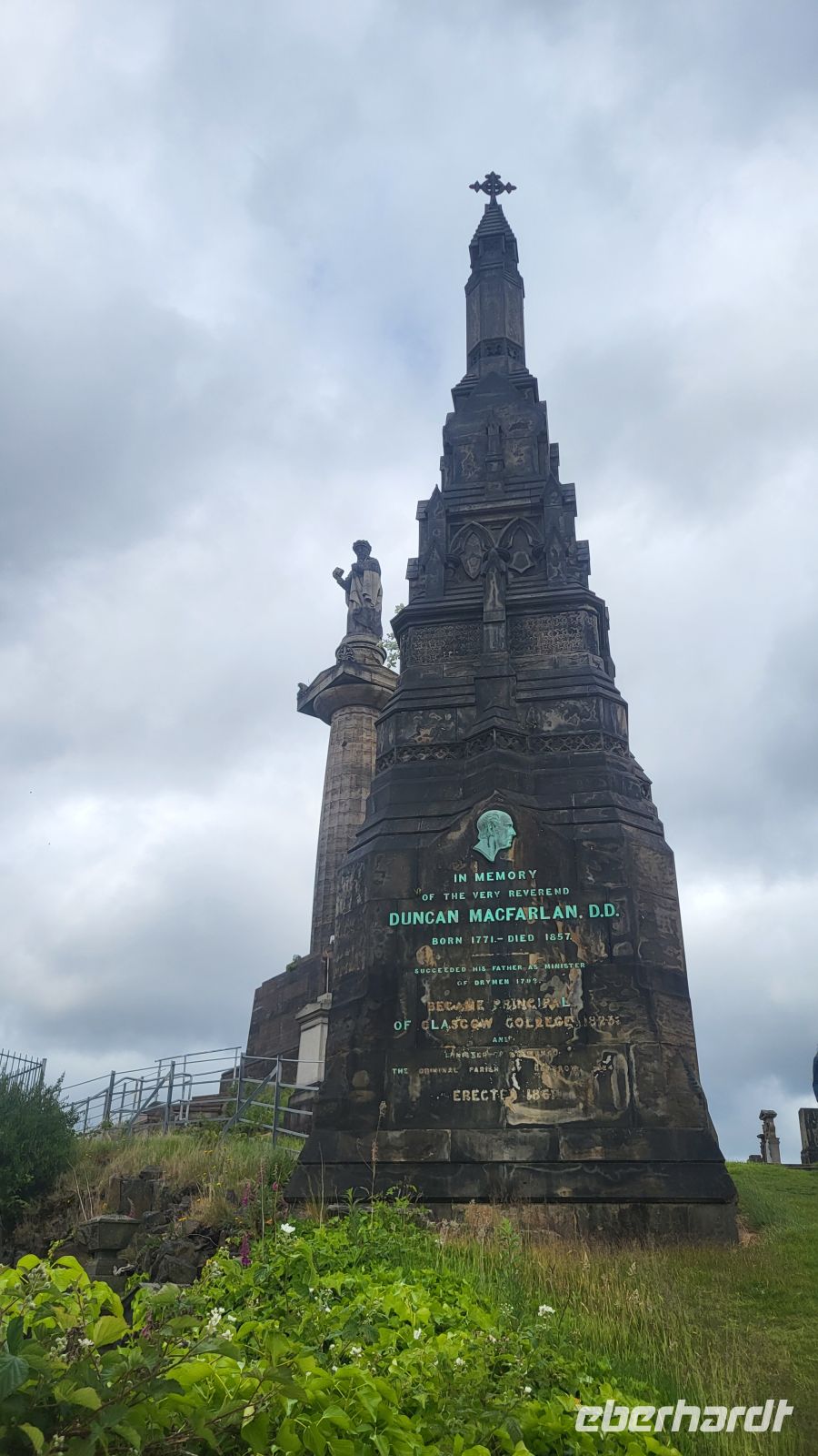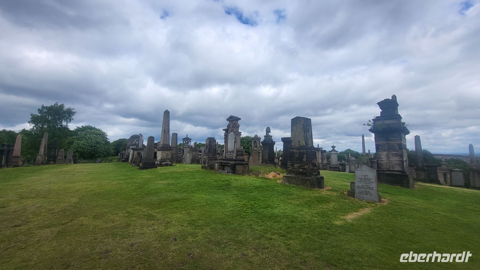Unser erster Halt ist die imposante St Mungo’s Cathedral. Das gotische Bauwerk mit seinen dunklen Steinmauern wirkt beinahe mystisch. Direkt hinter der Kathedrale steigen wir hinauf zur Necropolis, dem historischen viktorianischen Friedhof auf einem Hügel mit Blick über die Stadt. Zwischen verwitterten Grabsteinen und eindrucksvollen Mausoleen entdecken wir kunstvoll geschmiedete, bunte Gitter – ein ungewöhnlicher, aber faszinierender Anblick. Jutta erzählt uns von den Geschichten bedeutender Persönlichkeiten Glasgows, die hier ihre letzte Ruhe gefunden haben.
