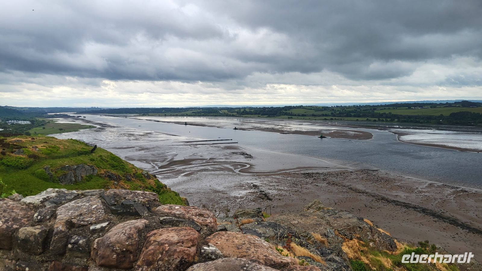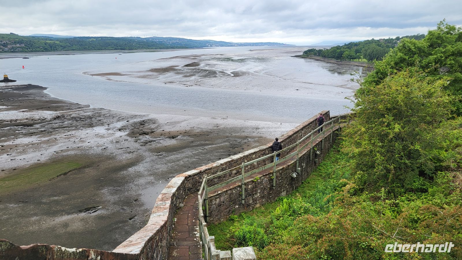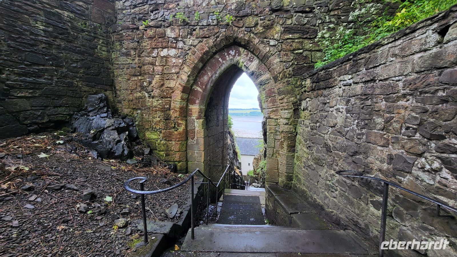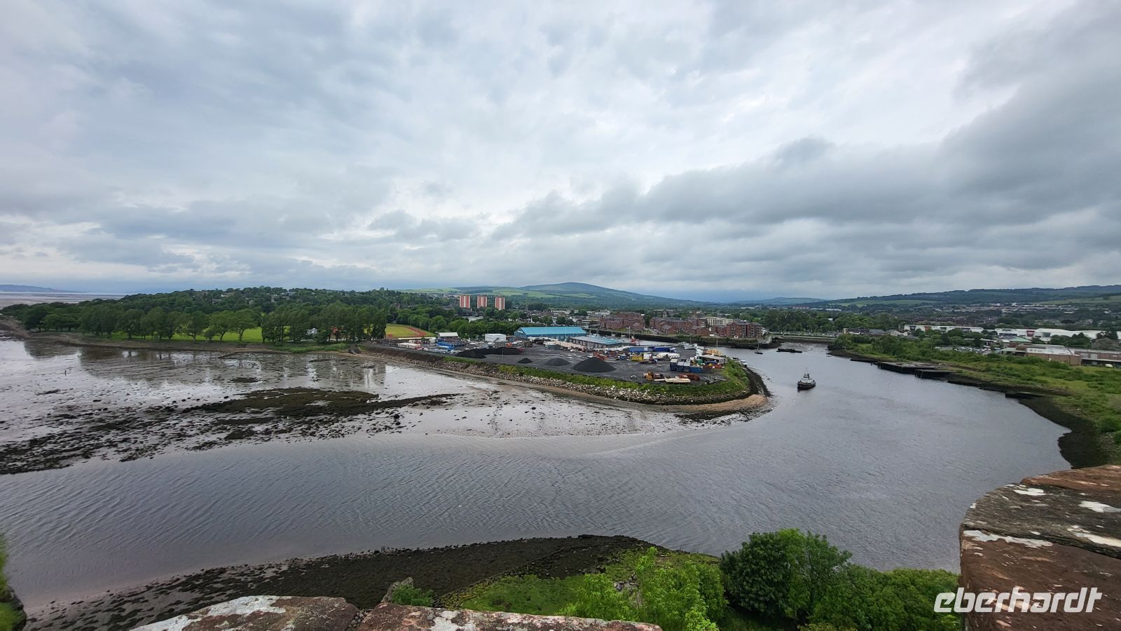 Unser erster Halt ist Dumbarton Castle, eine beeindruckende Festungsanlage auf einem vulkanischen Felsen direkt am Fluss Clyde. Schon von unten wirkt das Gelände imposant – und umso mehr, als wir die zahlreichen steilen Treppenstufen erklimmen, die zu den Überresten der Burganlage führen. Oben angekommen, werden wir mit einem atemberaubenden Blick über das Flusstal belohnt. Im Moment ist Ebbe, und so sehen wir das teilweise freigelegte Flussbett des Clyde.