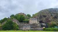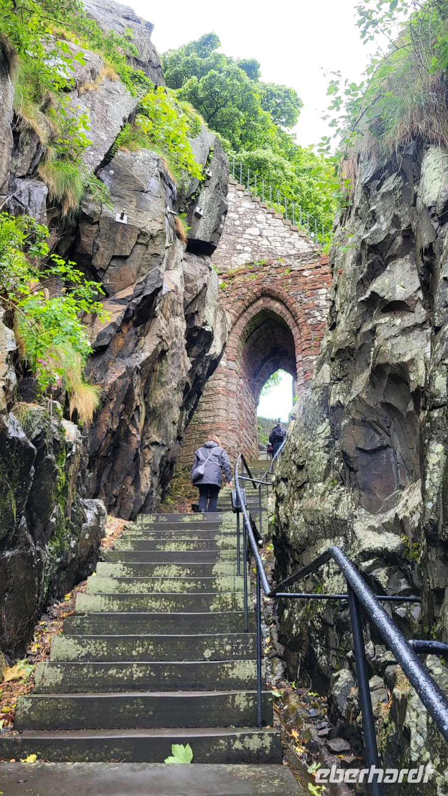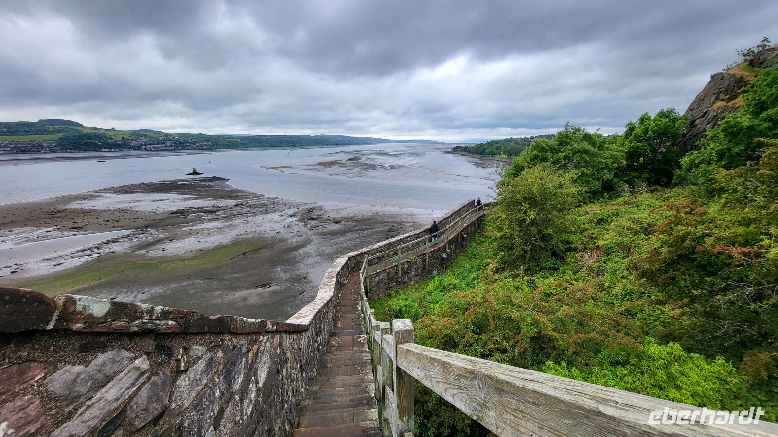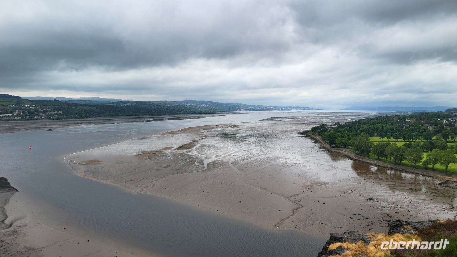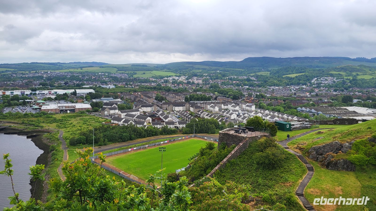 Unser erster Halt ist Dumbarton Castle, eine beeindruckende Festungsanlage auf einem vulkanischen Felsen direkt am Fluss Clyde. Schon von unten wirkt das Gelände imposant – und umso mehr, als wir die zahlreichen steilen Treppenstufen erklimmen, die zu den Überresten der Burganlage führen. Oben angekommen, werden wir mit einem atemberaubenden Blick über das Flusstal belohnt. Im Moment ist Ebbe, und so sehen wir das teilweise freigelegte Flussbett des Clyde.