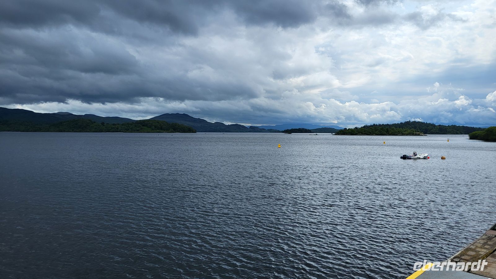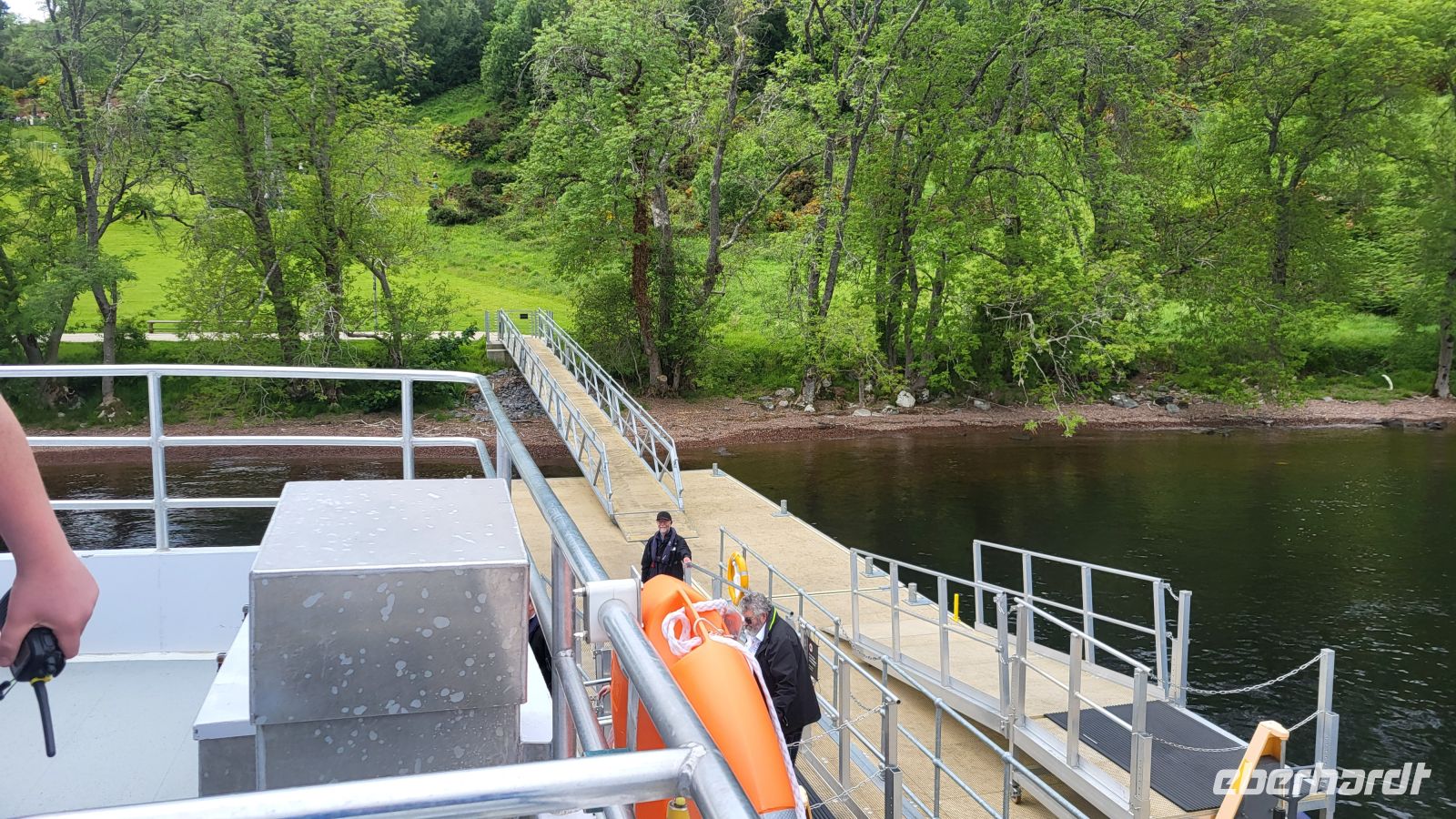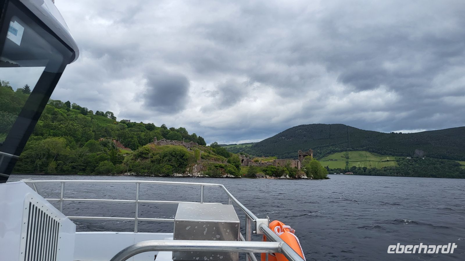Vom Burggelände aus setzen wir unsere Reise auf dem Wasser fort. Wir gehen an Bord eines Ausflugsschiffes, das uns in gemächlichem Tempo gen Norden fährt. Die Stimmung auf dem See ist ruhig und fast mystisch. Umgeben von sanften Hügeln und unter tief hängenden Wolken gleiten wir über das dunkle Wasser bis nach Dochgarroch. Dort steigen wir wieder in unseren Bus und setzen die Fahrt fort.
