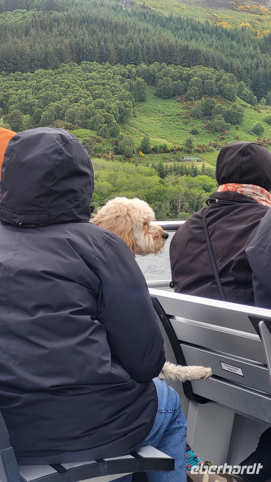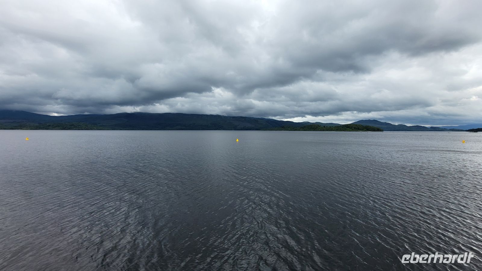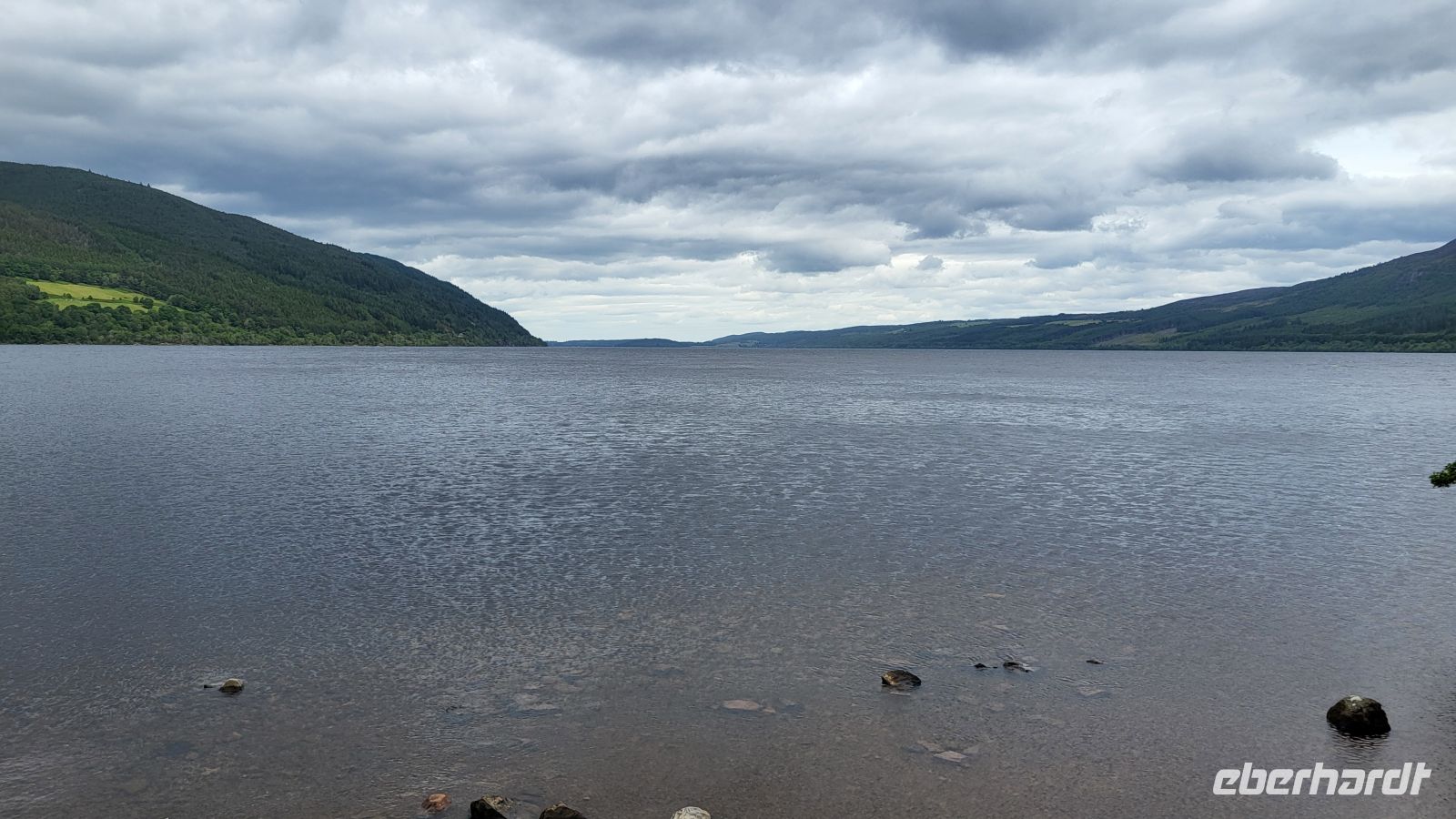 Vom Burggelände aus setzen wir unsere Reise auf dem Wasser fort. Wir gehen an Bord eines Ausflugsschiffes, das uns in gemächlichem Tempo gen Norden fährt. Die Stimmung auf dem See ist ruhig und fast mystisch. Umgeben von sanften Hügeln und unter tief hängenden Wolken gleiten wir über das dunkle Wasser bis nach Dochgarroch. Dort steigen wir wieder in unseren Bus und setzen die Fahrt fort.
