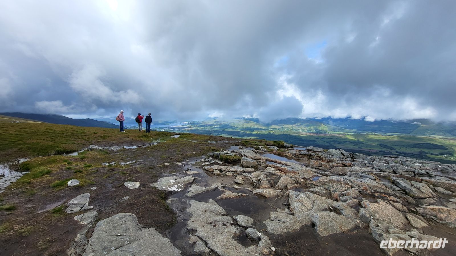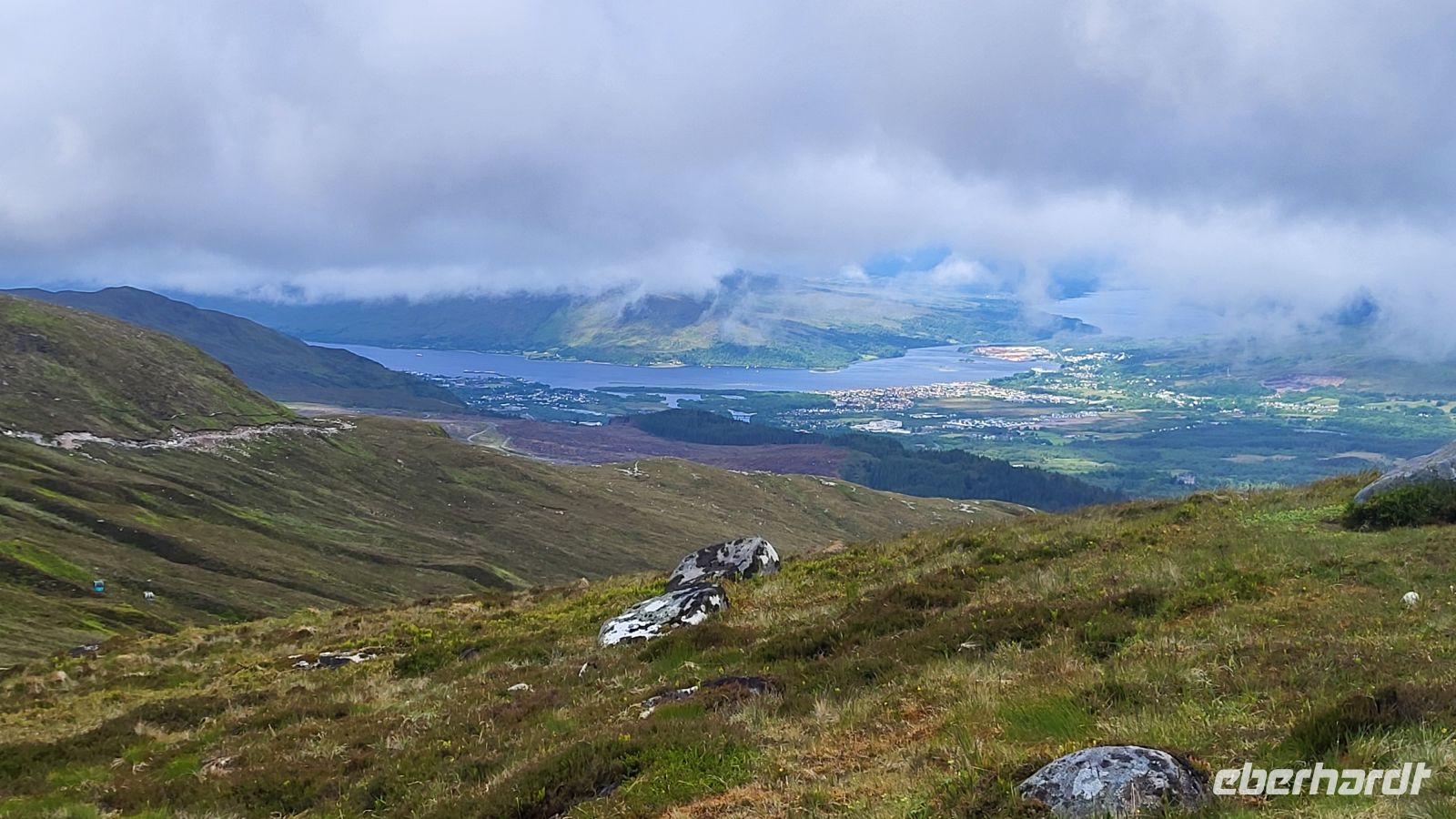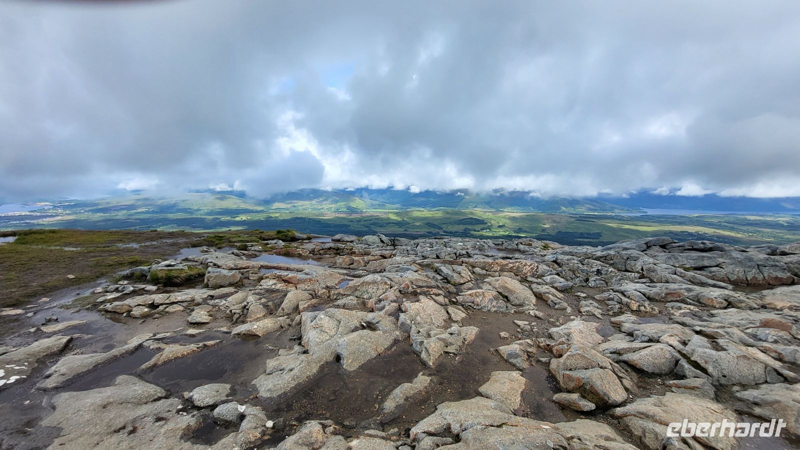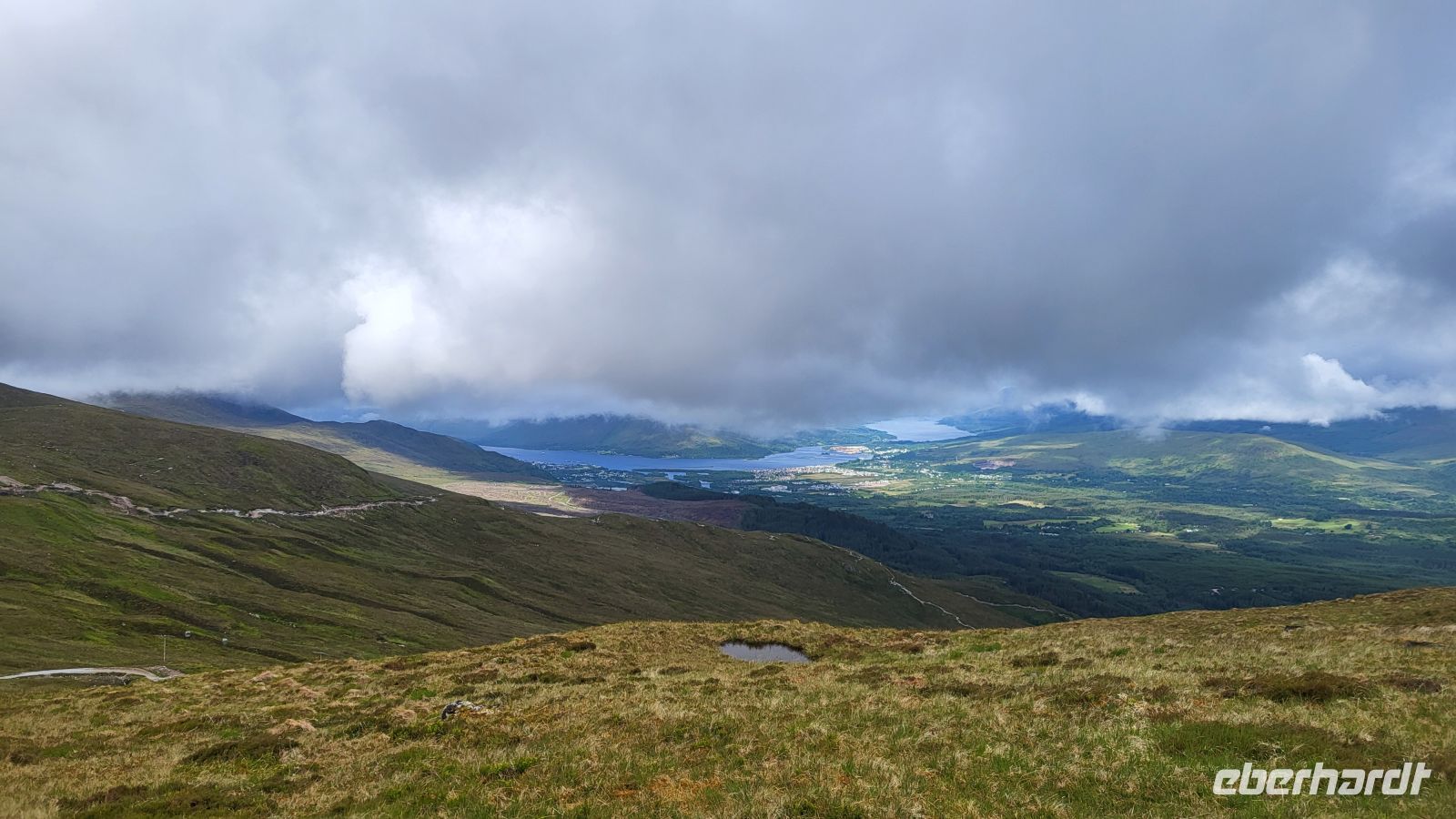 Schon auf dem Weg bieten sich beeindruckende Ausblicke über das Tal und Fort William. Die Wolken hängen tief und ziehen in schnellem Wechsel über die Berge hinweg, sodass sich das Licht und die Sicht beinahe minütlich verändern. Oben angekommen, weht uns ein kräftiger Wind entgegen. Trotzdem nehmen wir uns die Zeit, den Rundumblick zu genießen – über die Bergwelt der Highlands, das Tal und das unendlich wirkende Land dahinter.