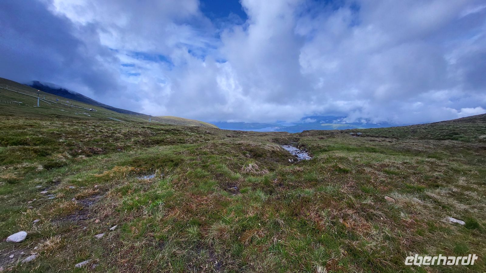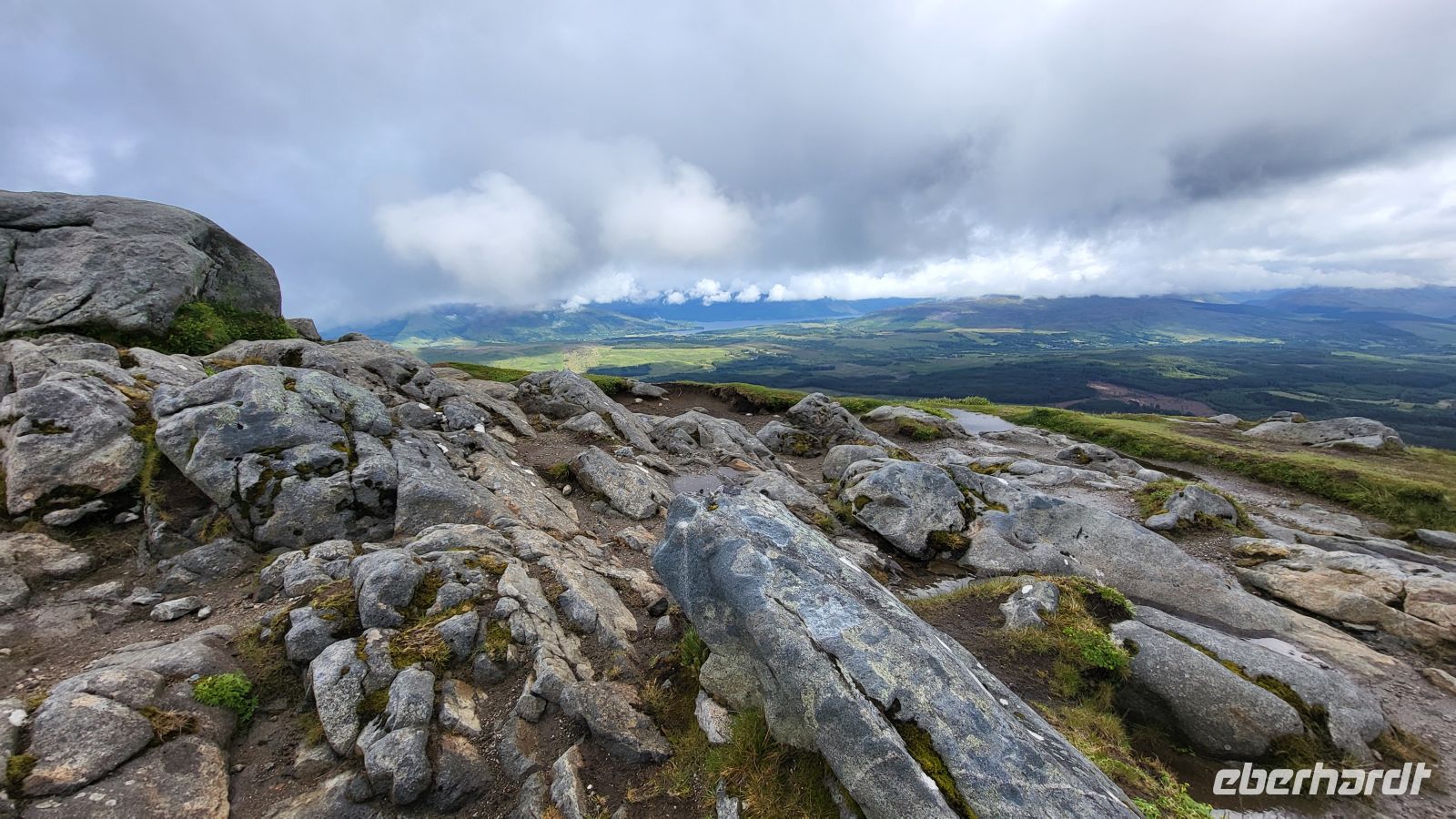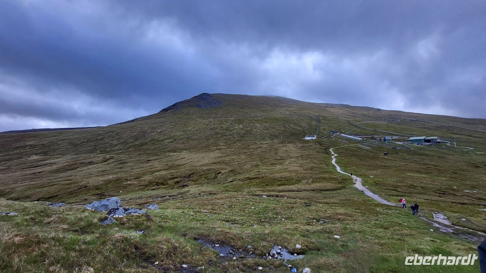 Schon auf dem Weg bieten sich beeindruckende Ausblicke über das Tal und Fort William. Die Wolken hängen tief und ziehen in schnellem Wechsel über die Berge hinweg, sodass sich das Licht und die Sicht beinahe minütlich verändern. Oben angekommen, weht uns ein kräftiger Wind entgegen. Trotzdem nehmen wir uns die Zeit, den Rundumblick zu genießen – über die Bergwelt der Highlands, das Tal und das unendlich wirkende Land dahinter.