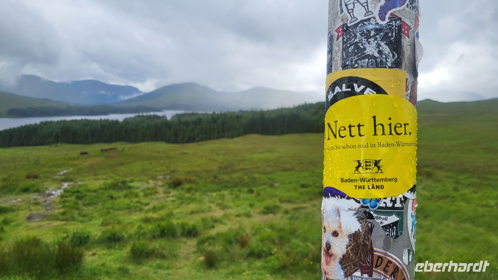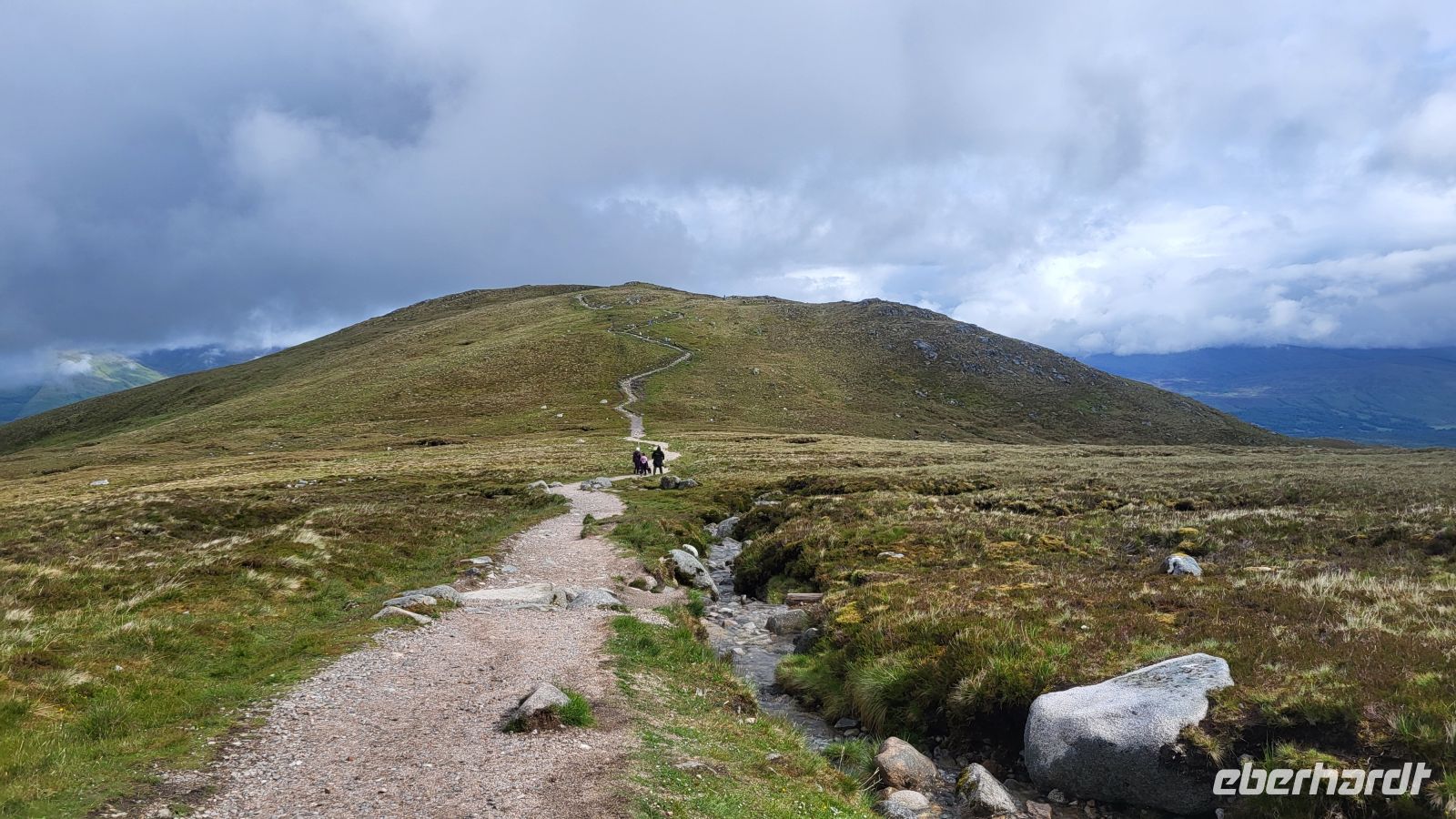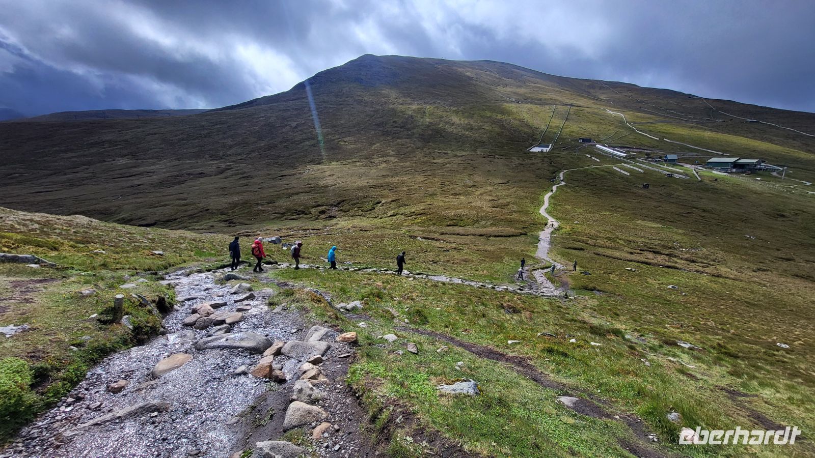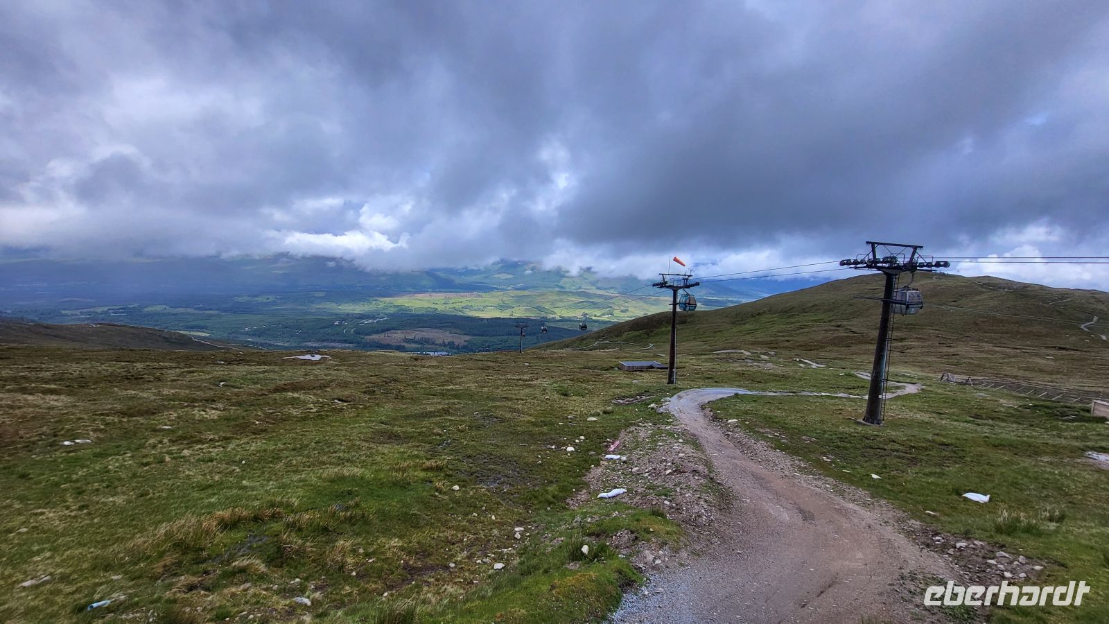 Schon auf dem Weg bieten sich beeindruckende Ausblicke über das Tal und Fort William. Die Wolken hängen tief und ziehen in schnellem Wechsel über die Berge hinweg, sodass sich das Licht und die Sicht beinahe minütlich verändern. Oben angekommen, weht uns ein kräftiger Wind entgegen. Trotzdem nehmen wir uns die Zeit, den Rundumblick zu genießen – über die Bergwelt der Highlands, das Tal und das unendlich wirkende Land dahinter.