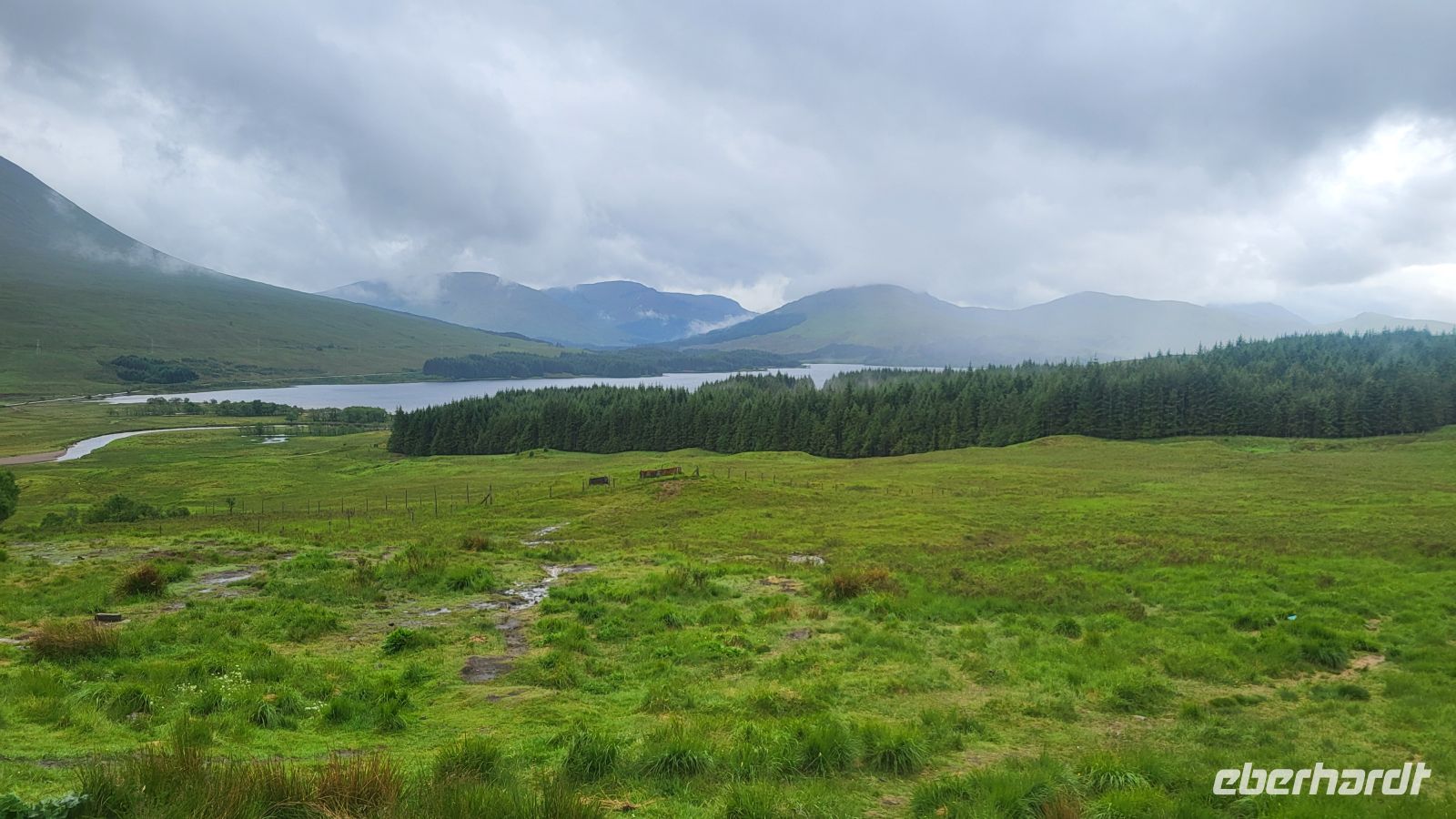 Anschließend beginnt eine besonders eindrucksvolle Etappe unserer Reise: Wir fahren eine enge, kurvige Straße hinauf in die Highlands. Doch John manövriert unseren Bus souverän und sicher durch jede noch so enge Biegung. Vor uns öffnet sich die wilde, raue Schönheit der schottischen Berge. Die Landschaft ist dramatisch und ursprünglich – mit steilen Hängen, grünen Tälern und plötzlichen Regenschauern, die wie aus dem Nichts über uns hinwegziehen.