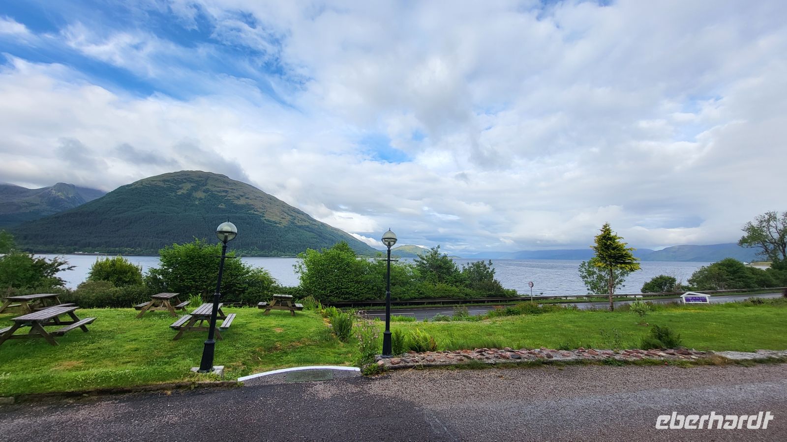 Unser erster Stopp liegt ganz im Süden des langgestreckten Sees: Fort Augustus. Der kleine Ort bietet einen wunderbaren Blick auf das Wasser, das sich dunkel und geheimnisvoll bis zum Horizont erstreckt. Wir nutzen die Gelegenheit für einen kurzen Spaziergang entlang des Kanals, bevor wir weiterfahren – denn das Highlight des Vormittags wartet bereits auf uns: Urquhart Castle.