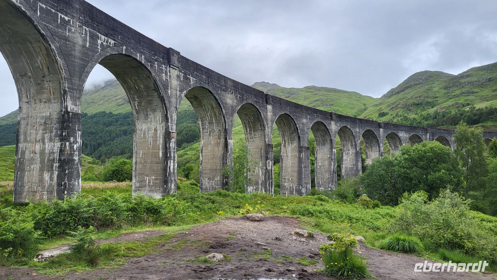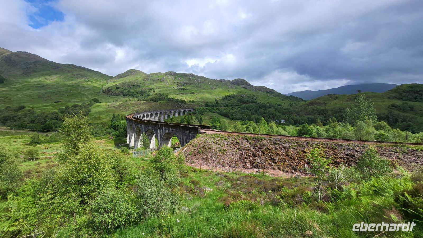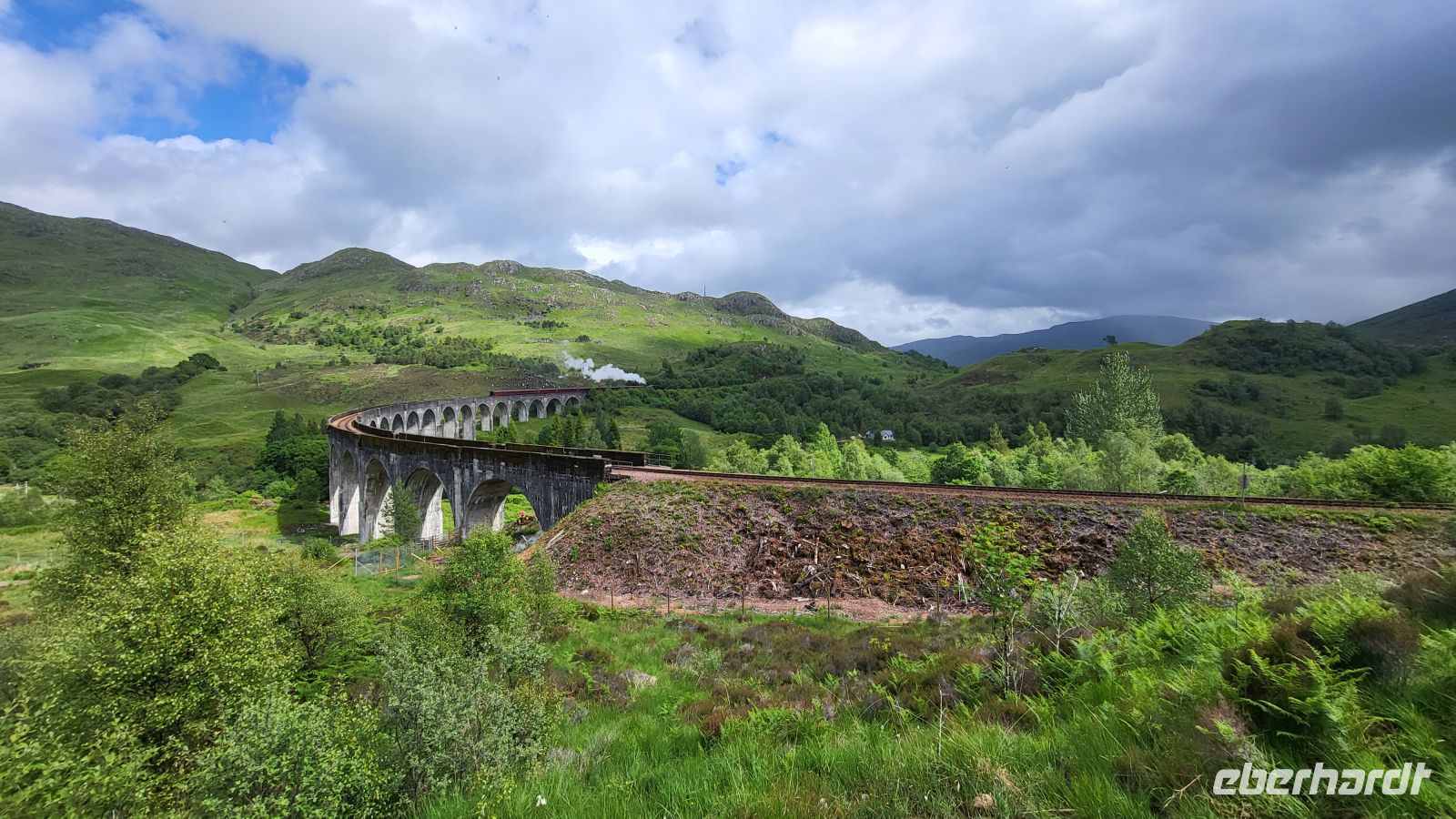 Das Viadukt ist nicht nur architektonisch beeindruckend, sondern auch filmisch weltberühmt: Hier fährt der „Jacobite Steam Train“, besser bekannt als der Hogwarts-Express aus den Harry-Potter-Filmen. Wir spazieren durch die hügelige Landschaft, steigen zum Aussichtspunkt hinauf und warten gespannt – mit Kameras im Anschlag. Der Zug verspätet sich etwas, aber dann hören wir es: ein markantes „Tut-Tut“, und kurz darauf schiebt sich die schwarze Dampflok mit ihrer weißen Rauchwolke über das Viadukt – ein magischer Moment, nicht nur für Harry-Potter-Fans.
