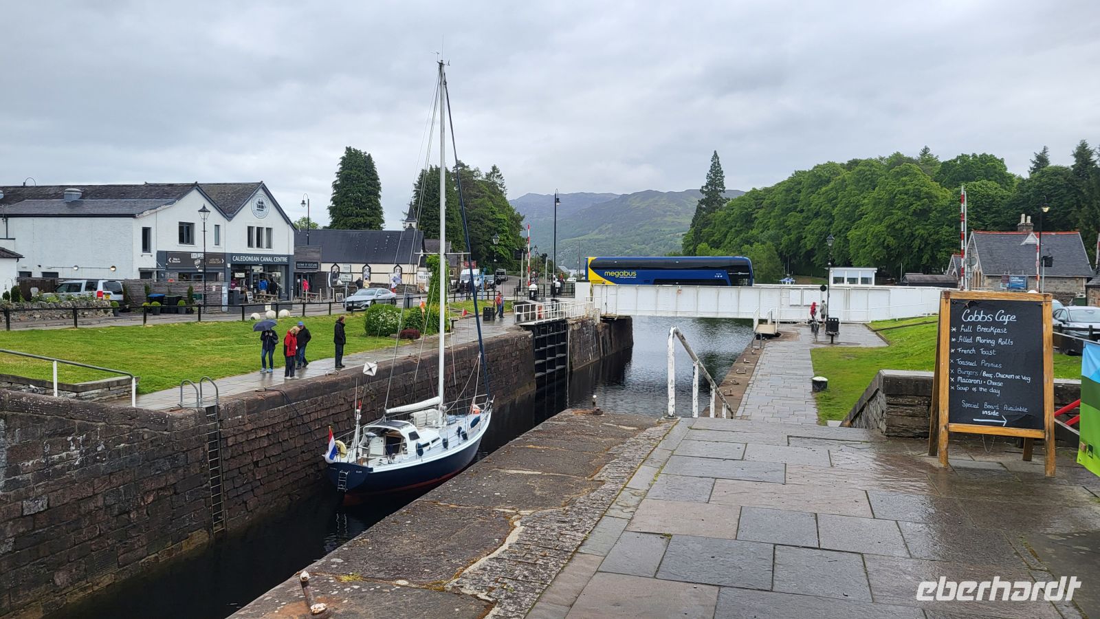 Unser nächster Stopp führt uns zur berühmten Schleusentreppe „Neptune’s Staircase“. Diese eindrucksvolle Konstruktion am Caledonian Canal besteht aus acht hintereinanderliegenden Schleusen und verbindet auf spektakuläre Weise den Atlantik mit der Nordsee. Heute bleibt es ruhig – kein Schiff passiert die Schleuse – aber die Dimensionen dieser Wasserbaukunst beeindrucken trotzdem.