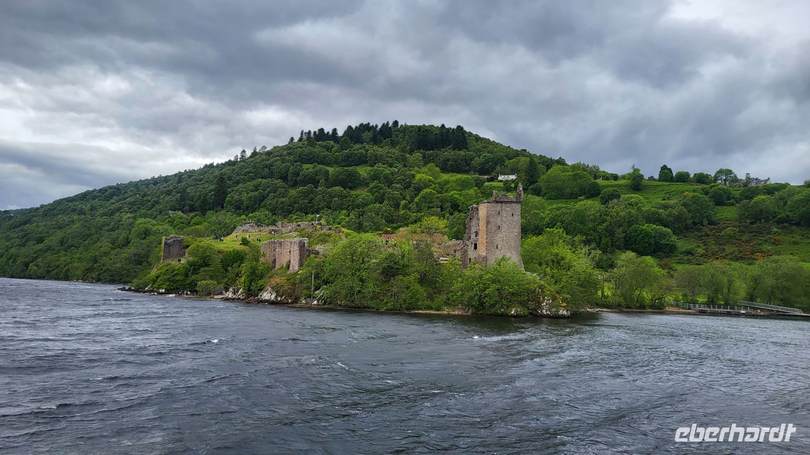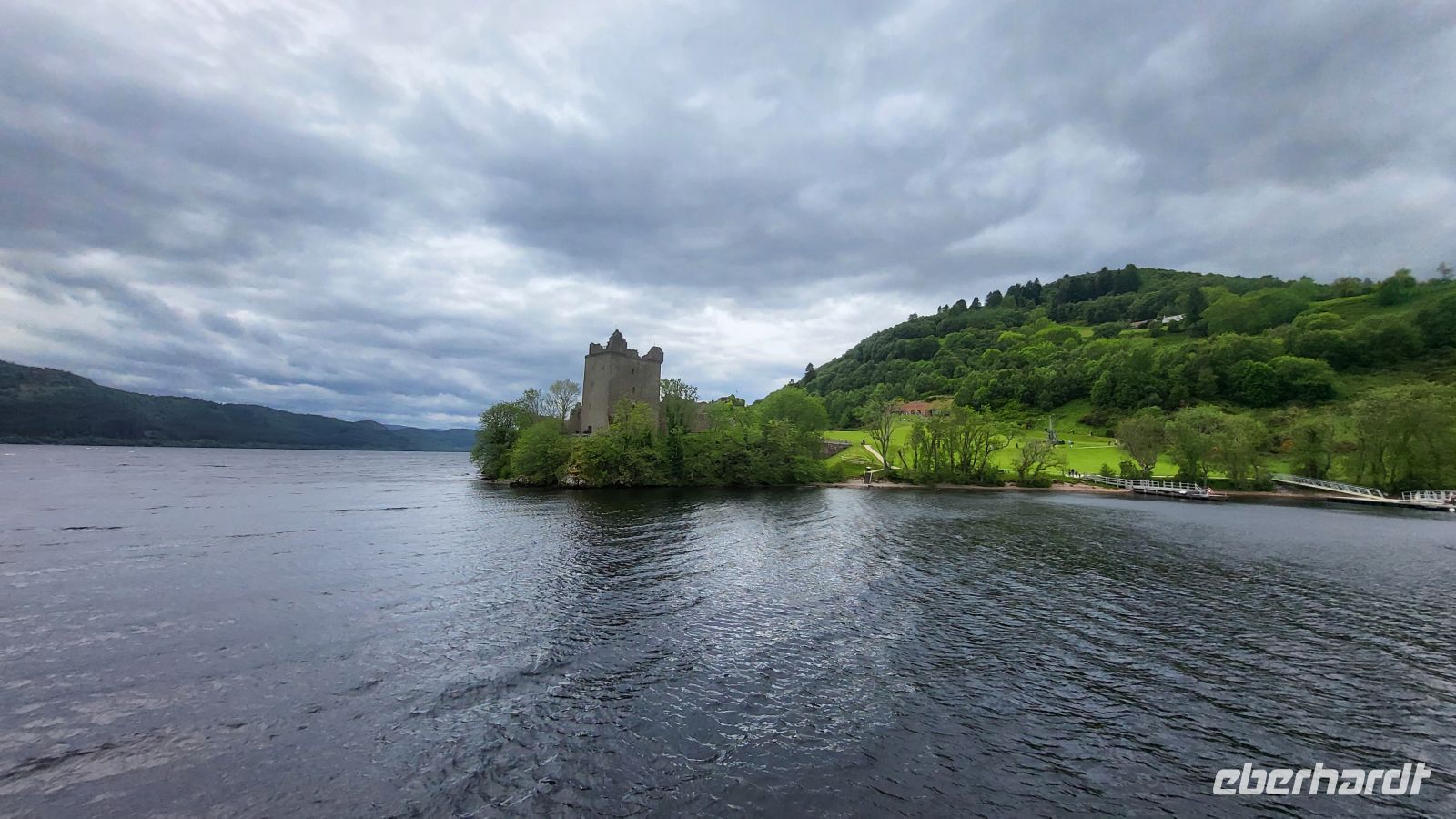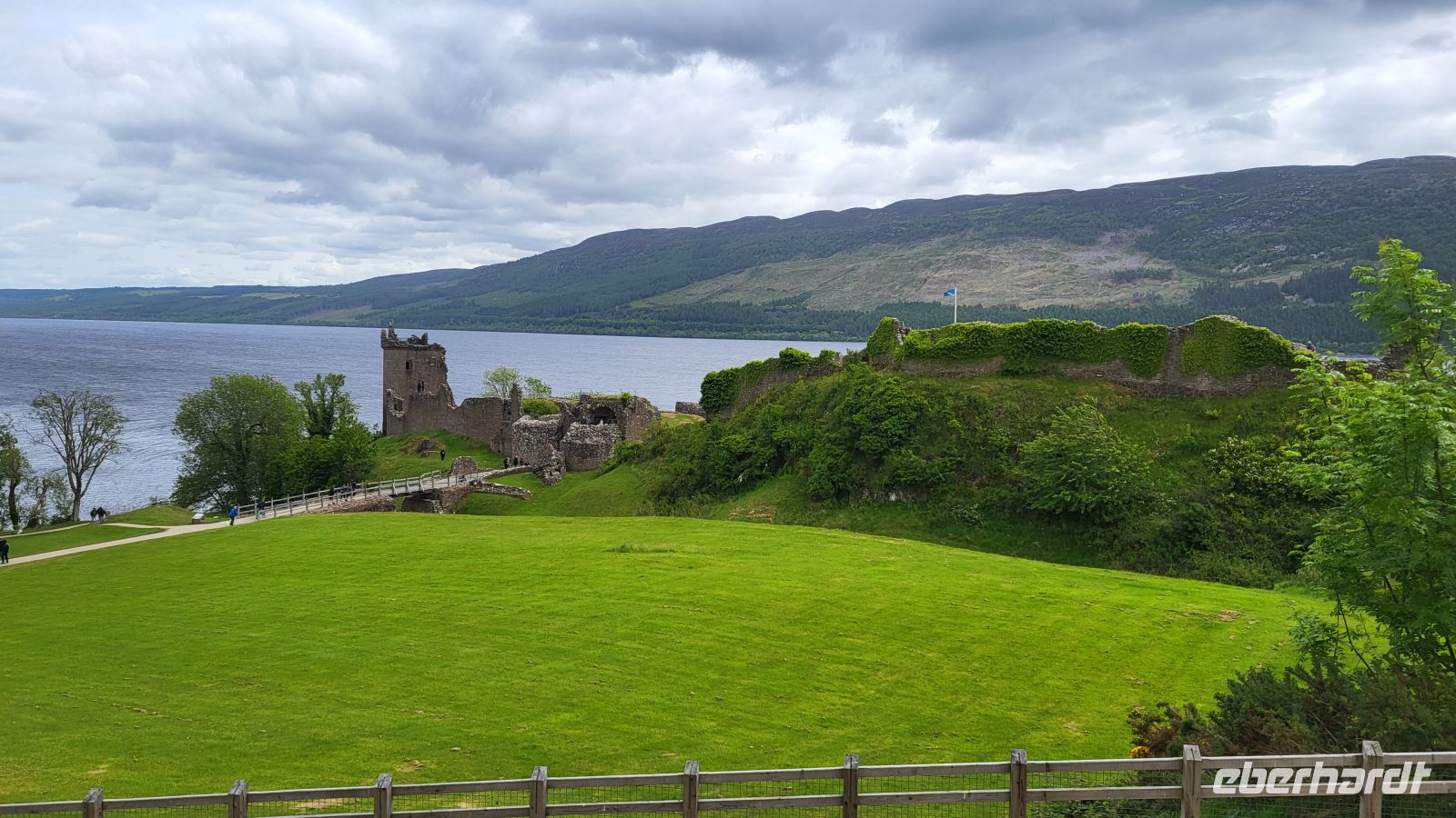 Die imposante Burgruine thront direkt am Ufer des Loch Ness. Bevor wir die Anlage betreten, sehen wir uns ein kurzes Informationsvideo an, das die dramatische Geschichte der Burg lebendig werden lässt – von königlichen Machtkämpfen über Clan-Kriege bis zu ihrer endgültigen Zerstörung im 17. Jahrhundert. Anschließend erkunden wir das Gelände auf eigene Faust: die Wachtürme, die mächtigen Mauern und die weiten Ausblicke auf den See. Das Wasser ist erstaunlich klar – aber gleichzeitig so tief und dunkel, dass es beinahe pechschwarz wirkt. Natürlich halten wir Ausschau nach Nessie, dem sagenumwobenen Seeungeheuer, aber leider zeigt sich das Ungeheuer heute nicht.