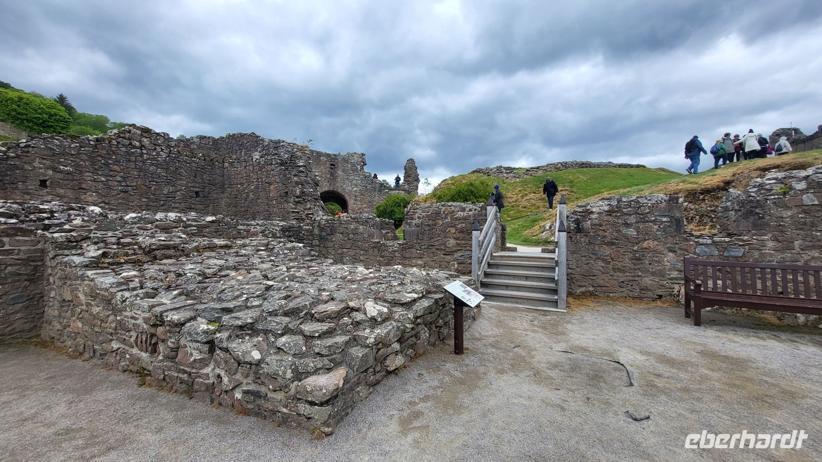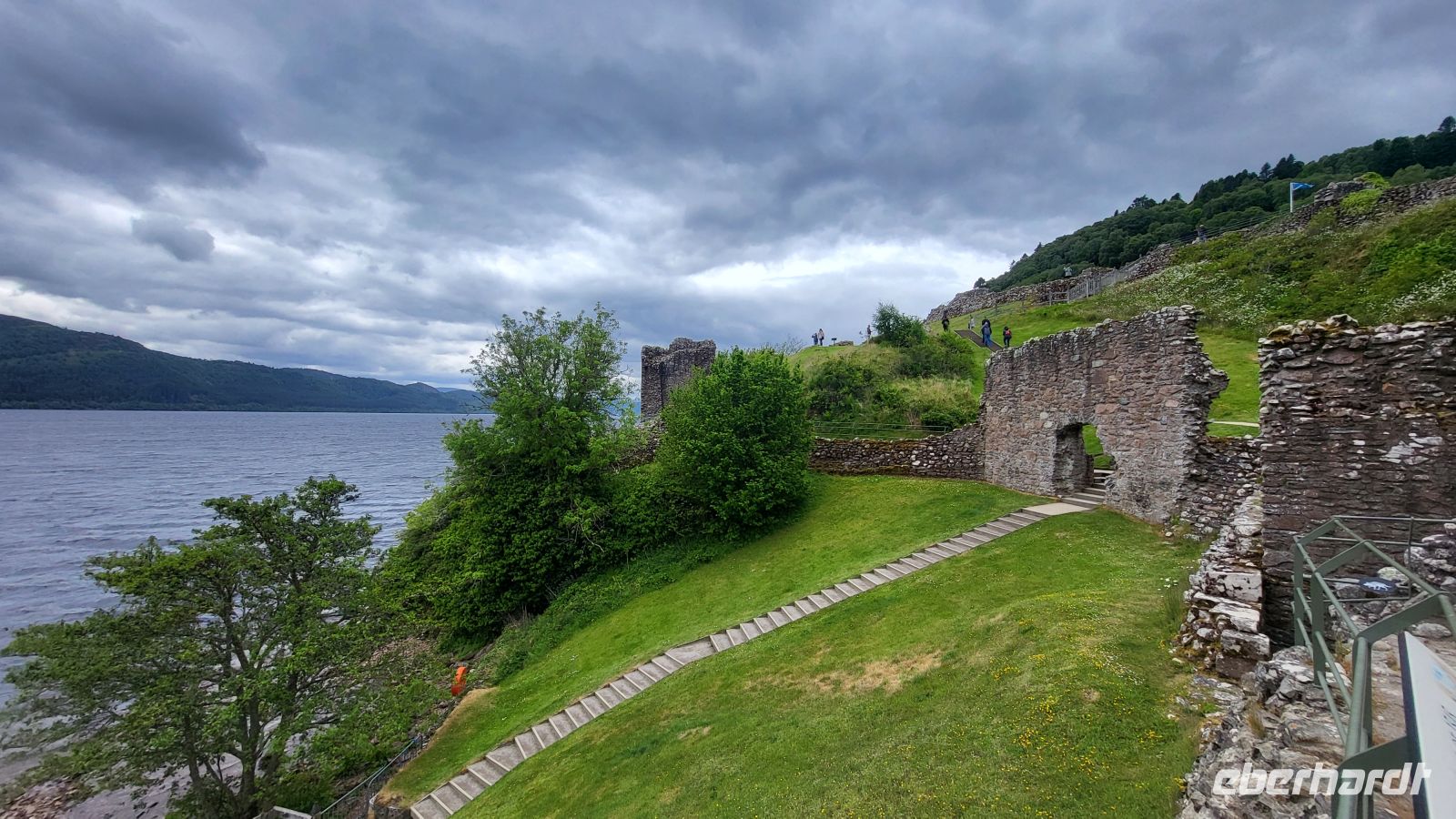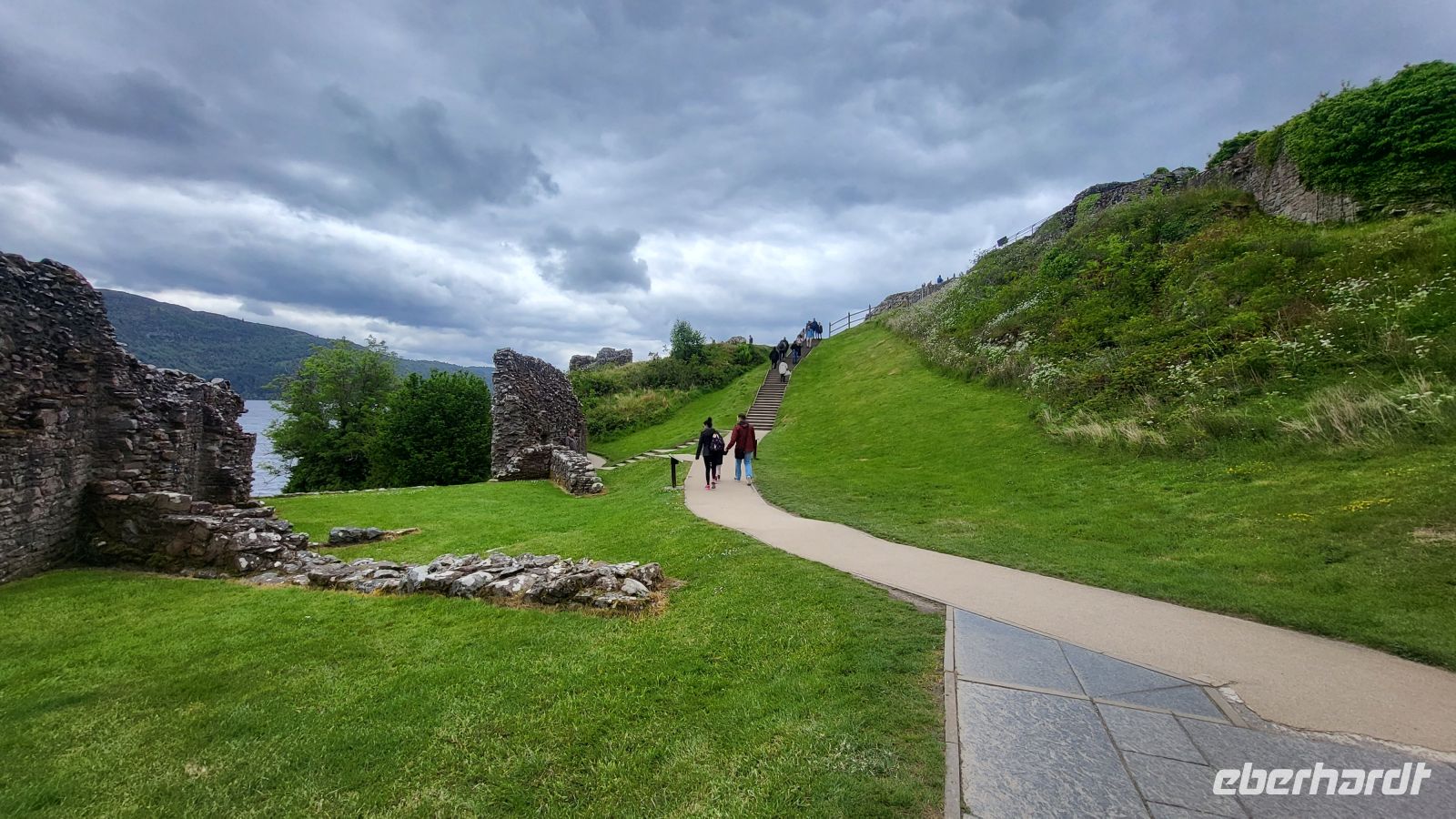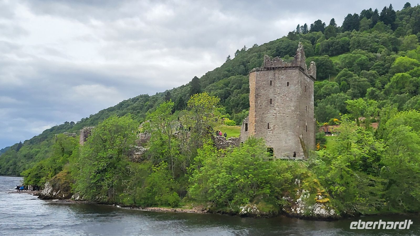 Die imposante Burgruine thront direkt am Ufer des Loch Ness. Bevor wir die Anlage betreten, sehen wir uns ein kurzes Informationsvideo an, das die dramatische Geschichte der Burg lebendig werden lässt – von königlichen Machtkämpfen über Clan-Kriege bis zu ihrer endgültigen Zerstörung im 17. Jahrhundert. Anschließend erkunden wir das Gelände auf eigene Faust: die Wachtürme, die mächtigen Mauern und die weiten Ausblicke auf den See. Das Wasser ist erstaunlich klar – aber gleichzeitig so tief und dunkel, dass es beinahe pechschwarz wirkt. Natürlich halten wir Ausschau nach Nessie, dem sagenumwobenen Seeungeheuer, aber leider zeigt sich das Ungeheuer heute nicht.
