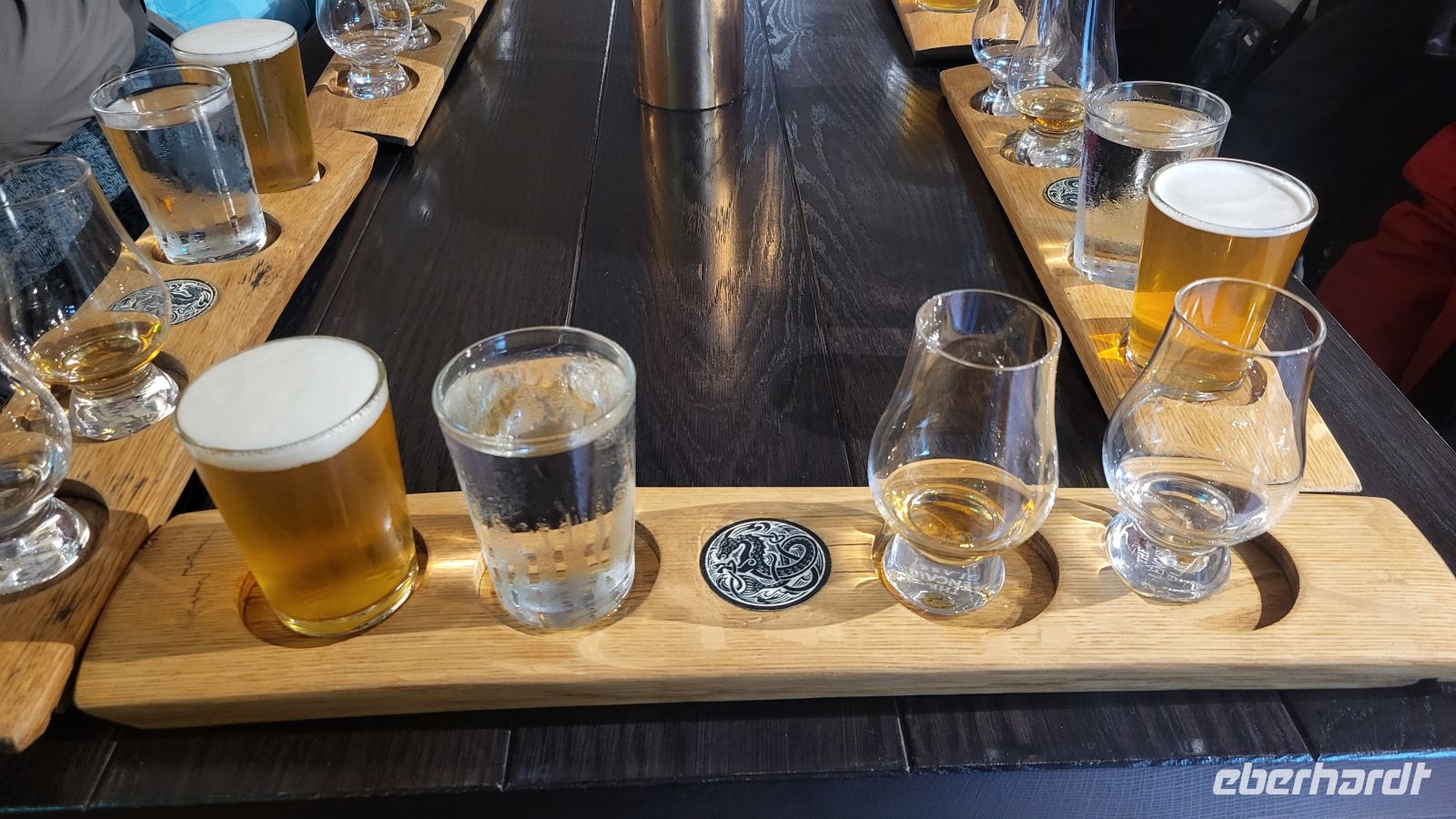Am Nachmittag erwartet uns ein besonderes Erlebnis: der Besuch einer „Brewstillery“ – einer Kombination aus Brauerei und Destillerie. Hier werden sowohl Bier gebraut als auch Whisky destilliert. Bei einer Führung erfahren wir viel über beide Herstellungsprozesse, von den Zutaten bis zur Reifung. Danach dürfen wir natürlich auch kosten – ein frisch gezapftes Bier und ein Schluck des hauseigenen Whiskys runden das Erlebnis ab.