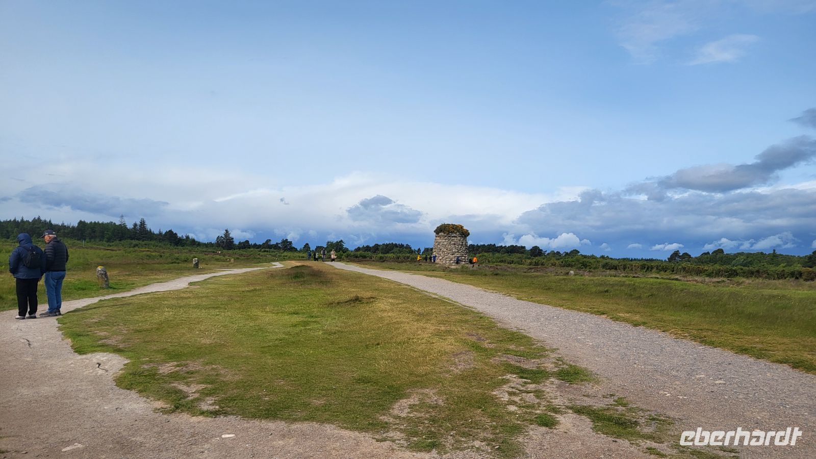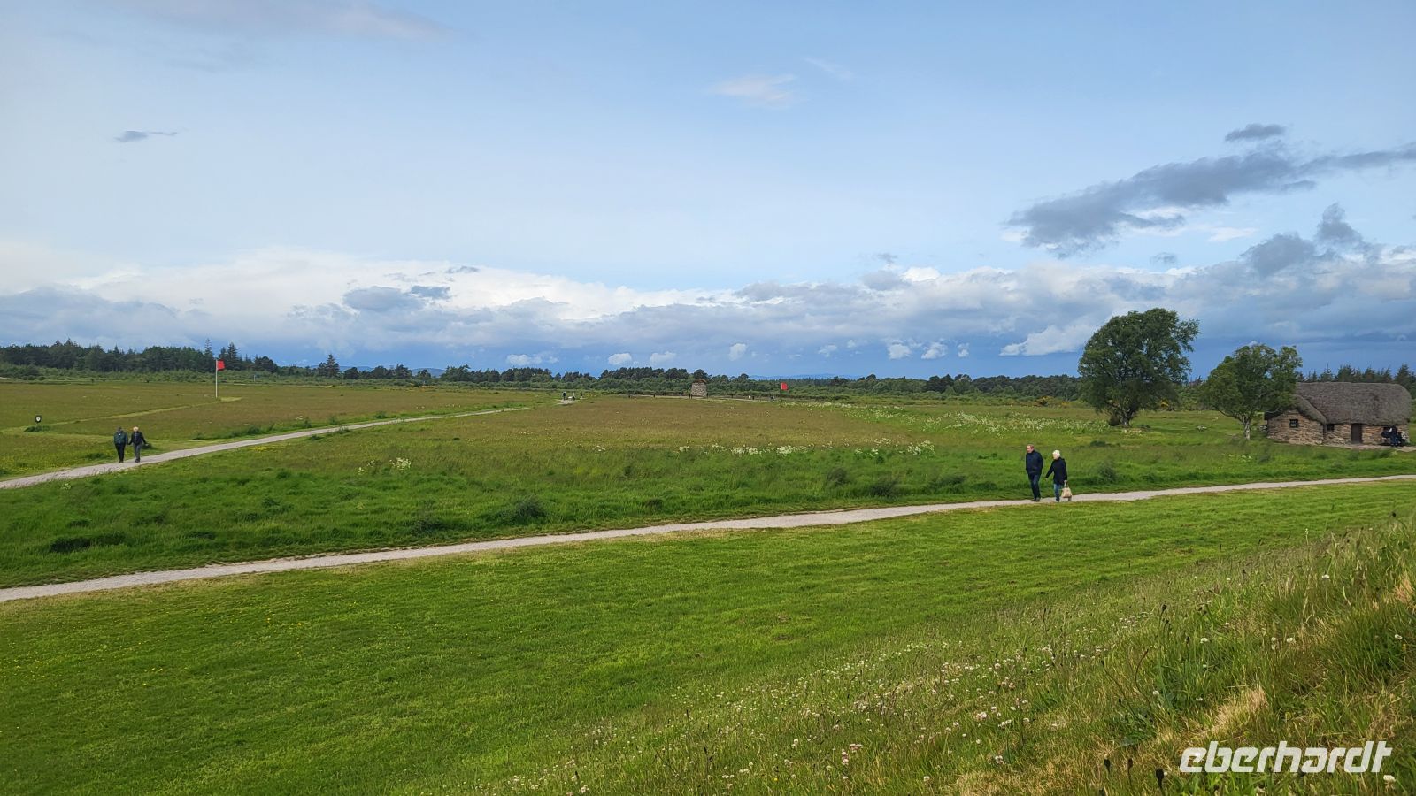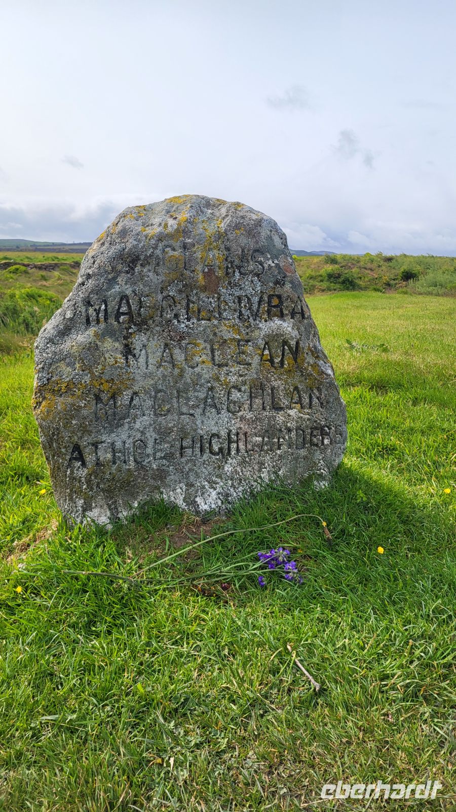 Draußen auf dem Gelände markieren Gedenksteine die Positionen der gefallenen Clans. Wir gehen entlang der ehemaligen Schlachtlinien, die eindrucksvoll mit Flaggen und Infotafeln dargestellt sind. Der Wind reißt an unseren Jacken, und es ist leicht, sich vorzustellen, wie kalt und chaotisch es damals hier gewesen sein muss.