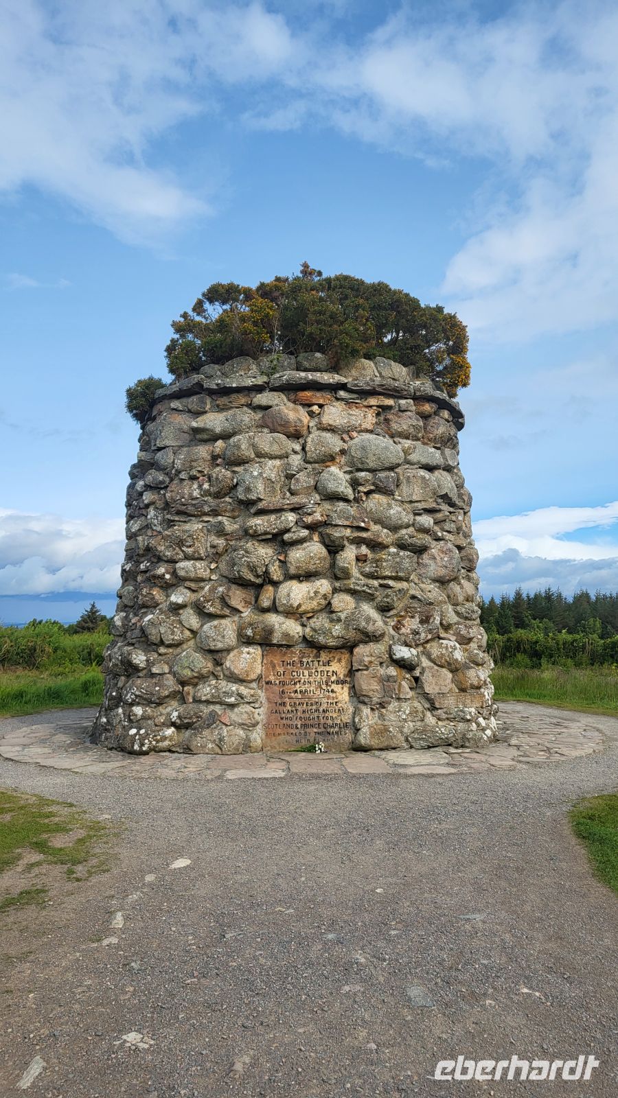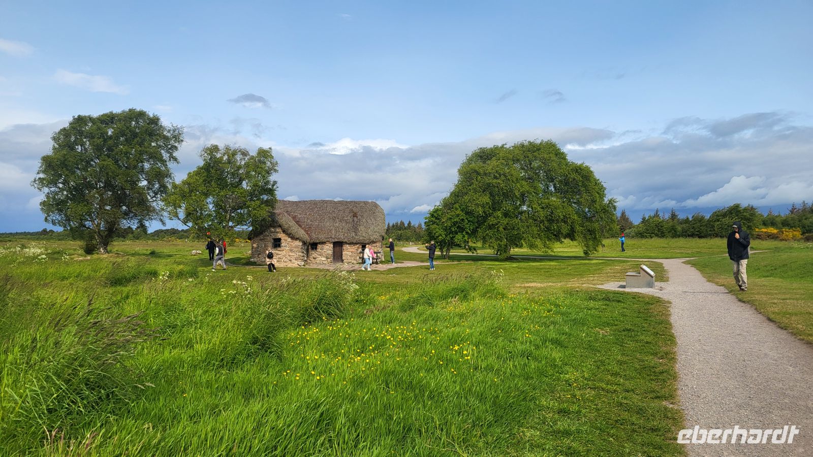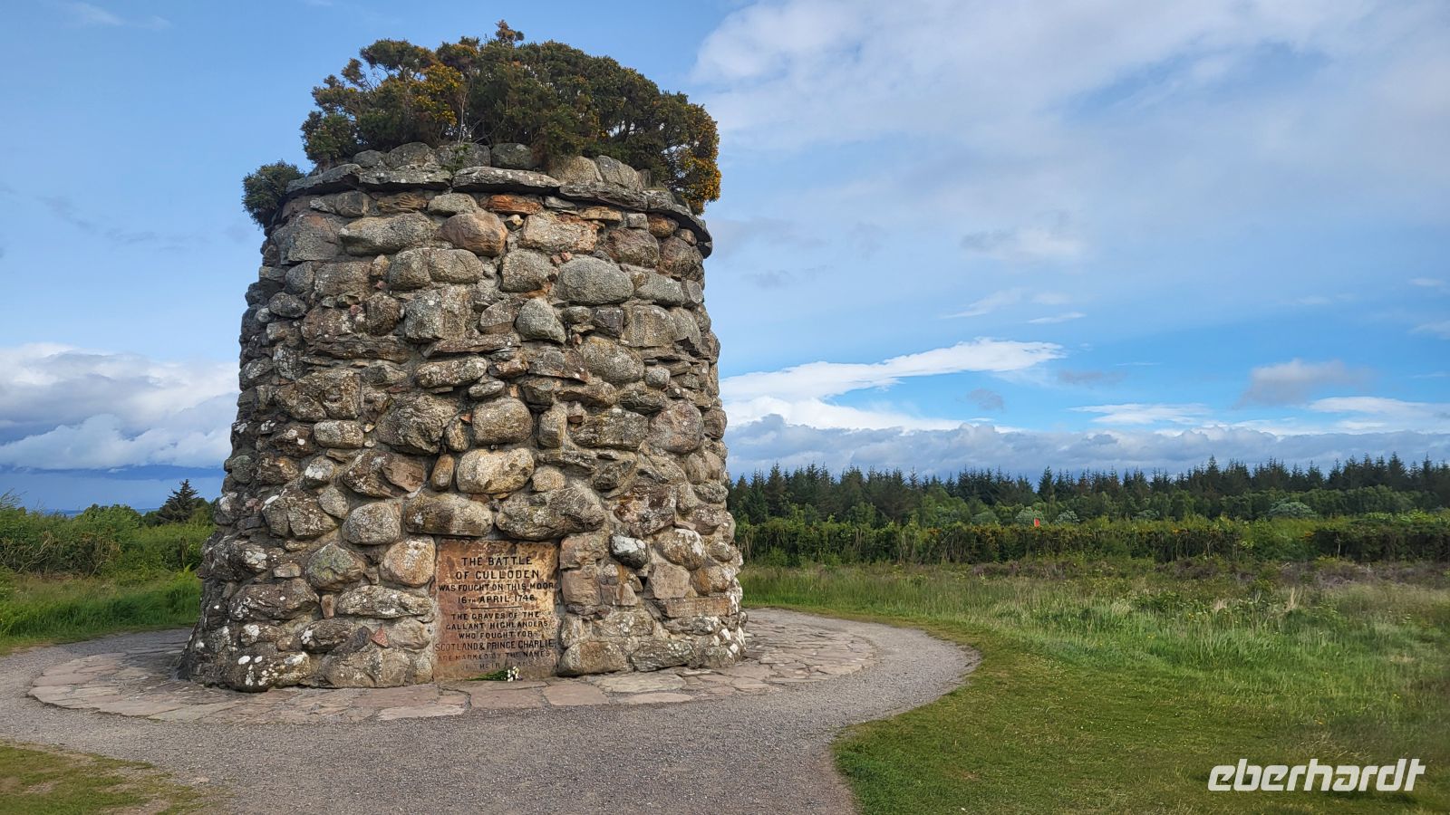 Draußen auf dem Gelände markieren Gedenksteine die Positionen der gefallenen Clans. Wir gehen entlang der ehemaligen Schlachtlinien, die eindrucksvoll mit Flaggen und Infotafeln dargestellt sind. Der Wind reißt an unseren Jacken, und es ist leicht, sich vorzustellen, wie kalt und chaotisch es damals hier gewesen sein muss.