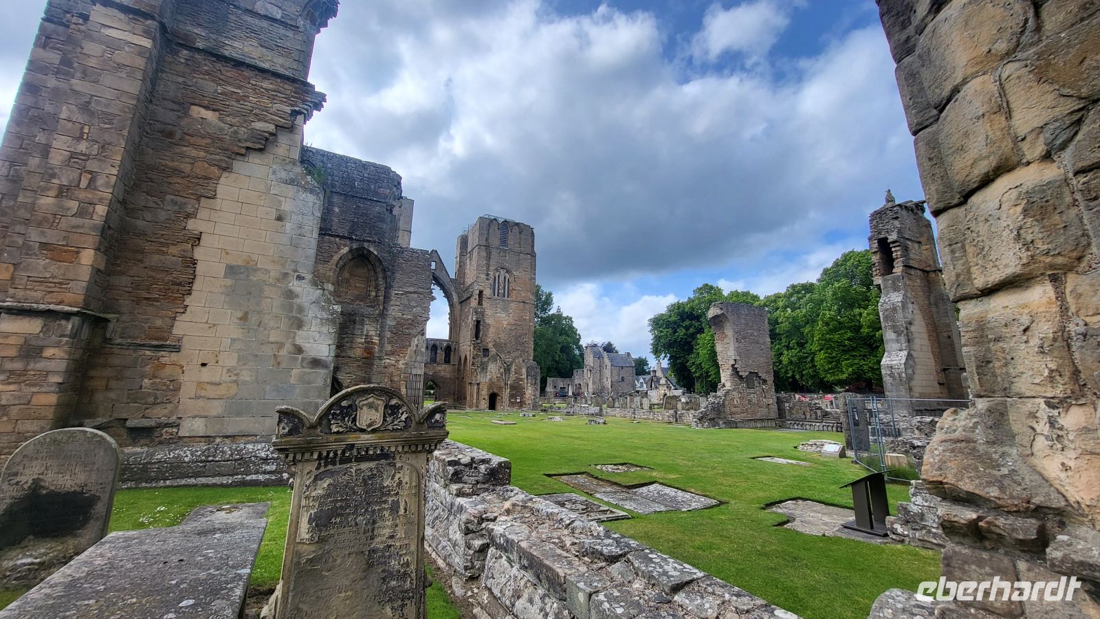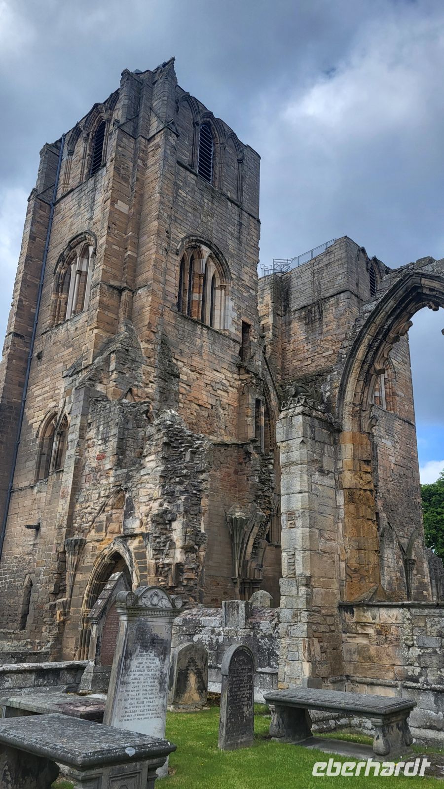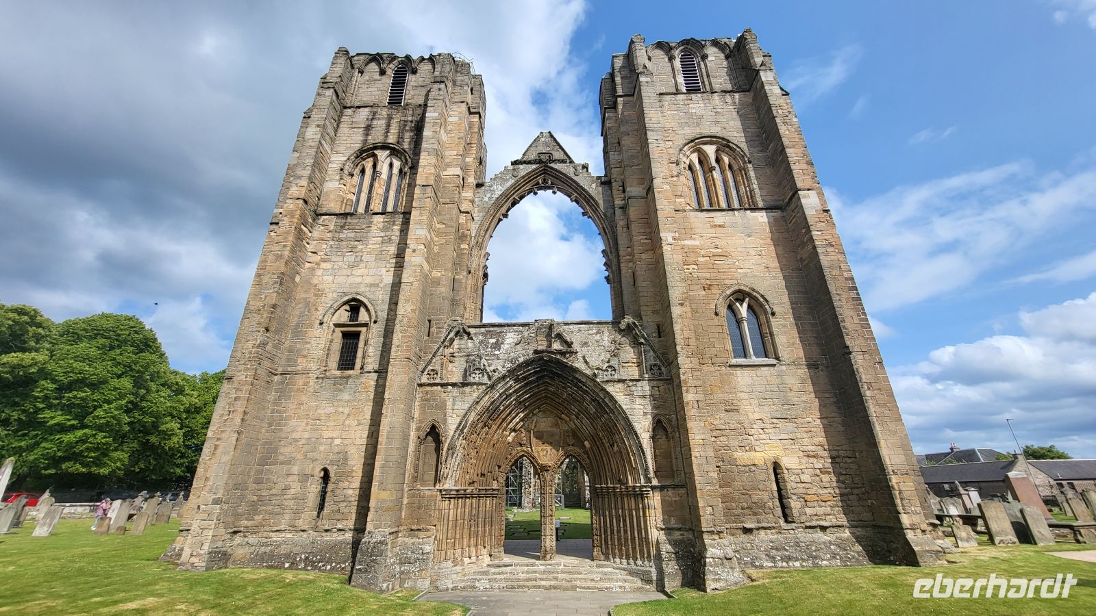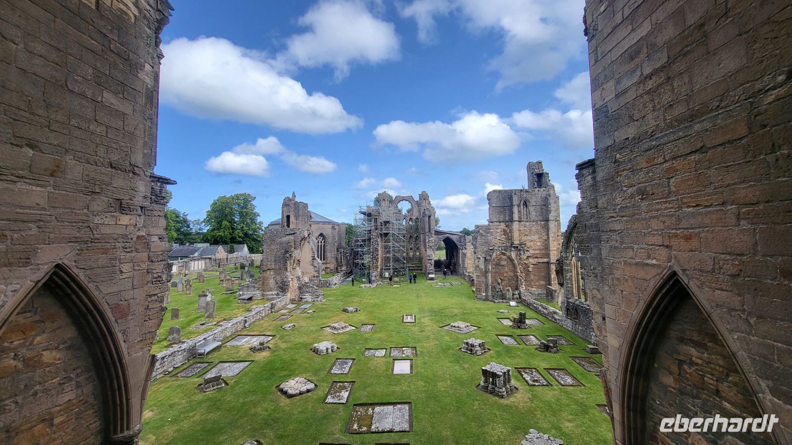 Am Nachmittag steht noch ein kleiner Abstecher zur Elgin Cathedral auf dem Programm. Wegen des starken Windes bleibt der Aussichtsturm heute geschlossen, aber das Gelände selbst lädt dennoch zu einem kurzen Rundgang ein. Einige Teile der Kathedrale sind überraschend gut erhalten – filigrane Fensterbögen, hohe Mauern und verzierte Pfeiler zeugen vom einstigen Glanz dieser „Lantern of the North“. Andere Bereiche sind nur noch als Grundmauern erkennbar, was der Ruine eine melancholische Schönheit verleiht.