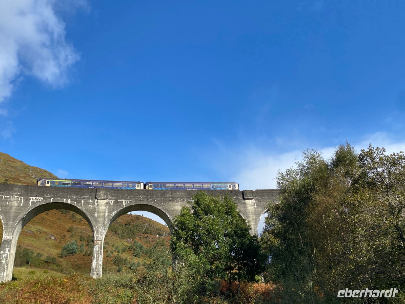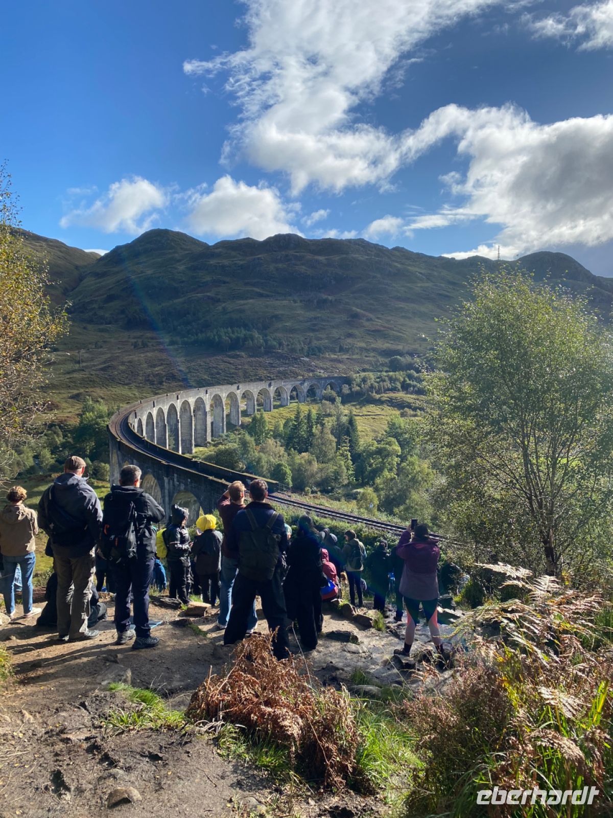 Die größte Attraktion hier ist mittlerweile eine, gewissermaßen literarische. Ein ganz besonderes Erlebnis erwartet uns nun. Obwohl – eigentlich warten wir bei herrlichem Wetter mit vielen begeisterten Menschen aus aller Welt auf einen ganz besonderen Zug, den Jacobite Steam Train. Dieser Dampfzug wurde als Hogwarts Express in den Harry-Potter-Filmen weltberühmt. Selbst wenn man der allergrößte Muggel wäre, muss man sagen, dass der Zug, den wir nun sehen, so wunderschön ist, wie das Viadukt, auf dem er fährt, beeindruckend ist!