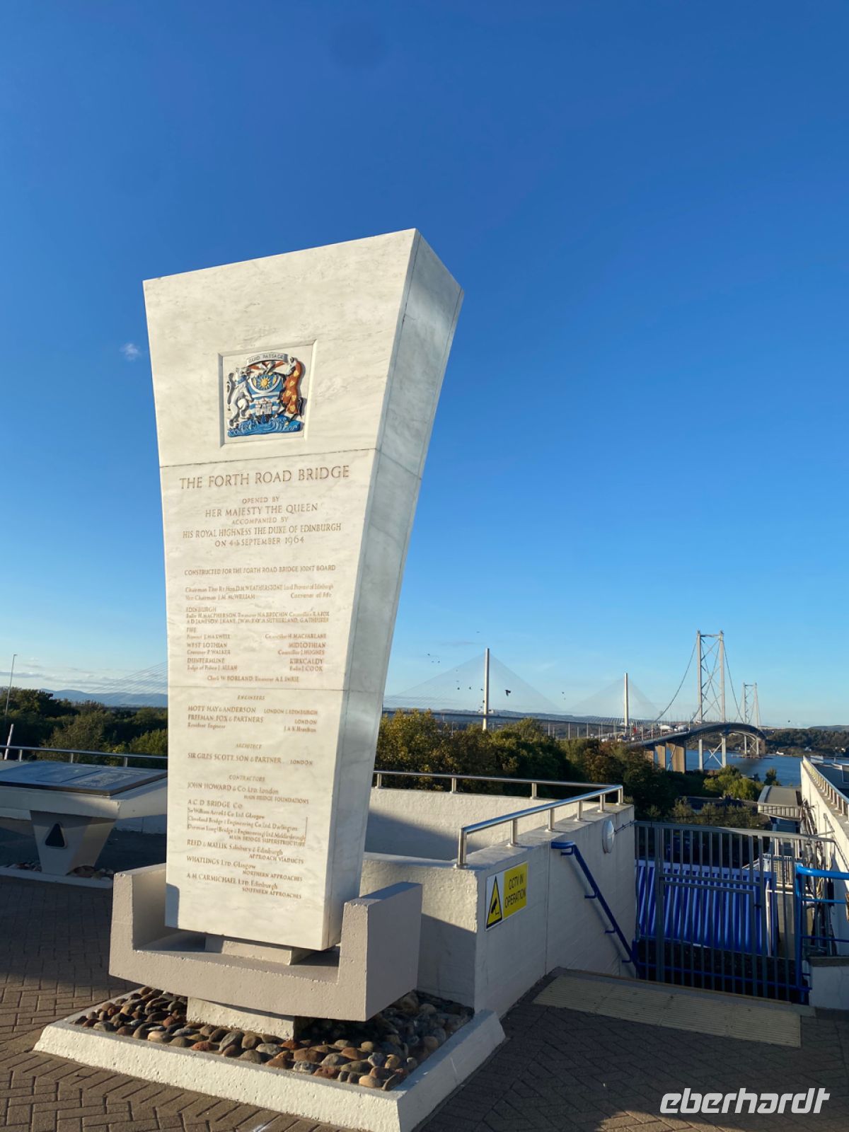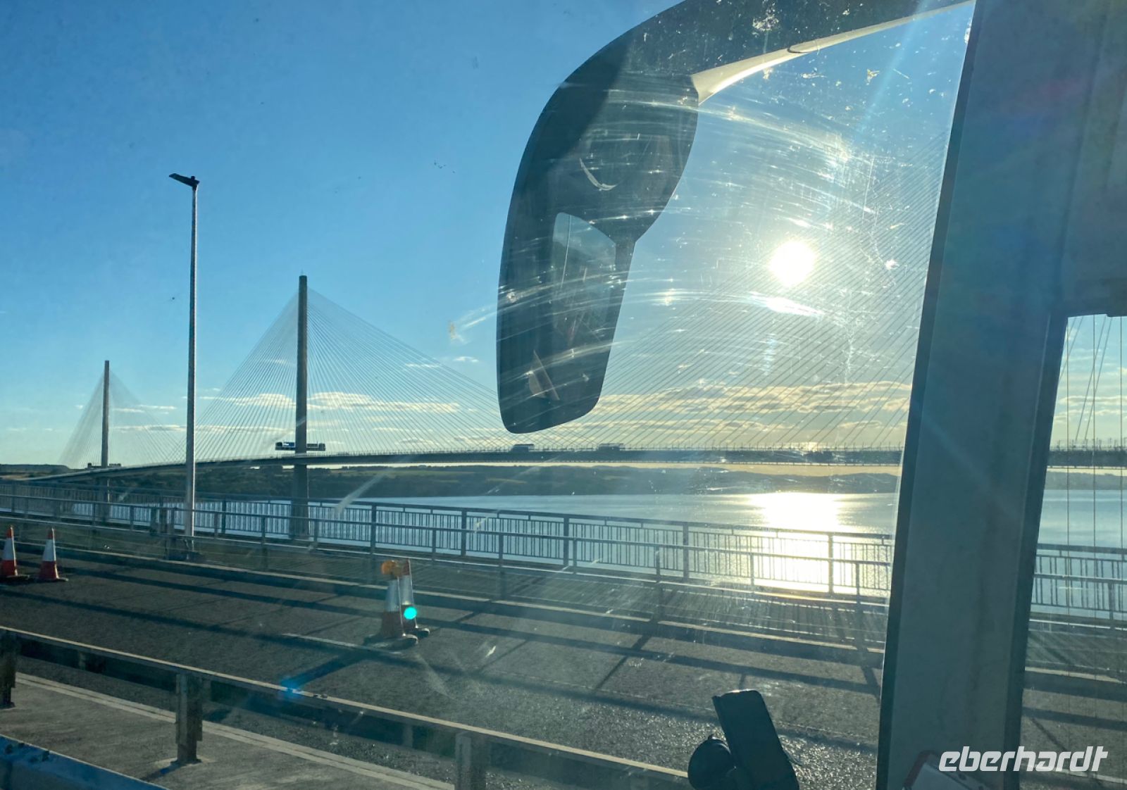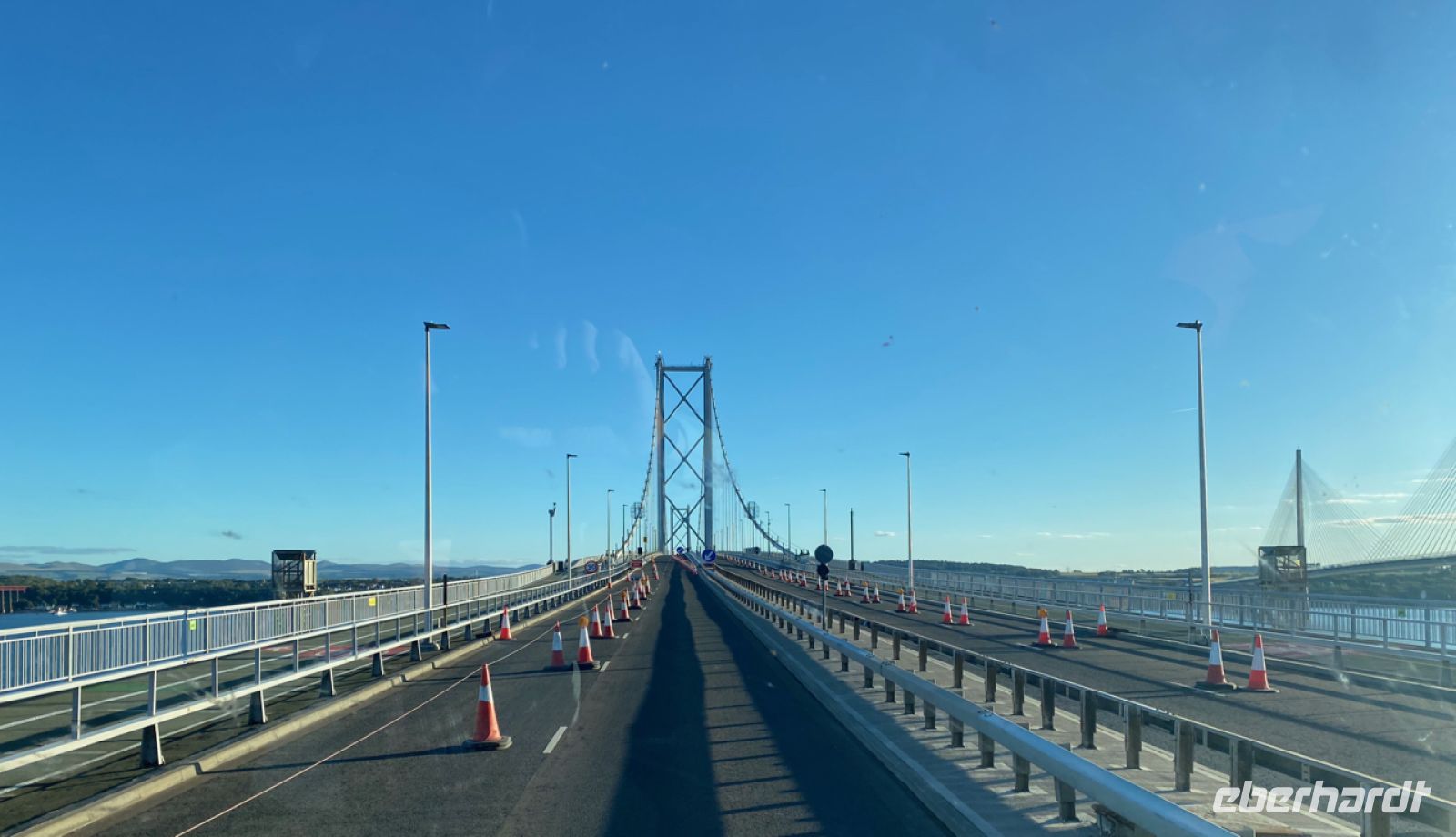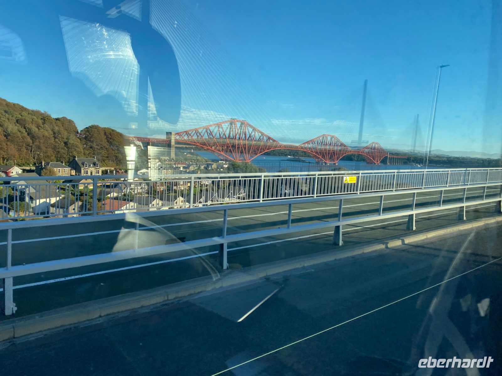 Bald schon erreichen wir den Firth of Forth, einen Fjord würde man das anderswo nennen. Hier überqueren drei gewaltige Brücken einen Meeresarm, die älteste davon, die Forth Bridge gilt zu Recht als eine der schönsten Eisenbahnbrücken der Welt. Wir dürfen über die ältere der Straßenbrücken fahren und sehen so alles von mittendrin, bevor wir noch einmal anhalten um zurückzublicken.