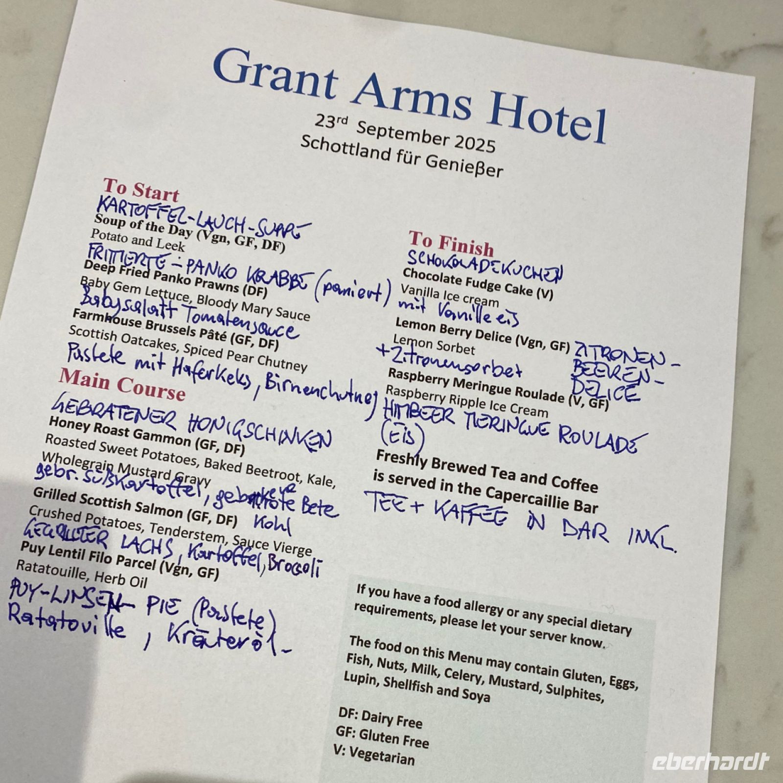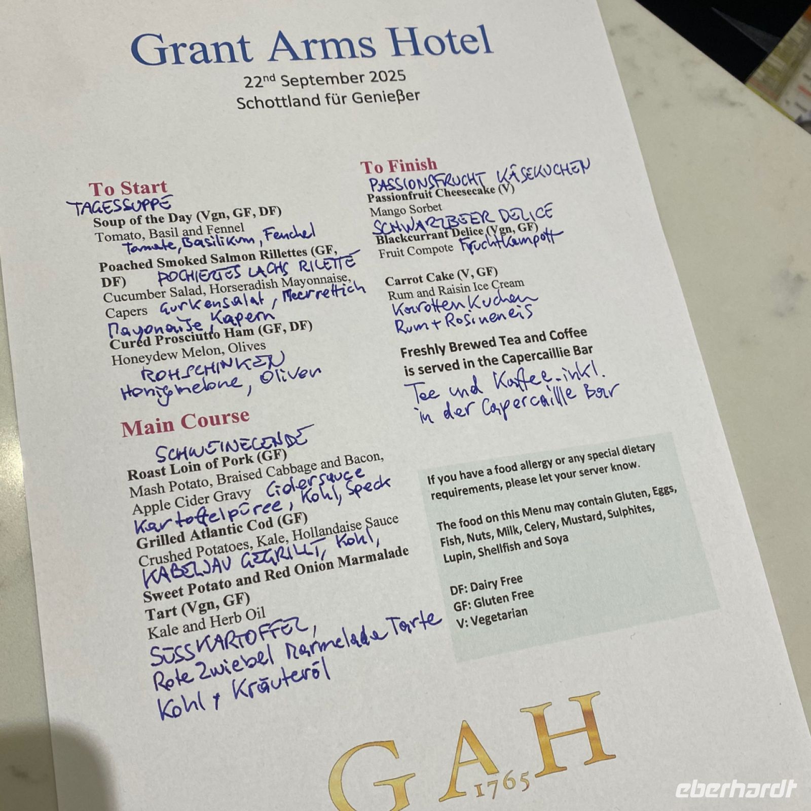 Nun aber, pünktlich zum Einsetzen leichten Nieselregens brechen wir dann zufrieden und beeindruckt auf – es geht wieder zurück nach Edinburgh. Zu unserem Abschlussessen in einem weiteren sehr angesagten und angesehenen Lokal lassen wir uns heute, es regnet mittlerweile in Strömen, sehr gerne mit lokalen Taxis hin- und zurückchauffieren.