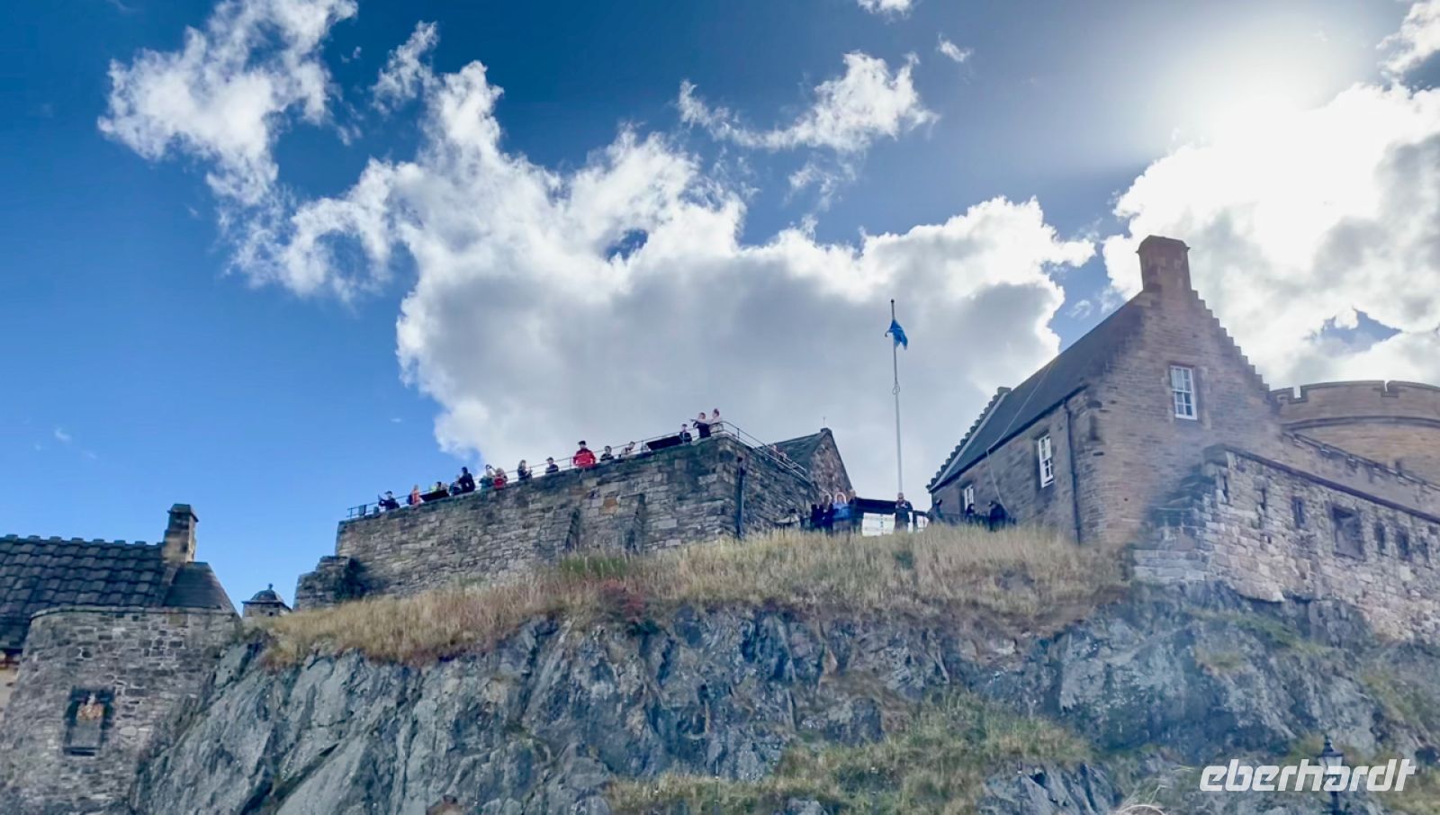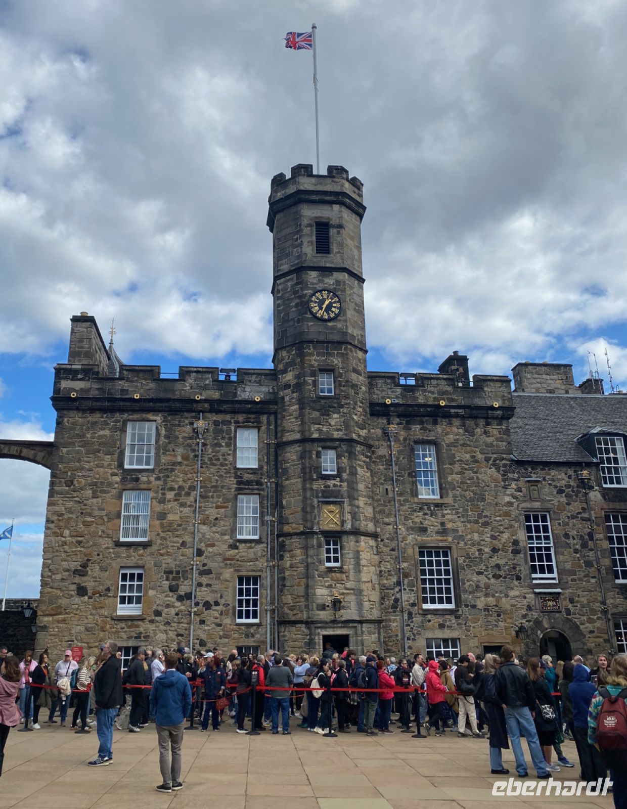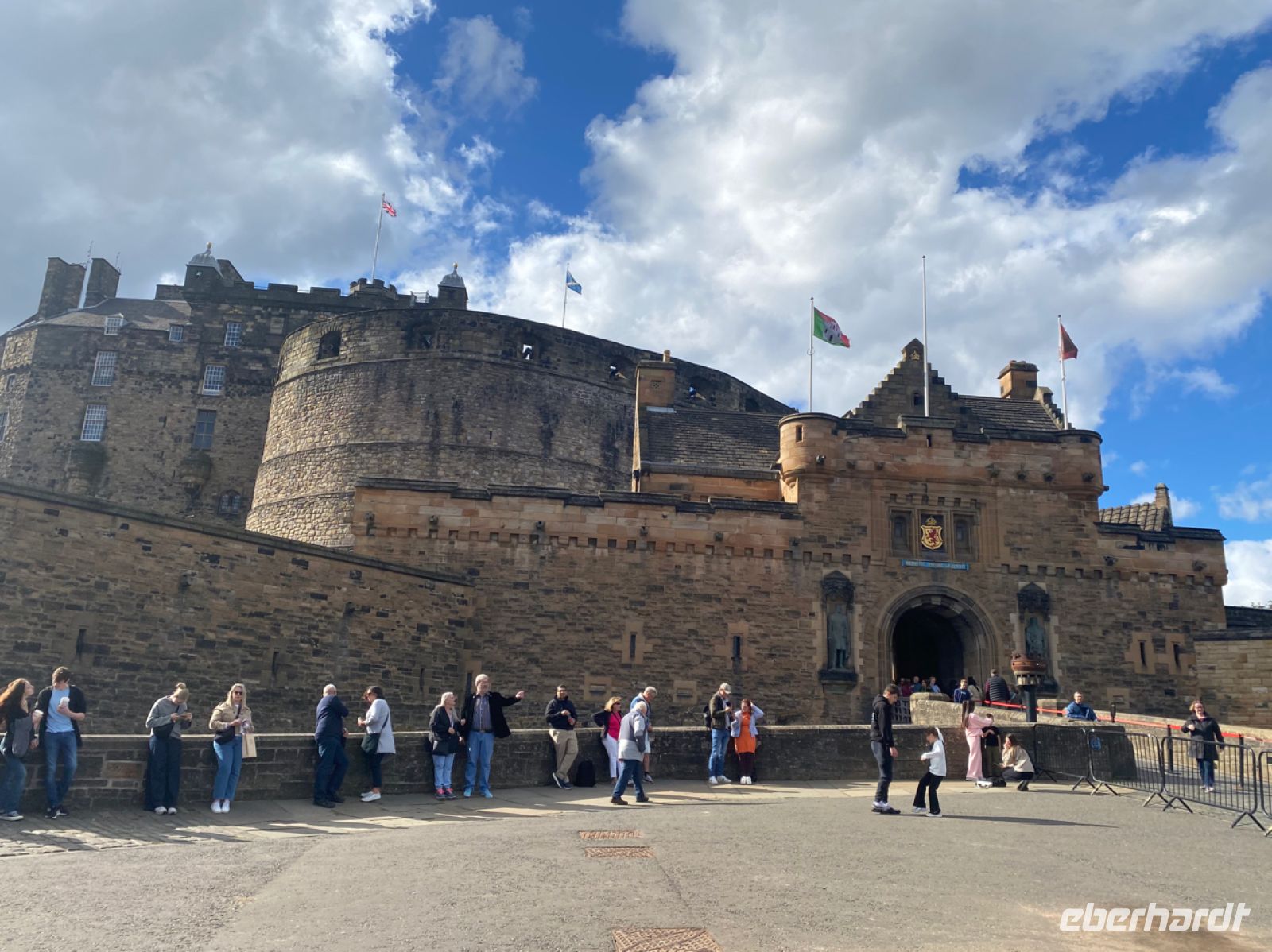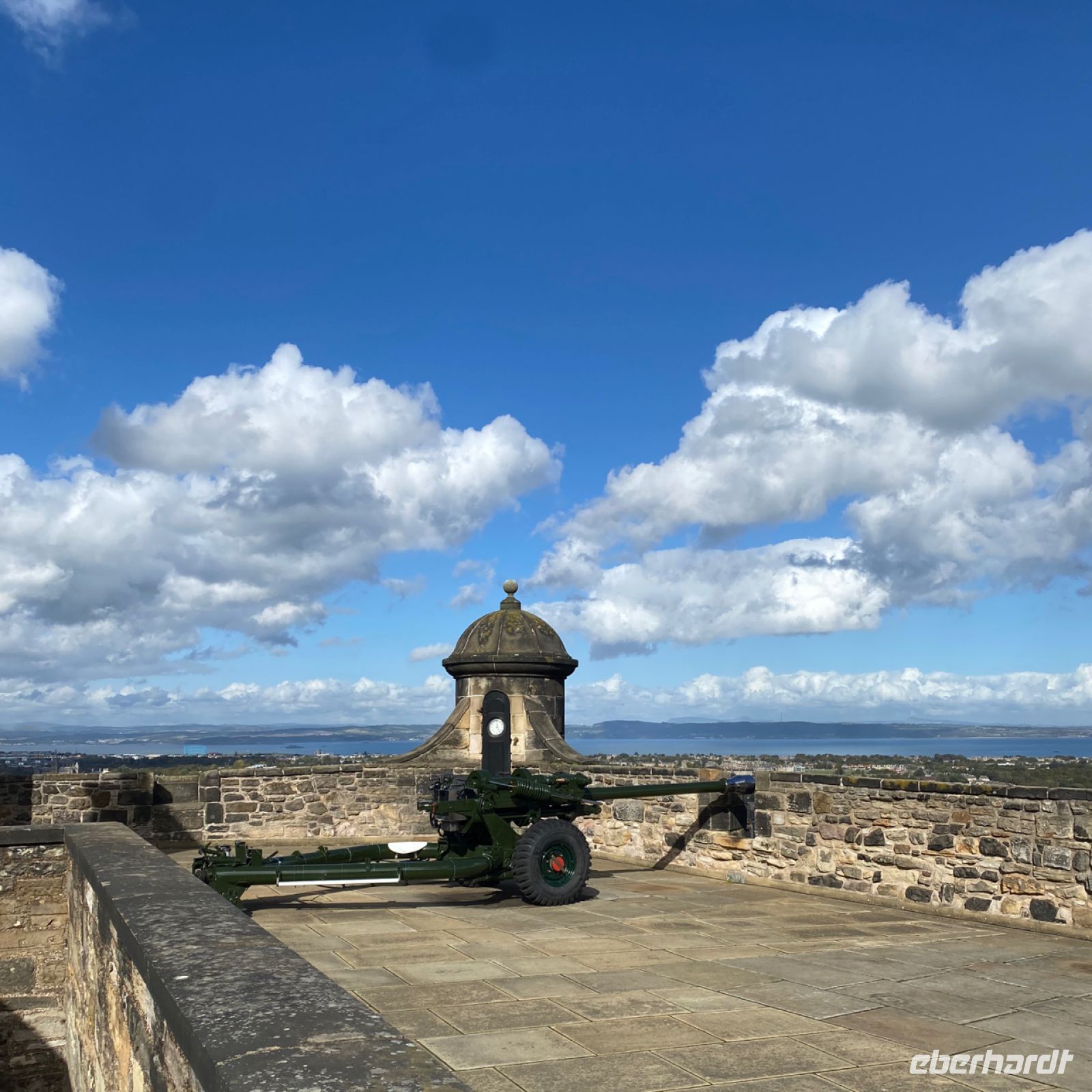 Hier heißt es nun Abschied nehmen von Beryl und dem Bus. Zu Fuß bummeln wir nun zur Esplanade wo wir Einlass in die mächtige Burg des Edinburgh Castle erhalten. Mit Audioguides, die neben Englisch und Gälisch auch Deutsch beherrschen bewaffnet dürfen wir nun die Burg mit ihren historischen Bauten und spektakulären Ausblicken erobern, jeder so wie er Lust hat. So mancher lässt es sich nicht nehmen und wartet gespannt auf das Abfeuern der Ein-Uhr-Kanone, das Schloss ist immer noch Standort der britischen Armee und das alte Zeitsignal für Seefahrer ist hier eine lang gepflegte Tradition. Die Wartezeit an den schottischen Kronjuwelen vergeht sehr kurzweilig und es bleibt noch viel Freizeit am Nachmittag.
