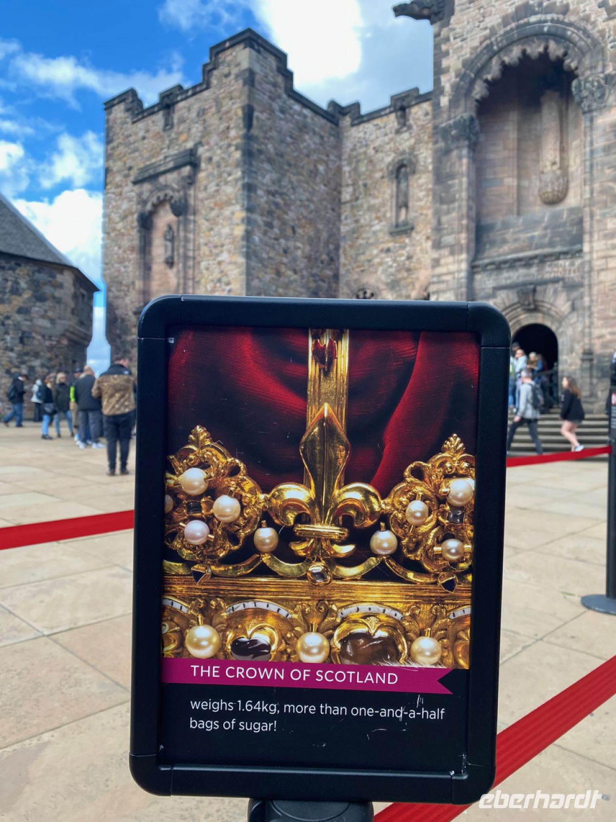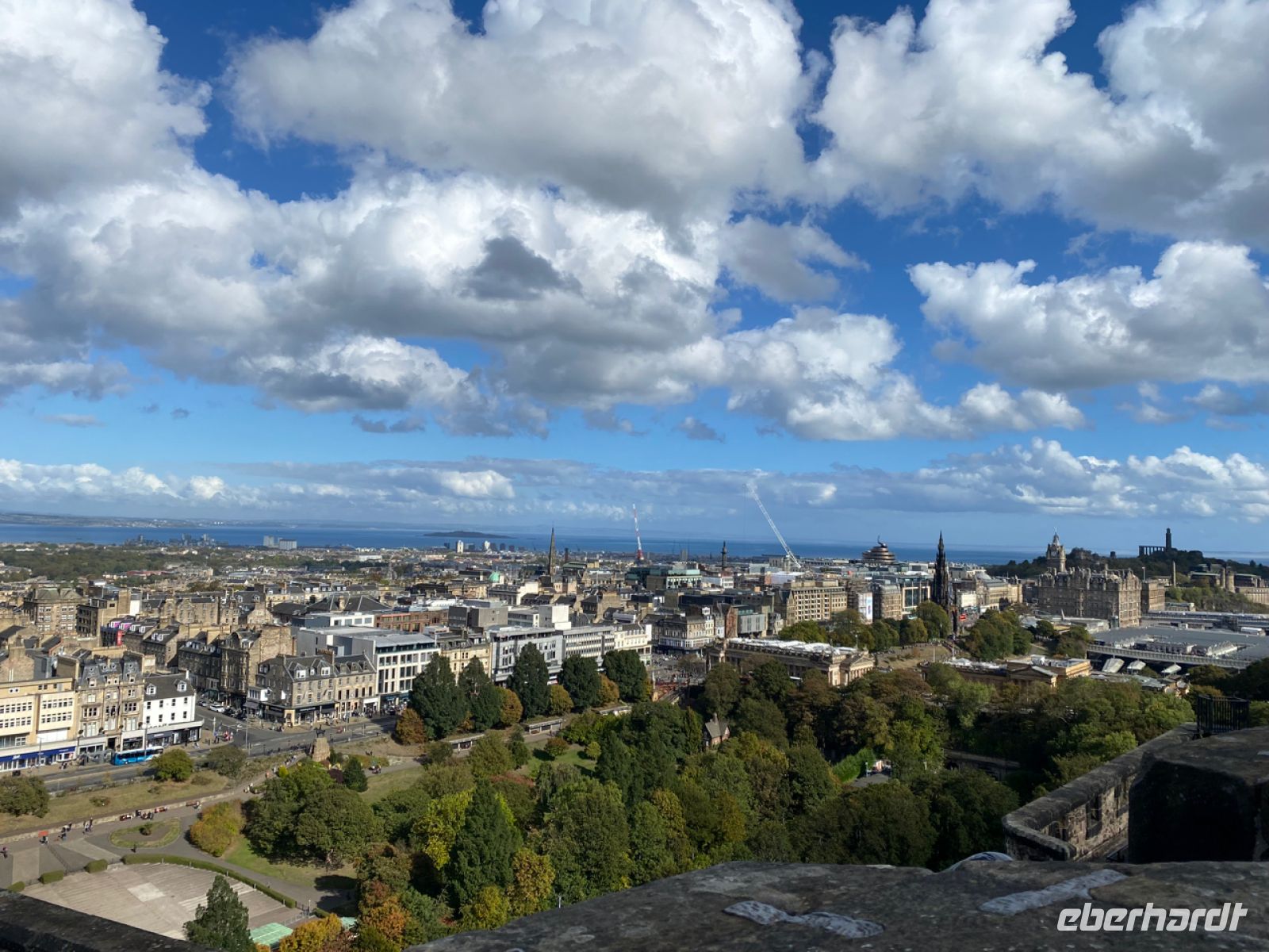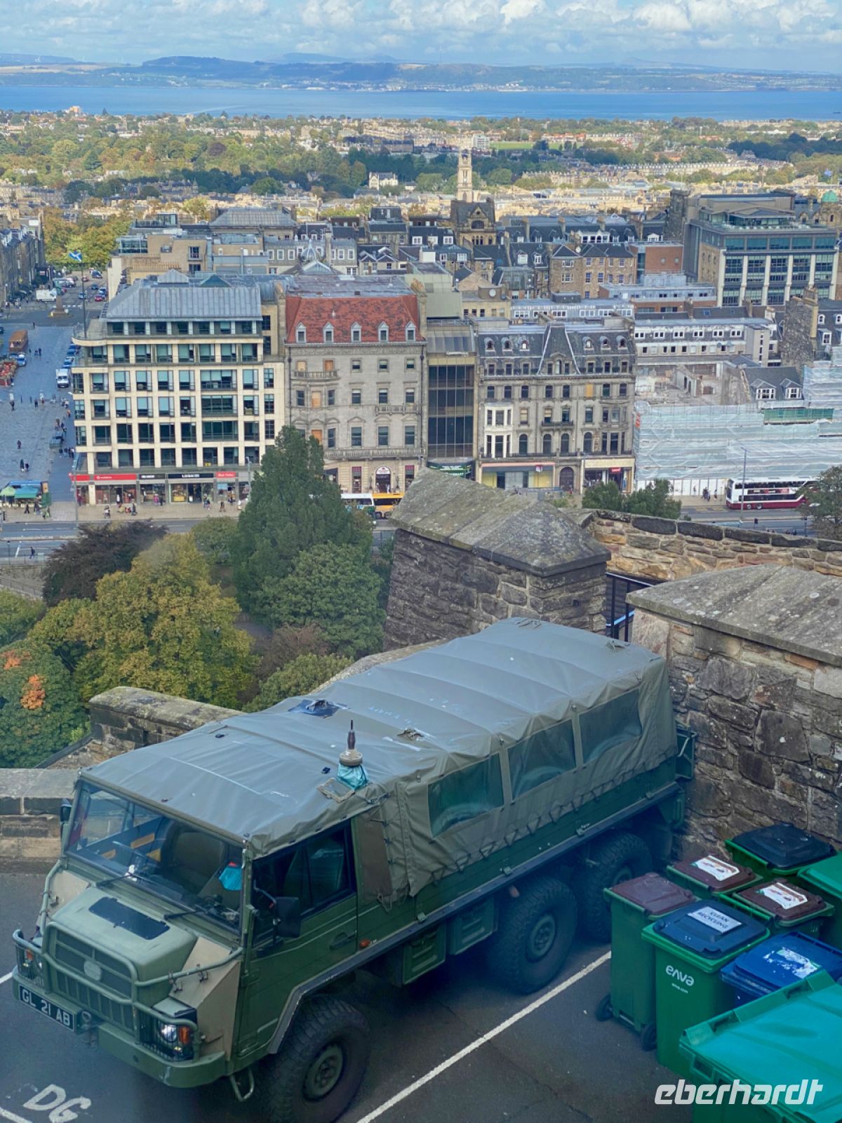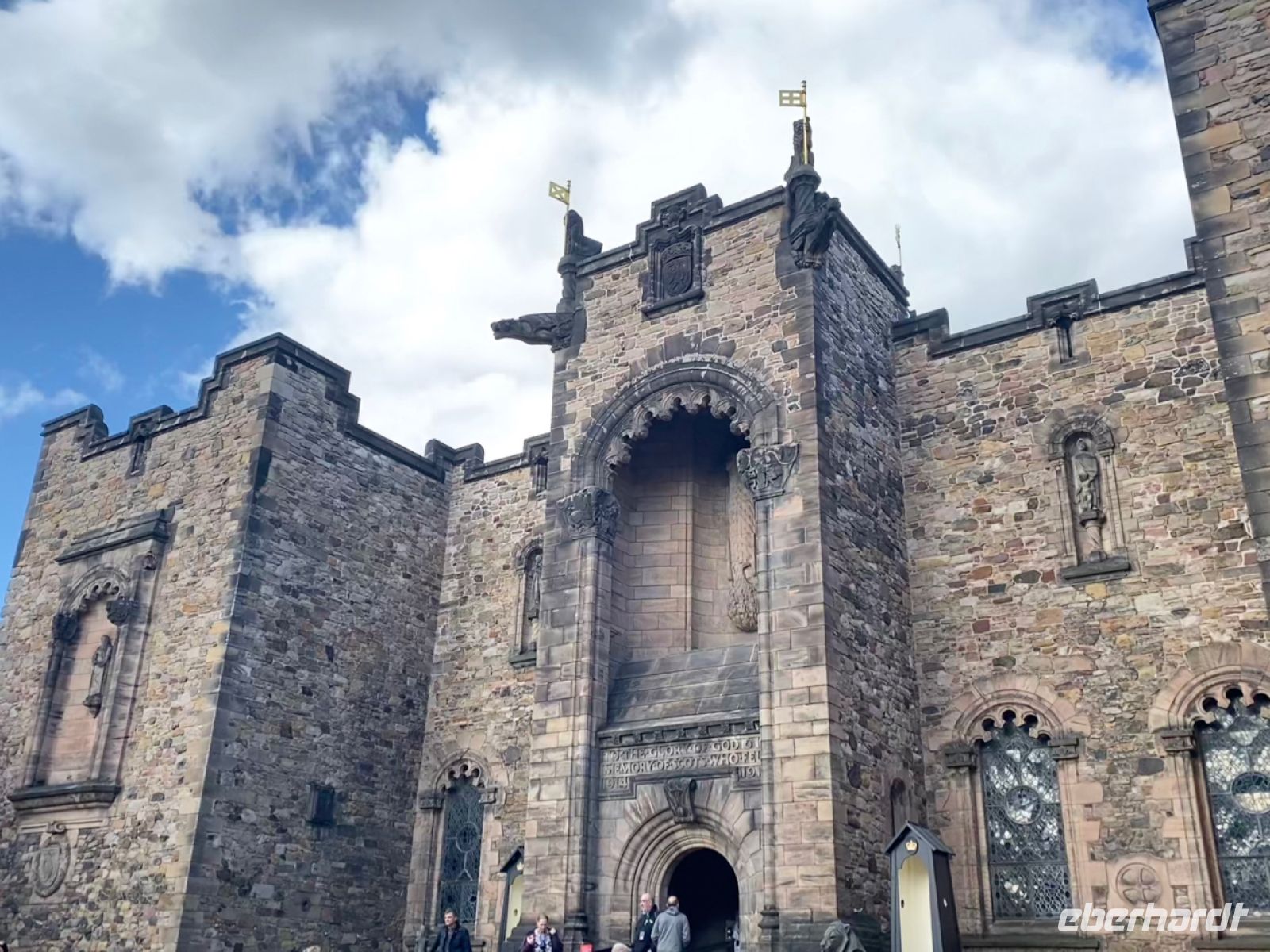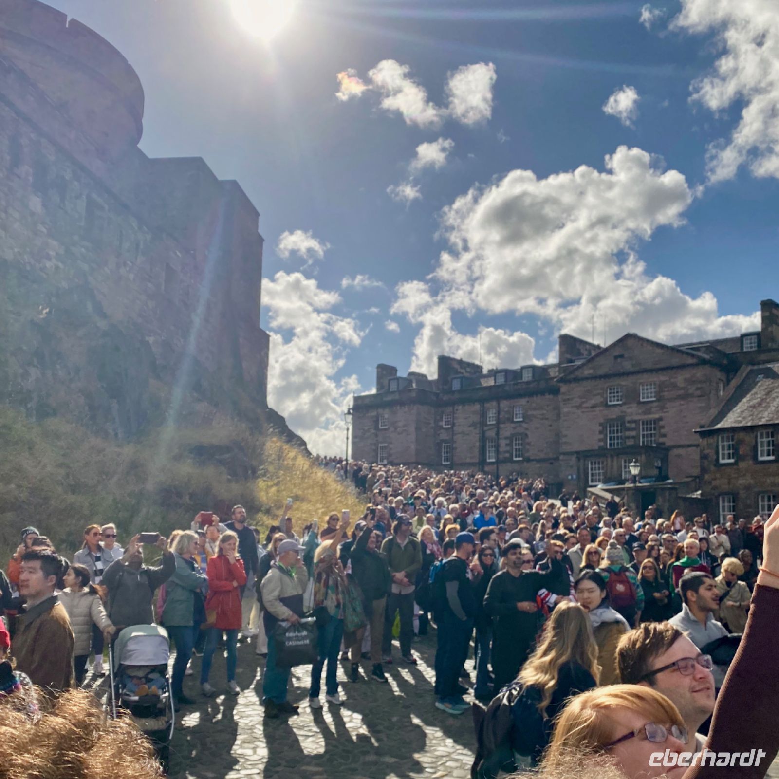 Hier heißt es nun Abschied nehmen von Beryl und dem Bus. Zu Fuß bummeln wir nun zur Esplanade wo wir Einlass in die mächtige Burg des Edinburgh Castle erhalten. Mit Audioguides, die neben Englisch und Gälisch auch Deutsch beherrschen bewaffnet dürfen wir nun die Burg mit ihren historischen Bauten und spektakulären Ausblicken erobern, jeder so wie er Lust hat. So mancher lässt es sich nicht nehmen und wartet gespannt auf das Abfeuern der Ein-Uhr-Kanone, das Schloss ist immer noch Standort der britischen Armee und das alte Zeitsignal für Seefahrer ist hier eine lang gepflegte Tradition. Die Wartezeit an den schottischen Kronjuwelen vergeht sehr kurzweilig und es bleibt noch viel Freizeit am Nachmittag.