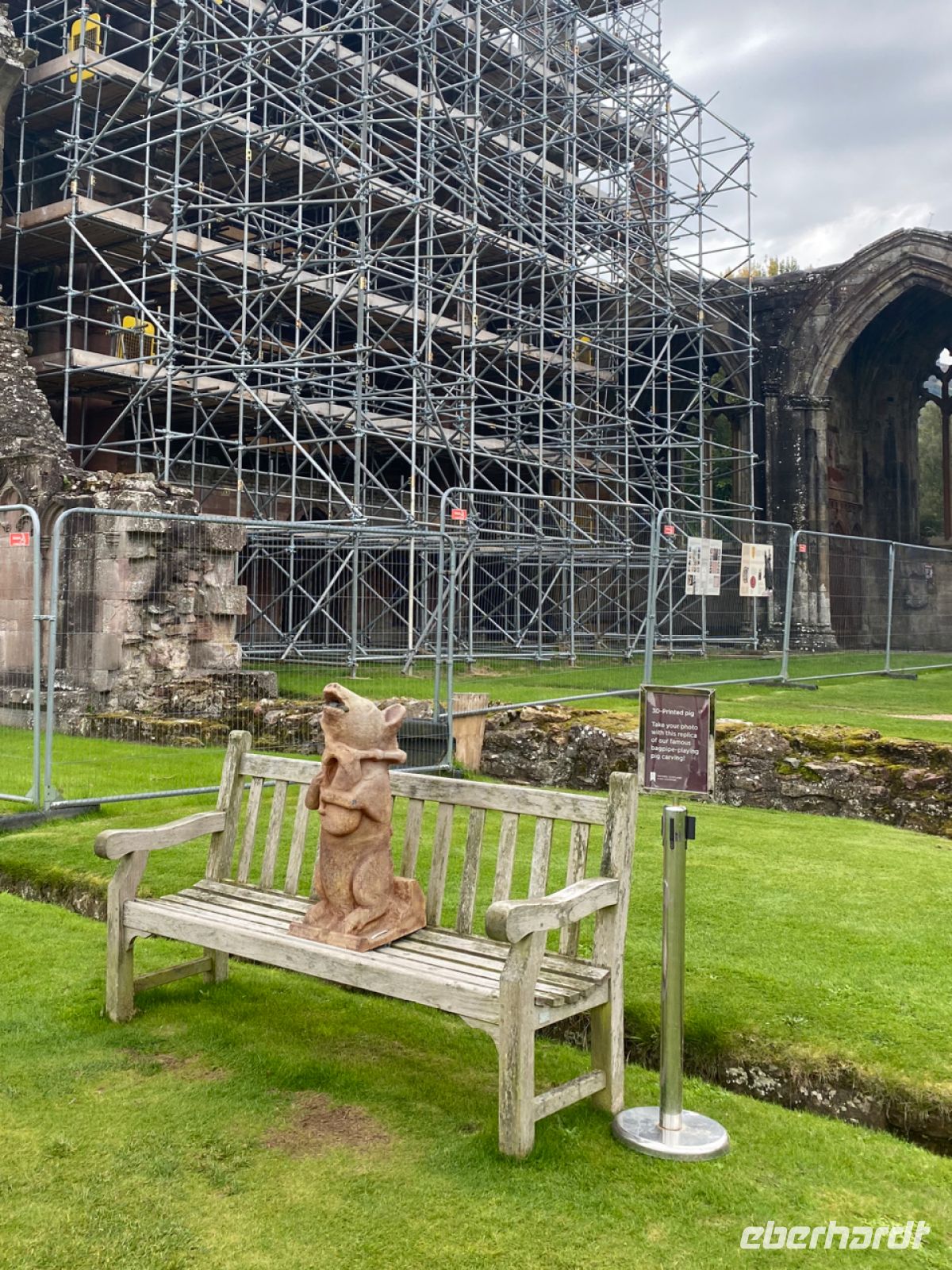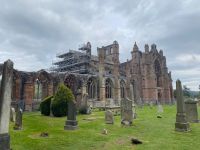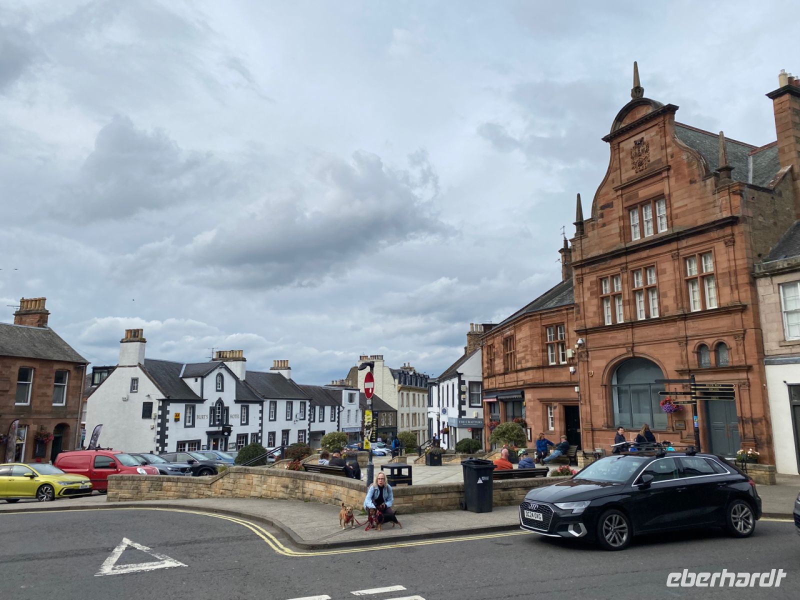 Einst gab es eine Handvoll wichtiger Abteien hier in der Umgebung, alle wurden sie Opfer kriegerischer Zeiten und unser nächster Besuch gilt der vielleicht bekanntesten von ihnen, der Melrose Abbey. Sie ist auch eine Ruine, wenn auch vollständiger erhalten. Trotz viel Mühe allerdings ist der Bau akut einsturzgefährdet und so sehen wir sie eingerüstet besseren Tagen entgegenwarten. Melrose ist auch ein schönes kleines Örtchen, hier lässt es sich noch angenehm die Mittagszeit verbringen, mit einem Imbiss oder einem Getränk in einem der urigen Pubs hier im Ort.