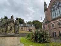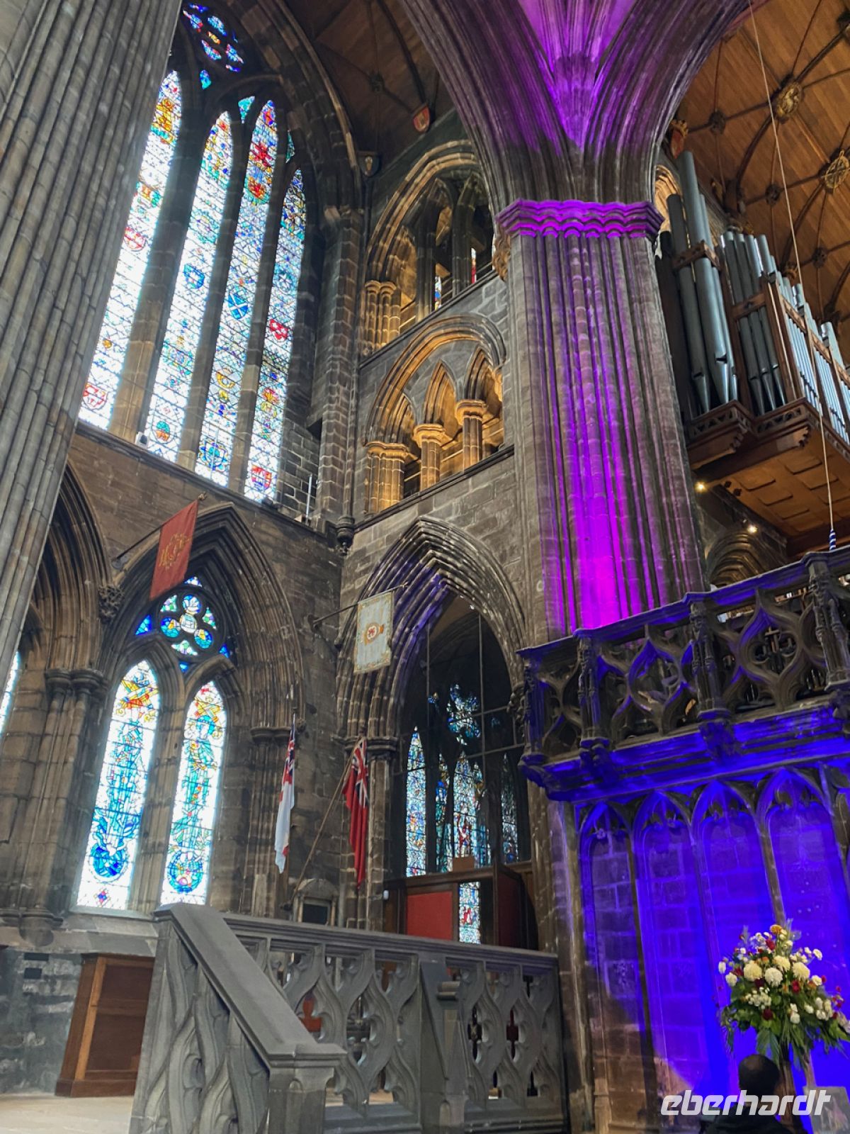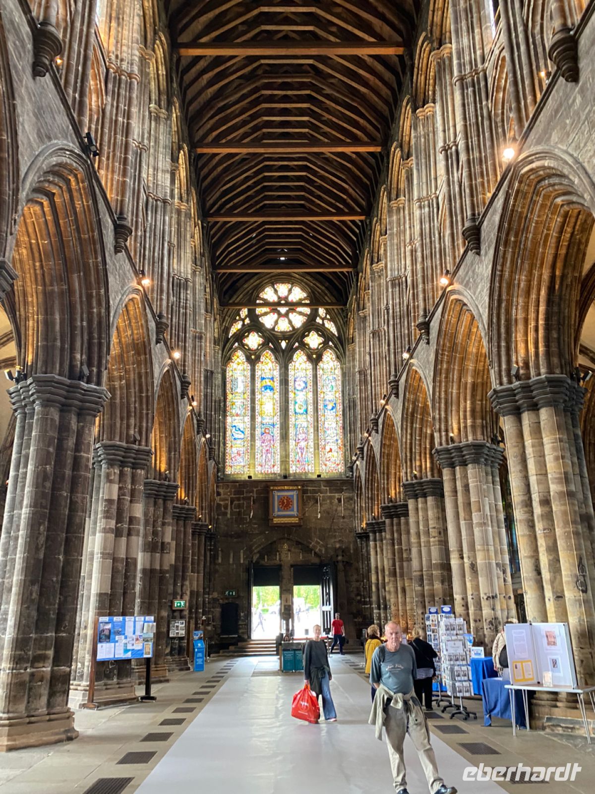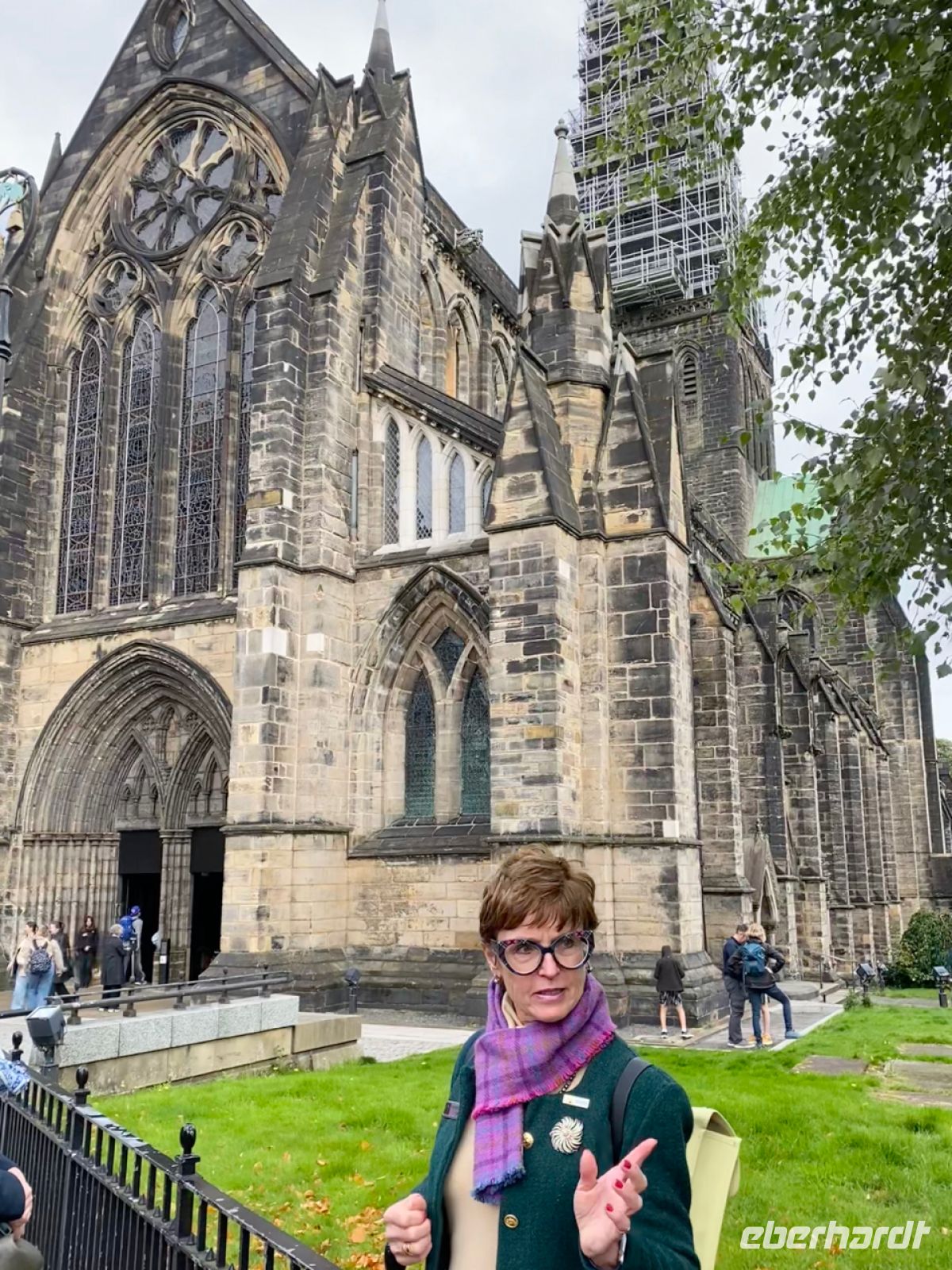 Mit unserem zuerst noch etwas ungewohnt spiegelverkehrten Bus geht es gleich zum Auftakt an eine der schönsten Stätten Schottlands, zur gotischen Kathedrale St. Mungo, benannt nach dem ersten Bischof der Stadt. Hier treffen wir Jutta, unsere Stadtführerin, die uns Schottlands größte Stadt auf eine sehr interessante und kurzweilige Art näherbringt.