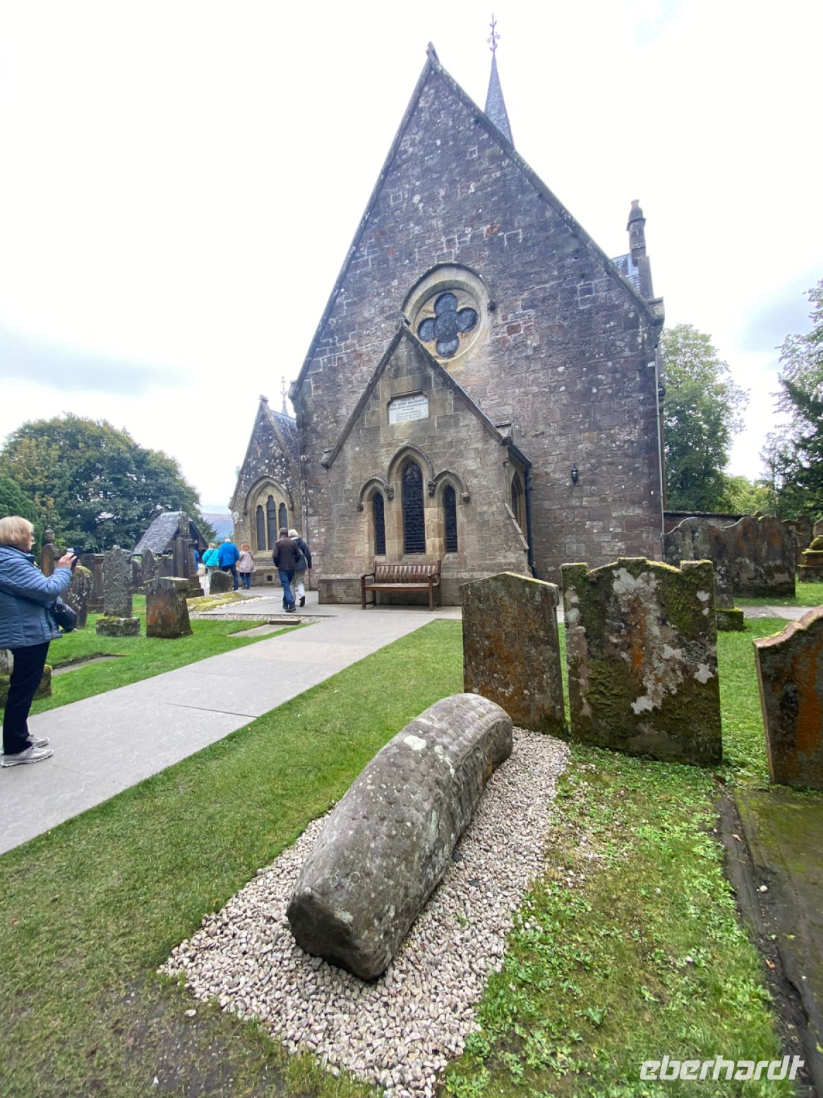 Wir verlassen nun Strathclyde, das weite Tal des Clyde, und folgen dem Fluss Leven in die nahe Berglandschaft des sagenhaften schottischen Hochlands, in die Highlands. Nach kurzer malerischer Fahrt erreichen wir schnell den See Loch Lomond und dort das malerische Örtchen Luss. Dunkle Arbeiterhäuser aus Stein prägen den Ort und strahlen heutzutage als romantische Cottages in prächtigen Gärten. Eine romantische kleine Kirche mit einer bewegenden Geschichte liegt direkt am See, wir werden dort von freundlichen Menschen mit Keksen willkommen geheißen und lassen die Atmosphäre auf uns wirken.