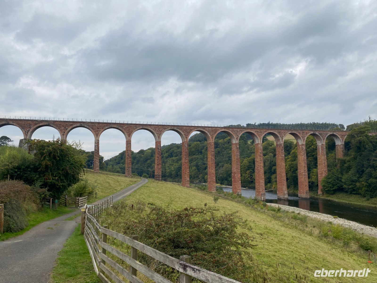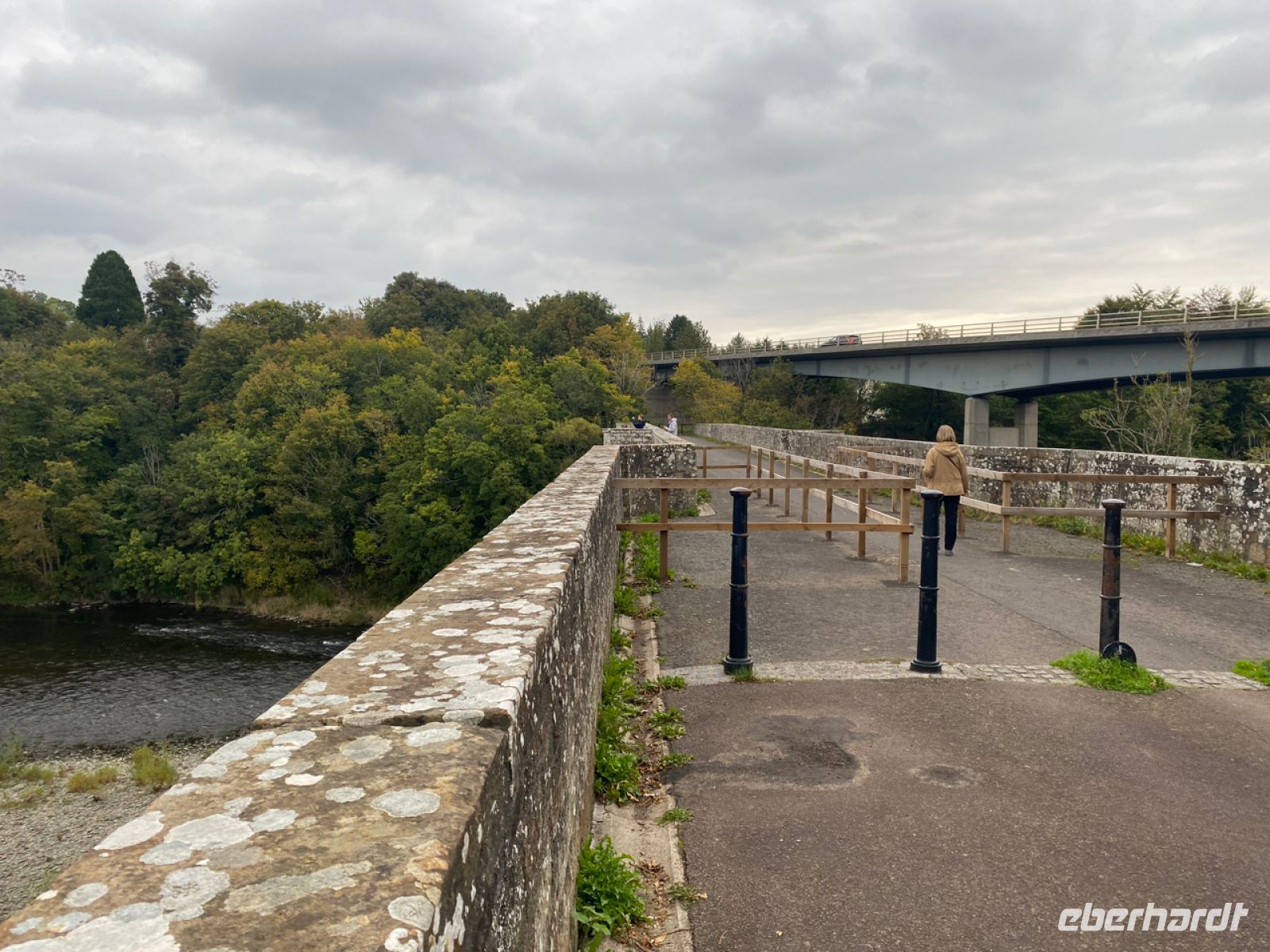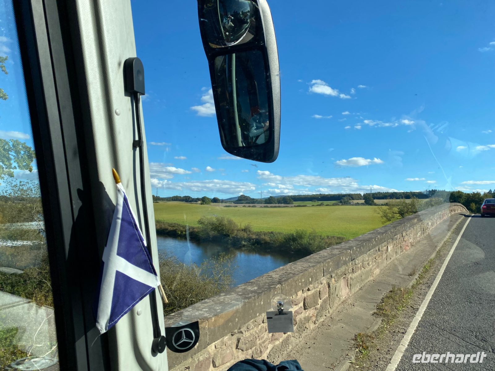 Soviel Stadtleben sind wir fast nicht mehr gewohnt, sagen einige schon lachend, wie passend, dass es heute wieder aufs Land geht! Wir lernen nun auch noch die Borders kennen, Schottlands südliche Region, schon an der Grenze zu England liegend. Hier gibt es den bekannten Fluss Tweed, von dessen Ufern der gleichnamige hochwertige Stoff stammt. Im Tal des Flusses ließen sich schon die Römer nieder, an einer ihrer alten Brücken entstanden drei Nachfolgebauten, die langweilige überfahren wir, die zwei spannenden historischen bestaunen wir bei unserem ersten Besichtigungsstopp.